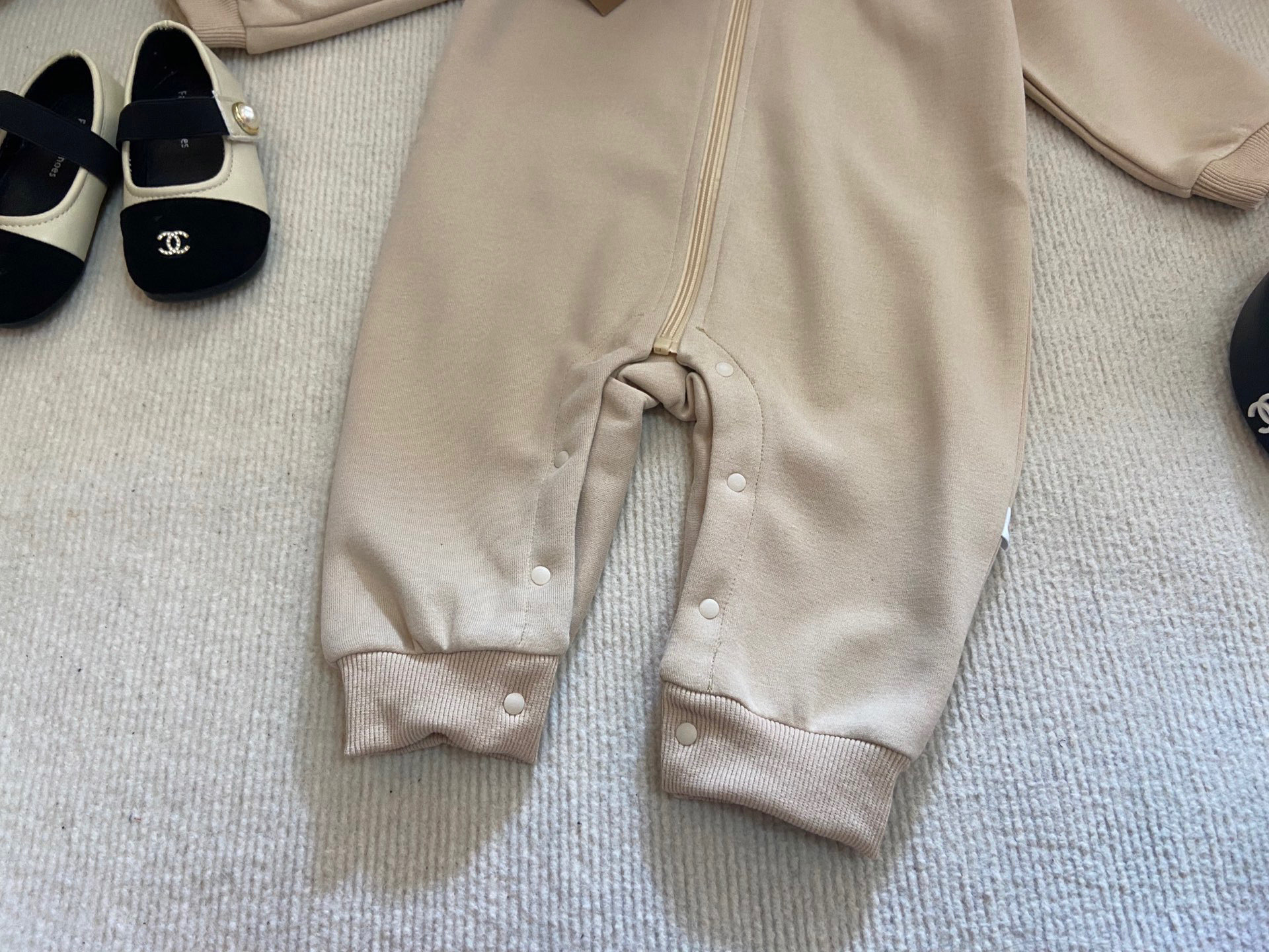 Dress your little one in this high-end Burberry-inspired beige cotton romper. Features a classic check collar for a stylish, comfortable fit. Perfect for sensitive skin!