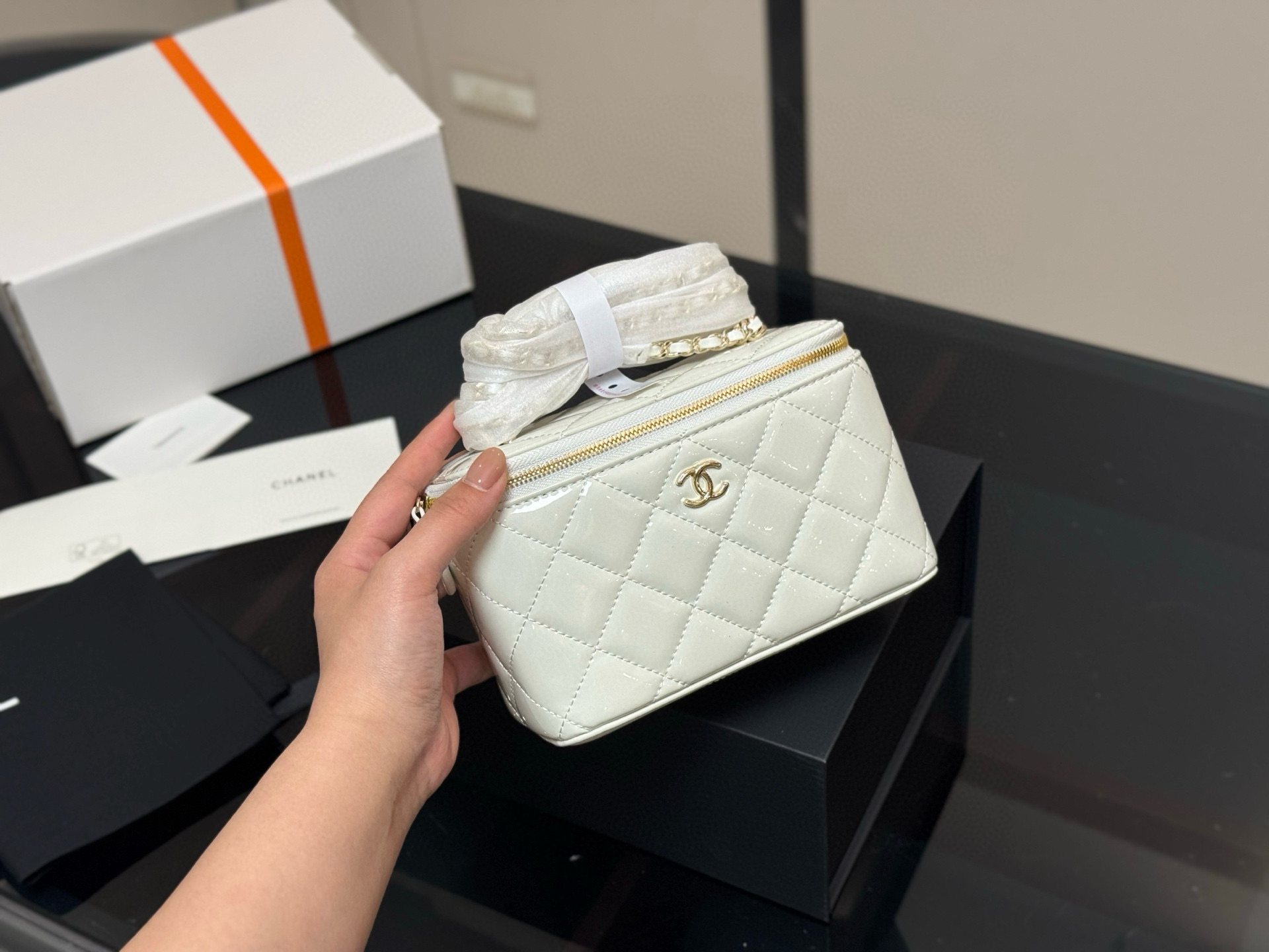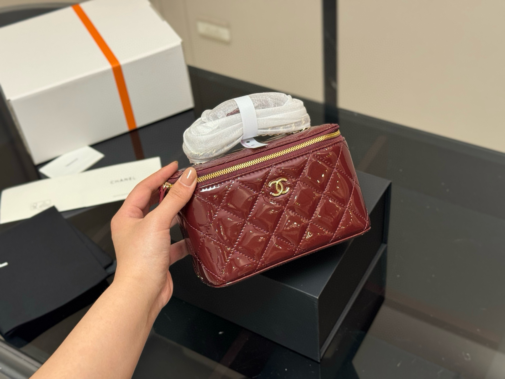 The Chanel Handle Vanity Case is crafted from patent leather with diamond quilting. It features a top handle and gold-tone hardware.