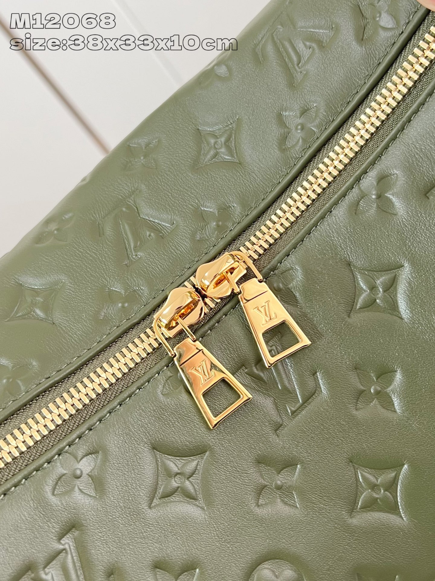 The Coussin Hobo MM bag blends fashion and function, showcasing iconic design elements. Crafted from smooth, padded leather with the brand's Monogram embossing, this hobo bag features a signature chunky chain with gold-tone hardware and a detachable wide textile strap for versatile carrying options.