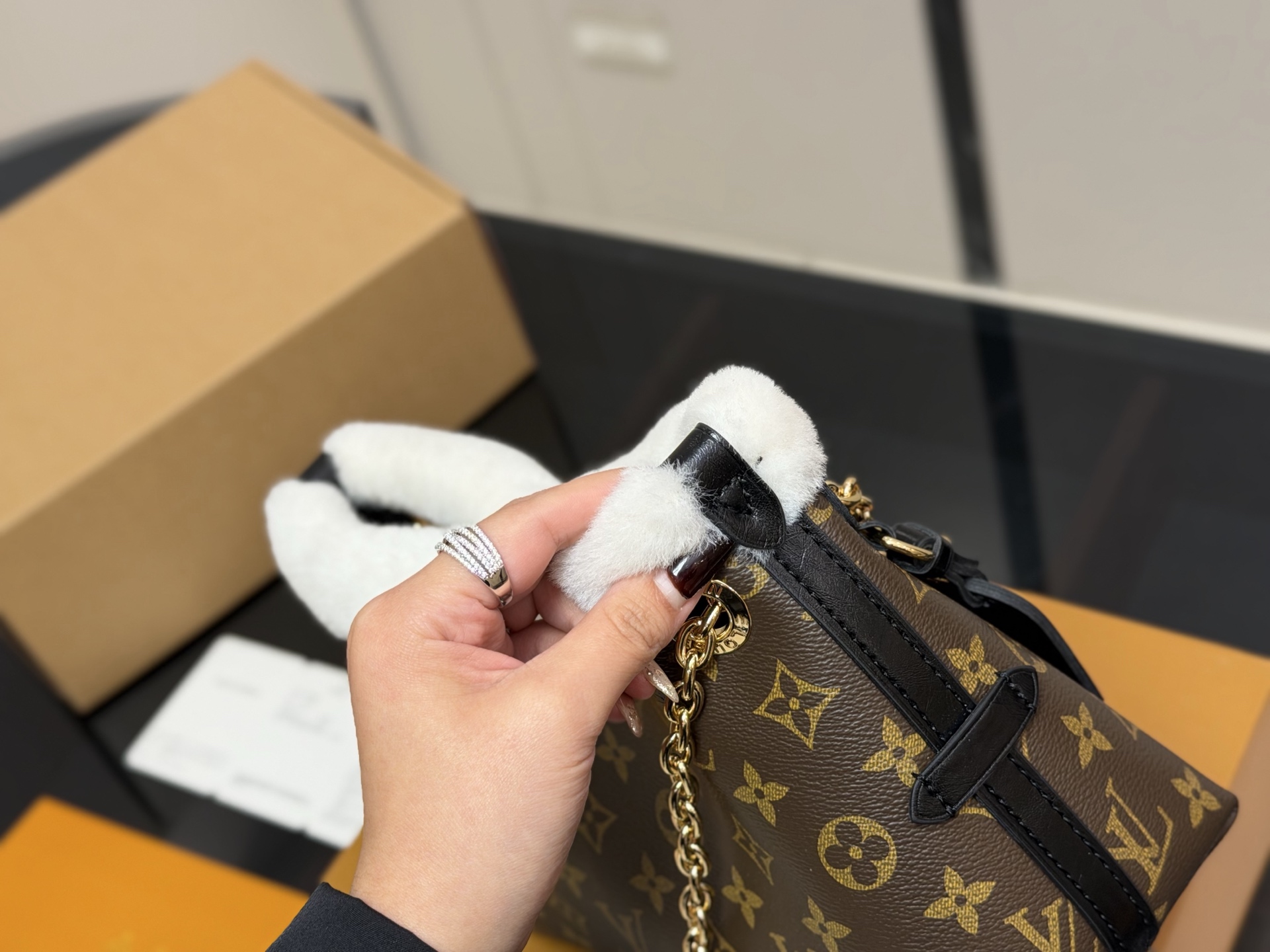 The Louis Vuitton CarryAll bag, crafted in brown monogram canvas, features a golden chain strap and is perfect for everyday elegance.