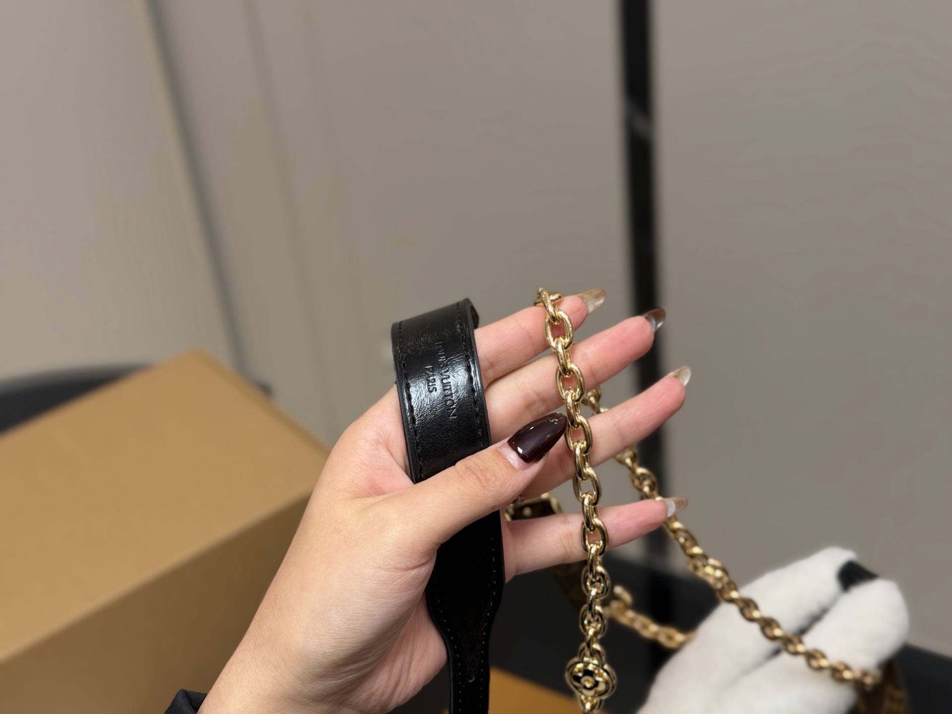 - Golden Chain Strap: Features a chic golden chain strap for shoulder or hand carry.