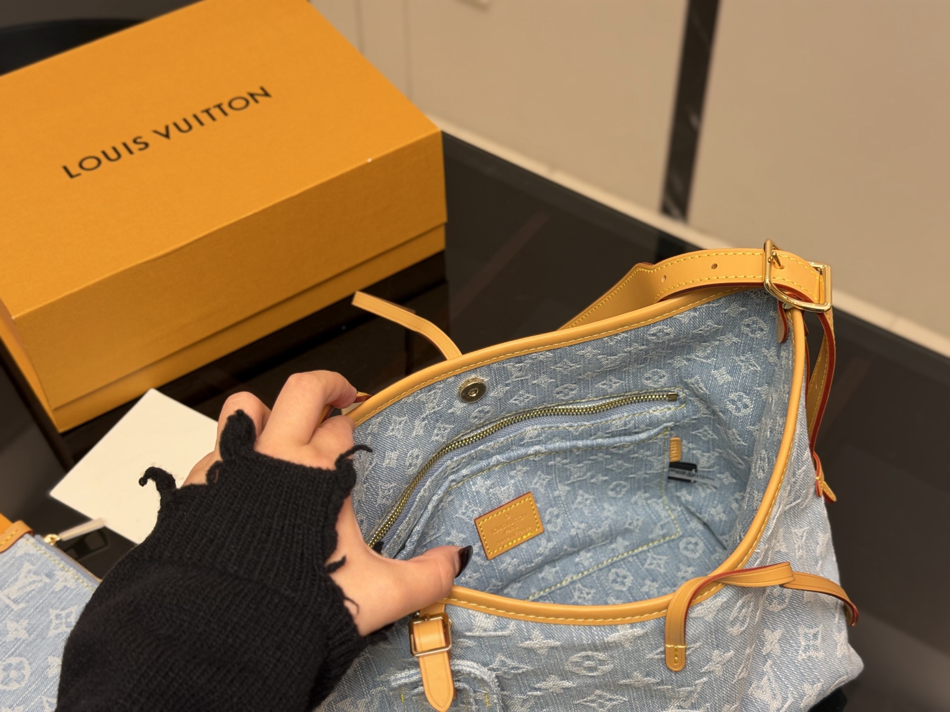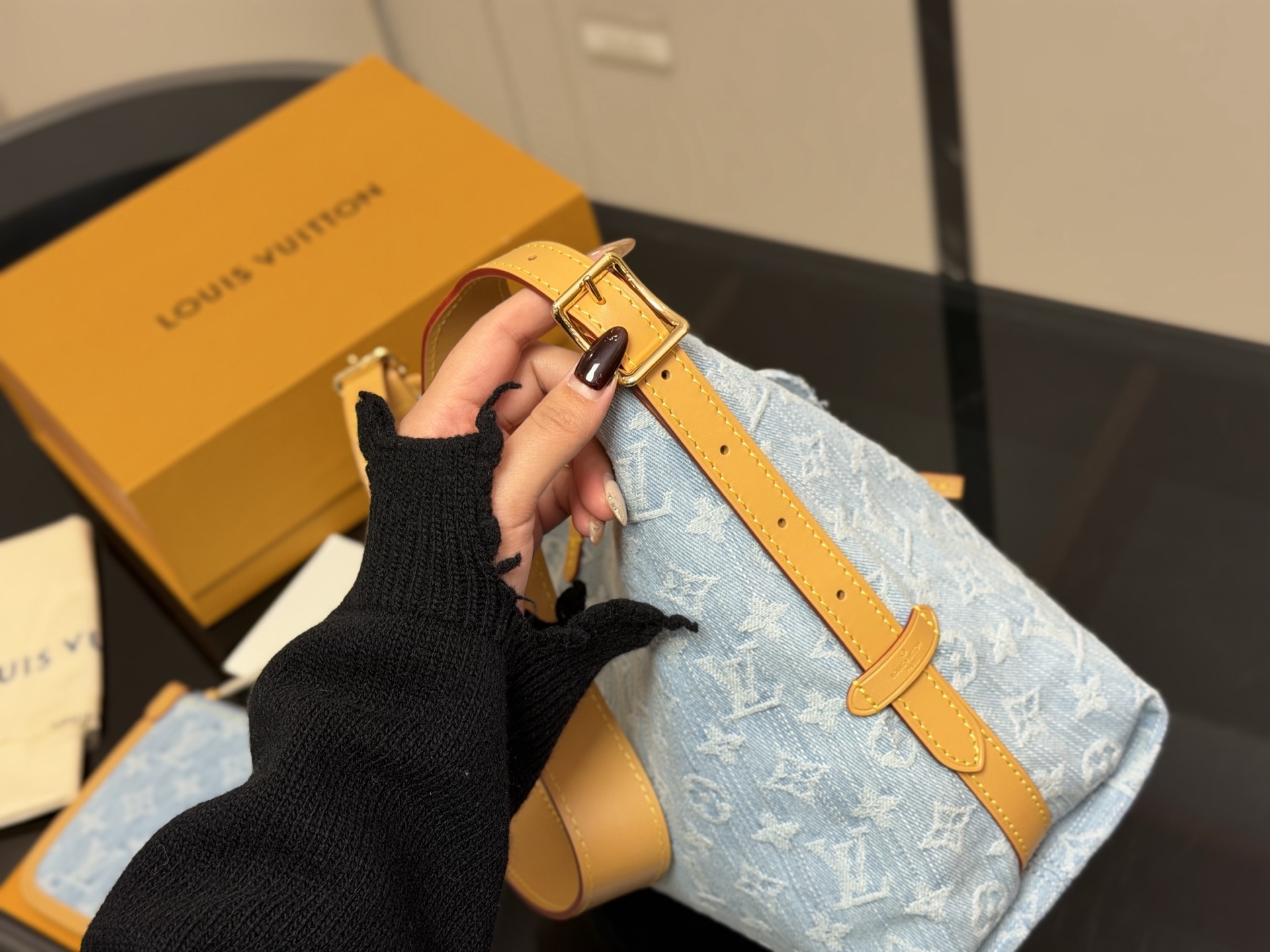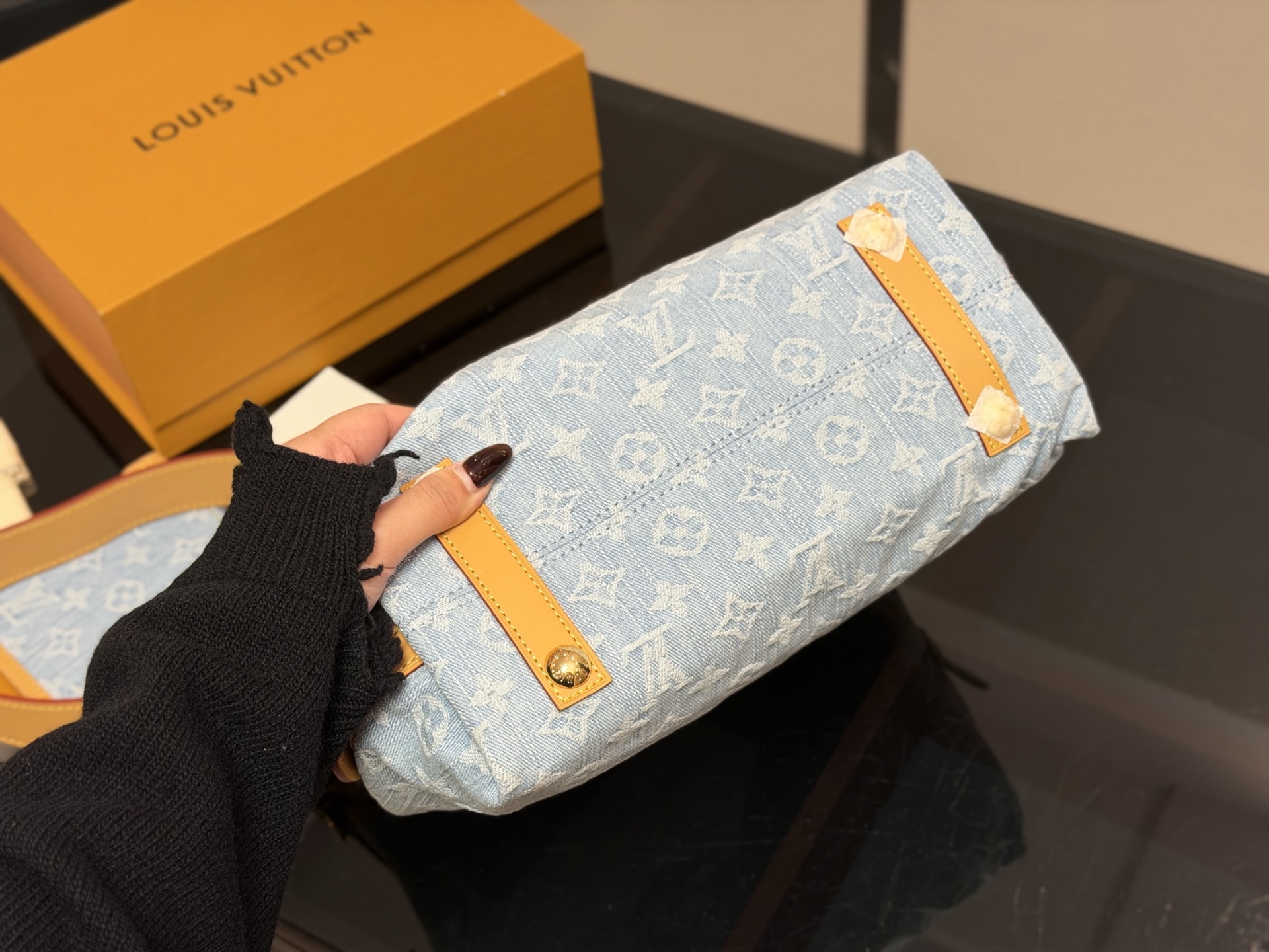 - Denim material with iconic Louis Vuitton monogram pattern