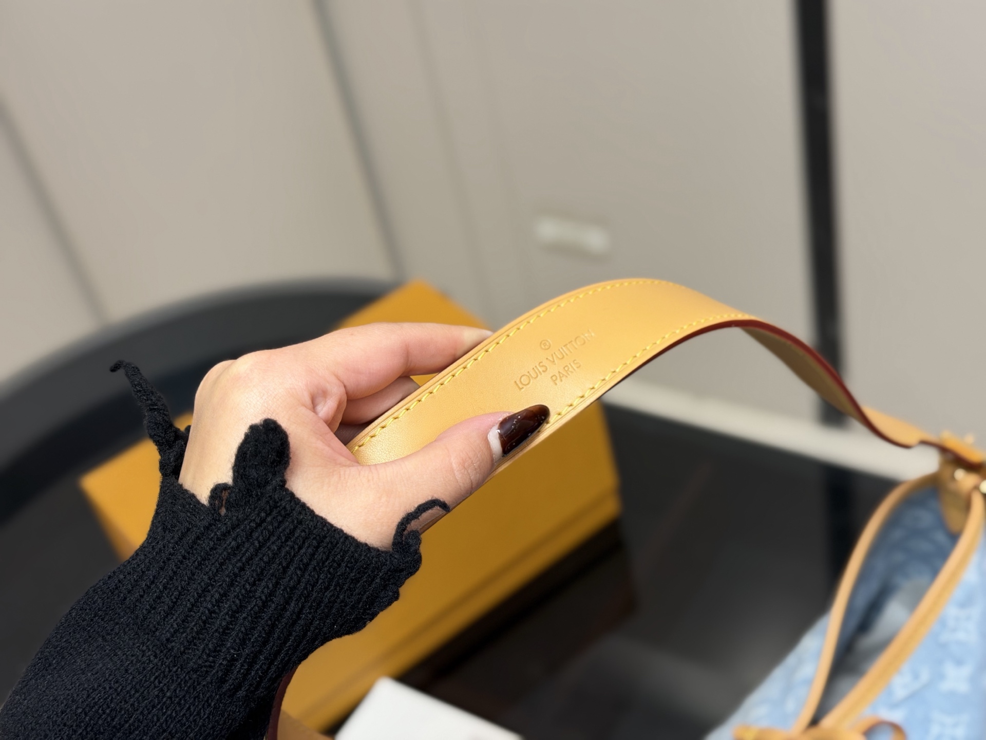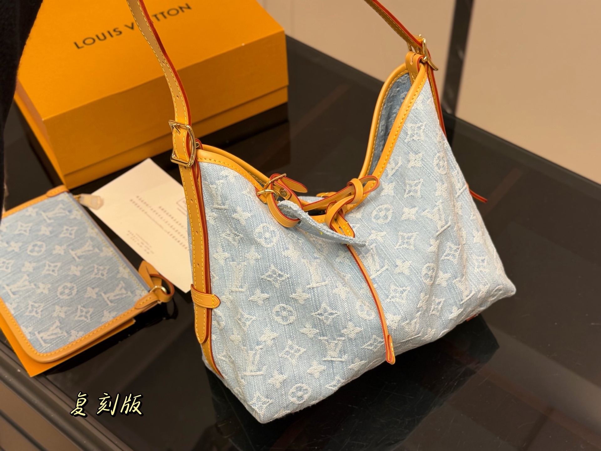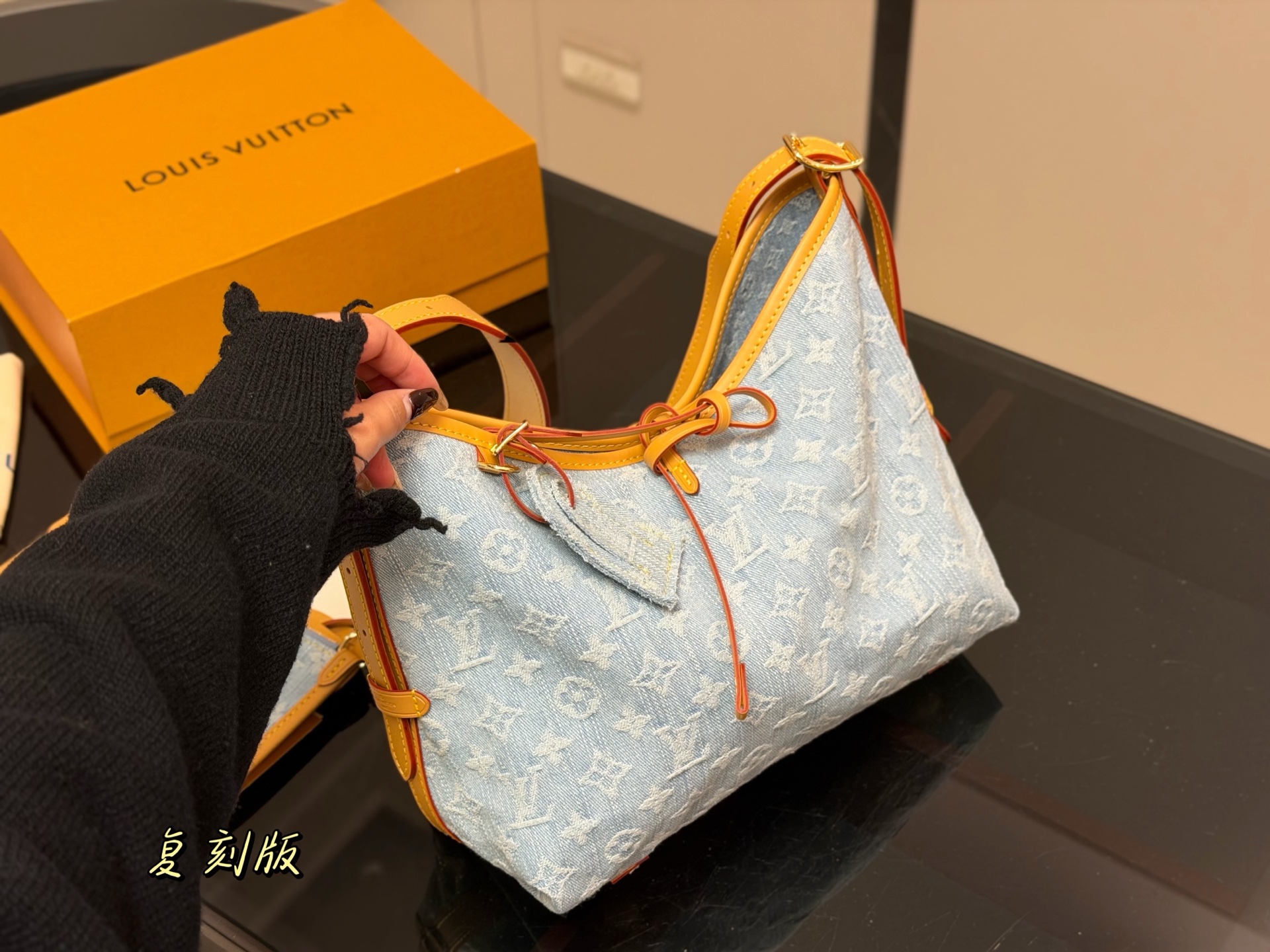 - Denim material with iconic Louis Vuitton monogram pattern