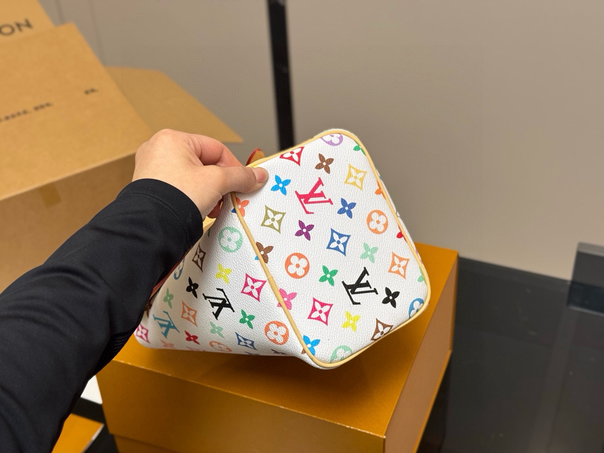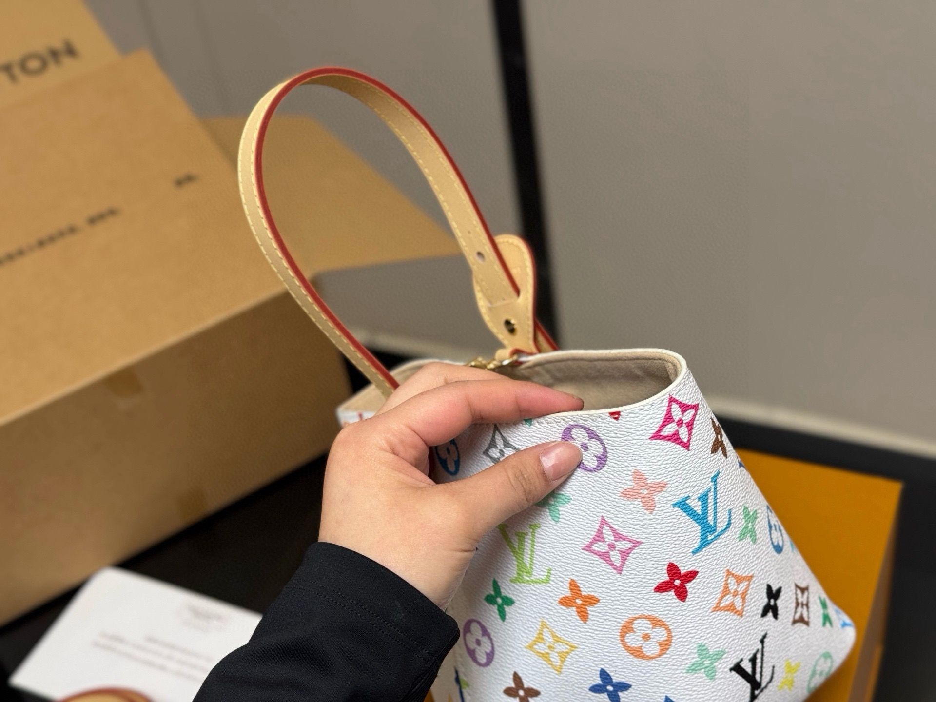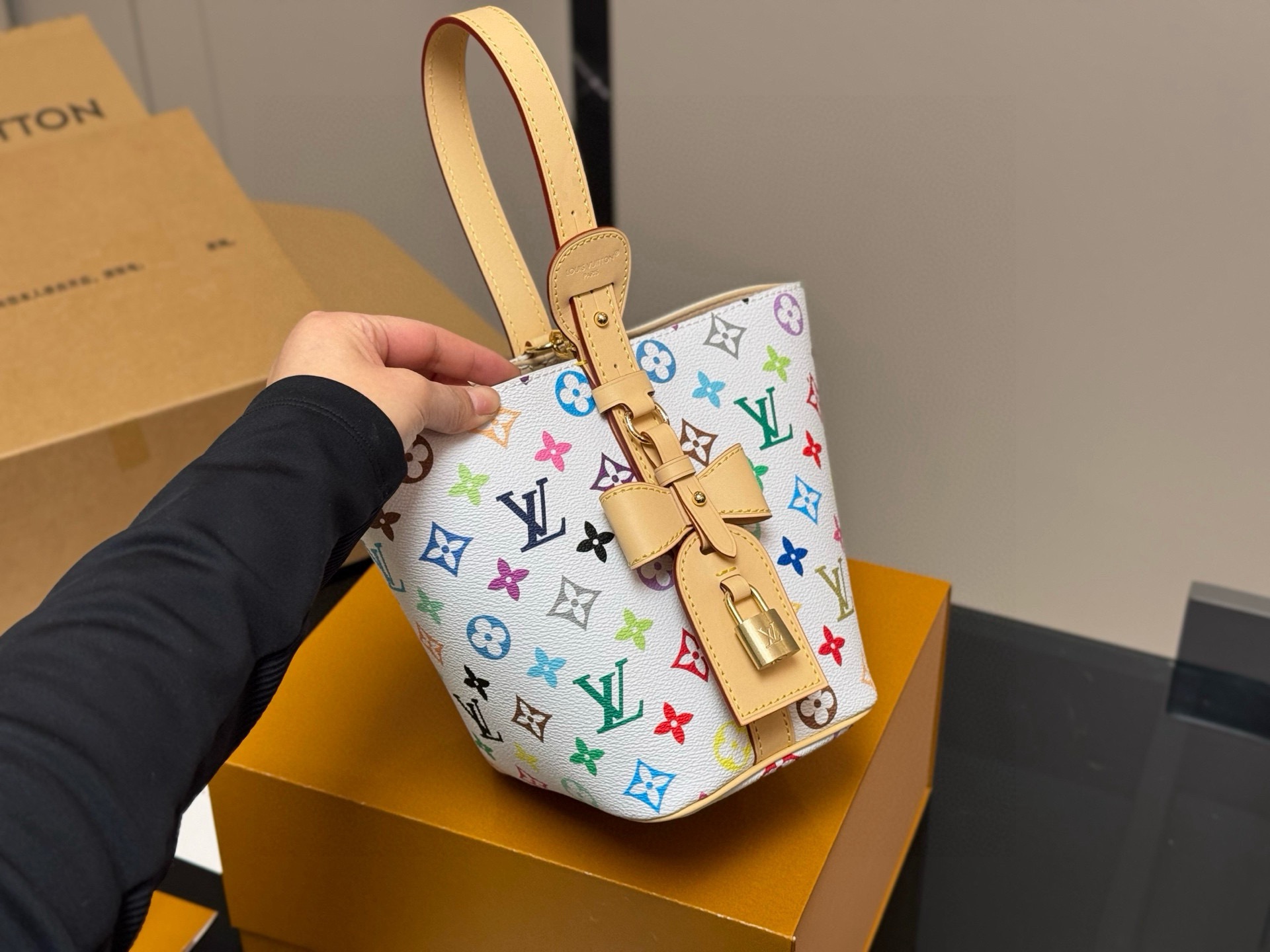 Elevate your style with this vintage Louis Vuitton bucket bag. Features the iconic monogram in a playful multicolor design. Compact size, perfect for daily use.