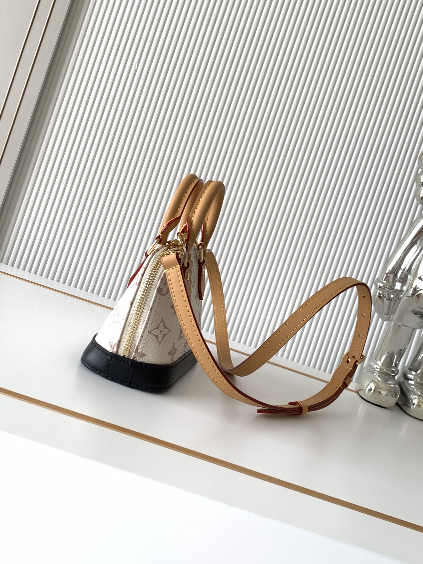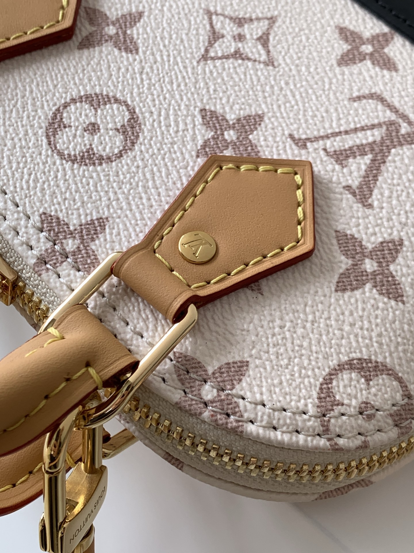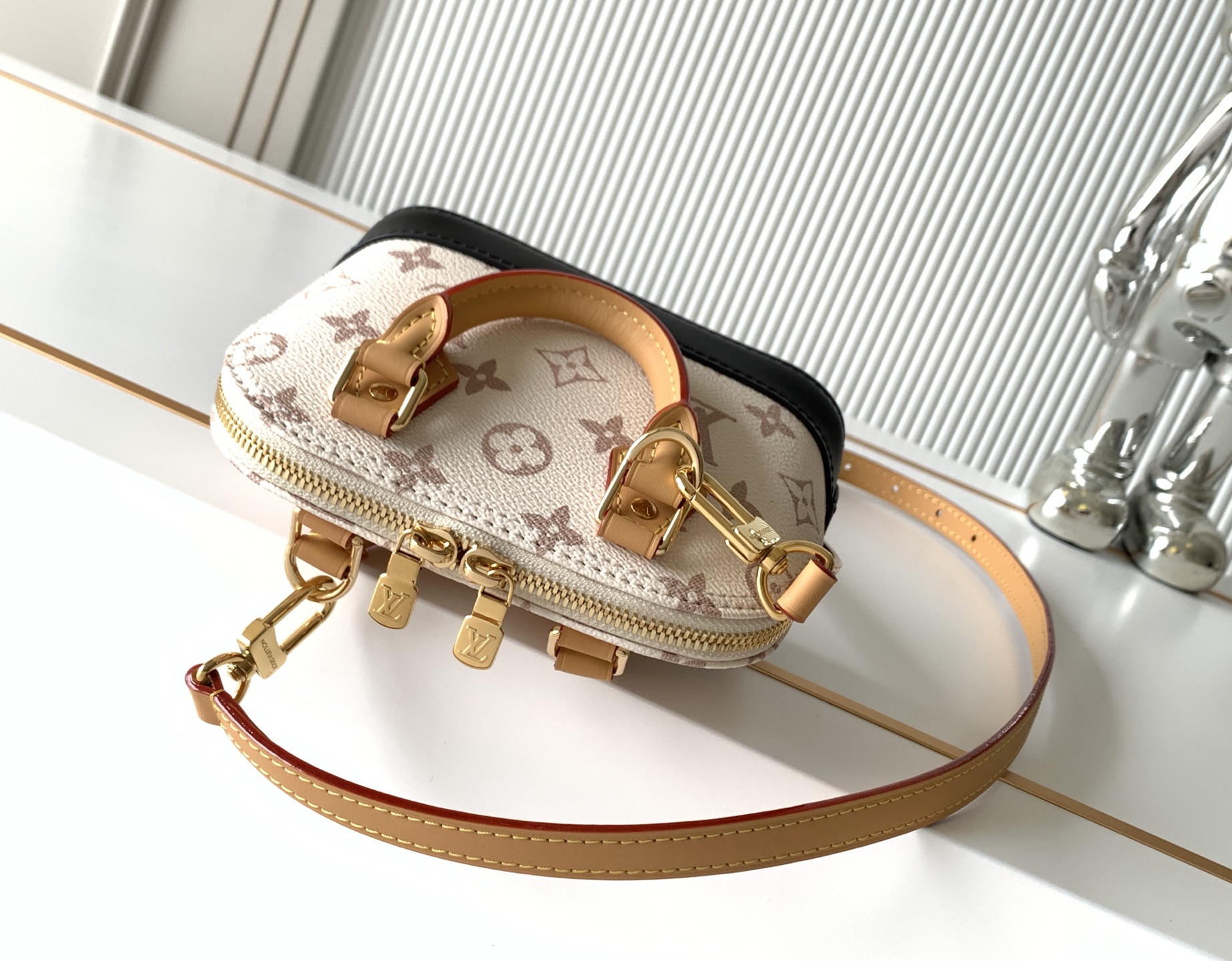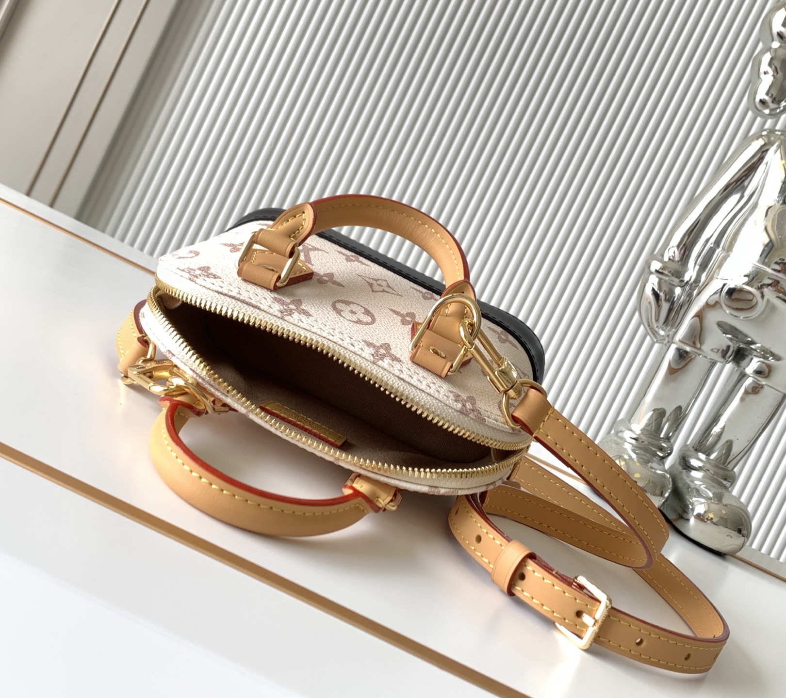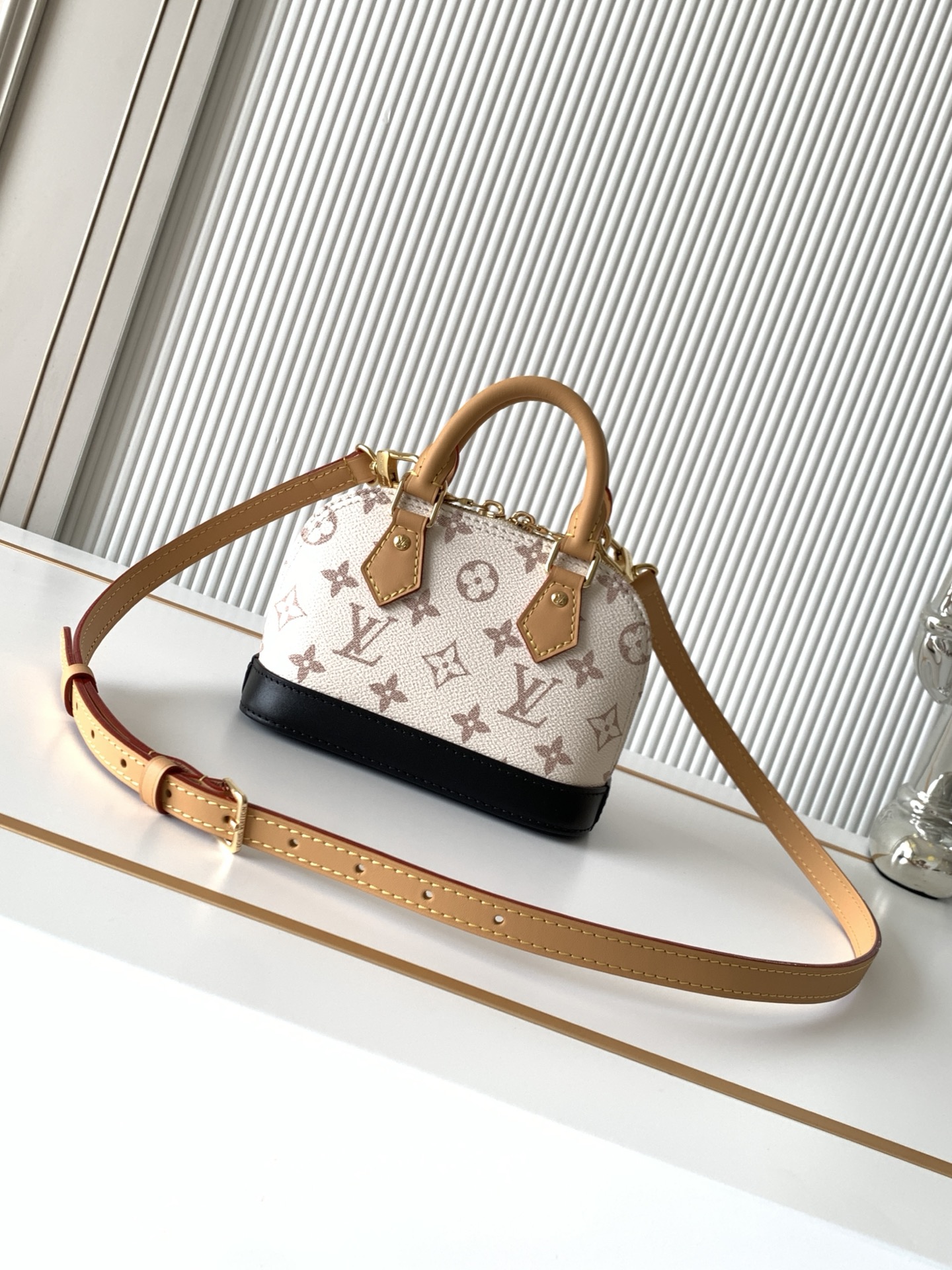 Discover the Nano Alma, a miniature version of the iconic Alma bag. Crafted from Monogram canvas with natural leather trim, it combines charm and functionality.