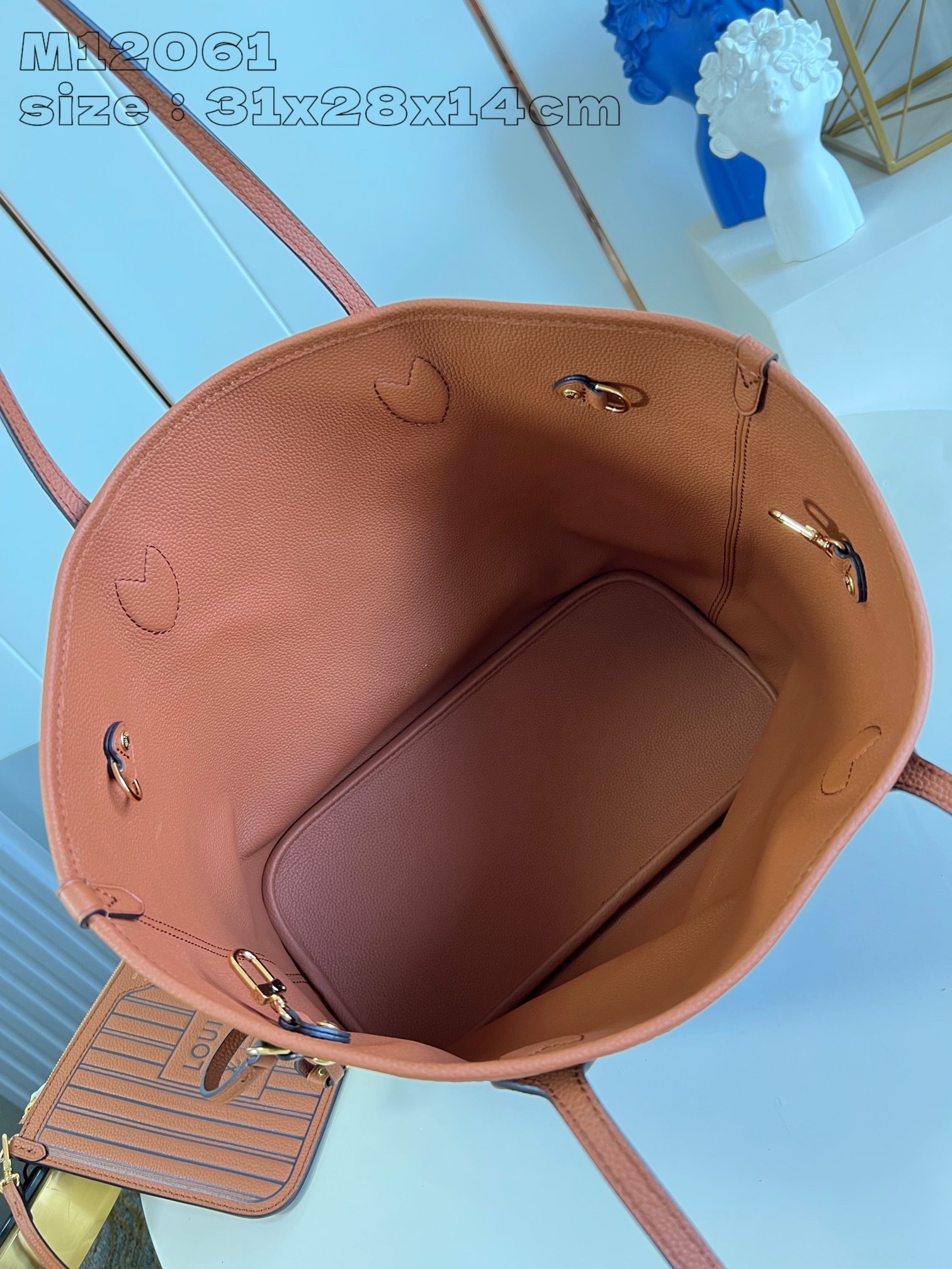 The Neverfull Inside Out bag features Monogram canvas and leather. Its removable pocket can be used as an outer pocket or a small shoulder bag.