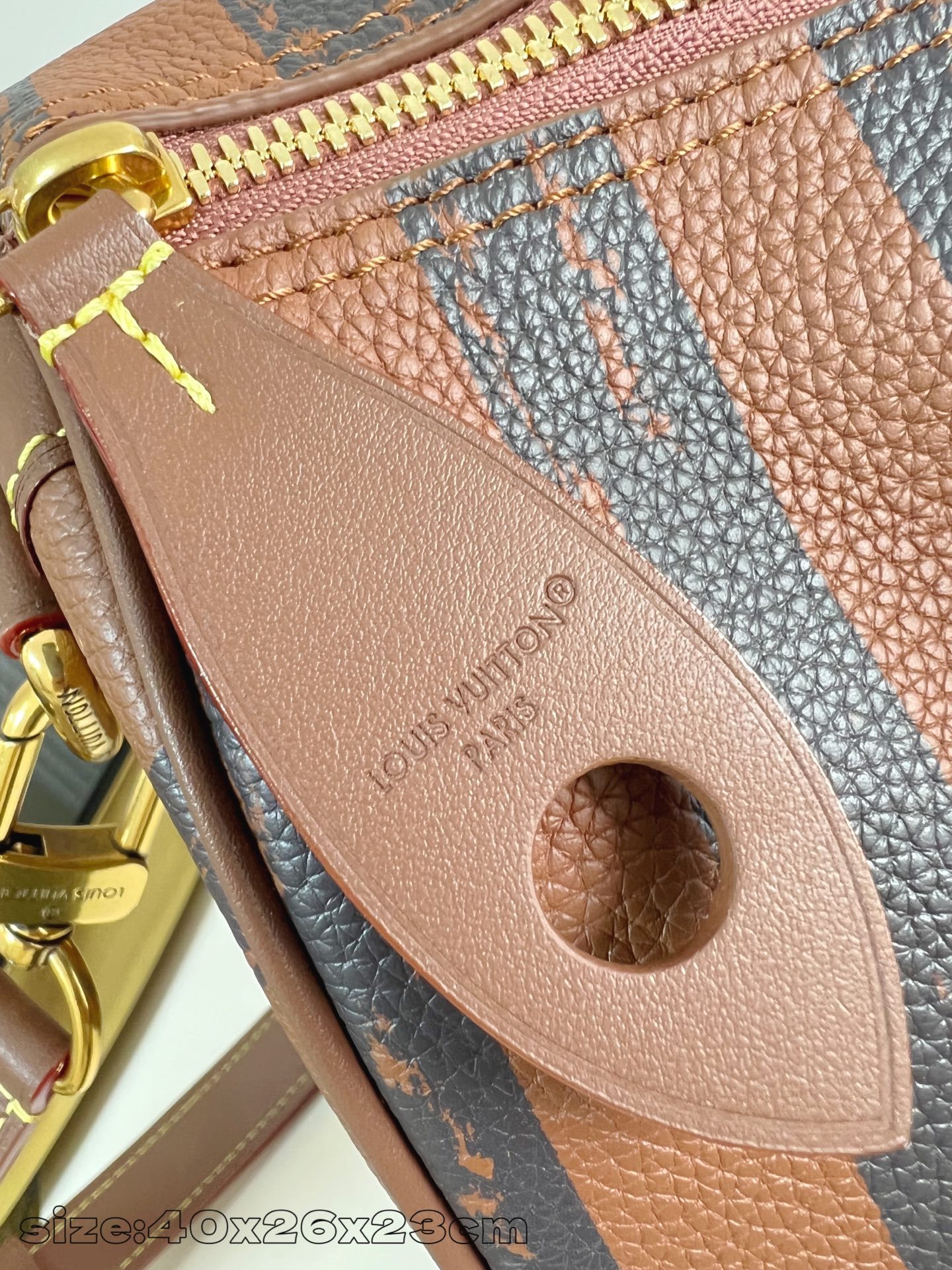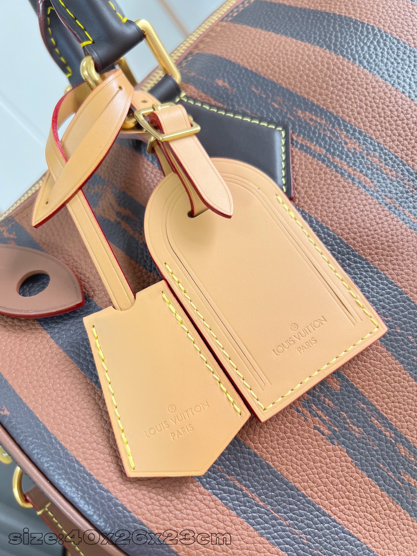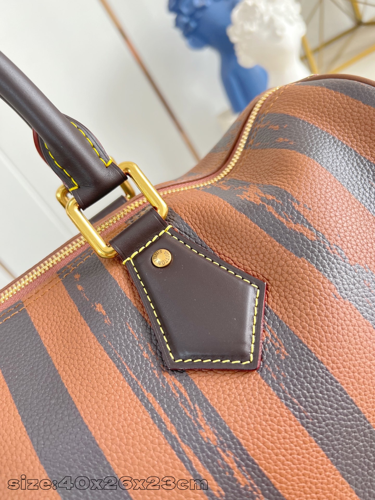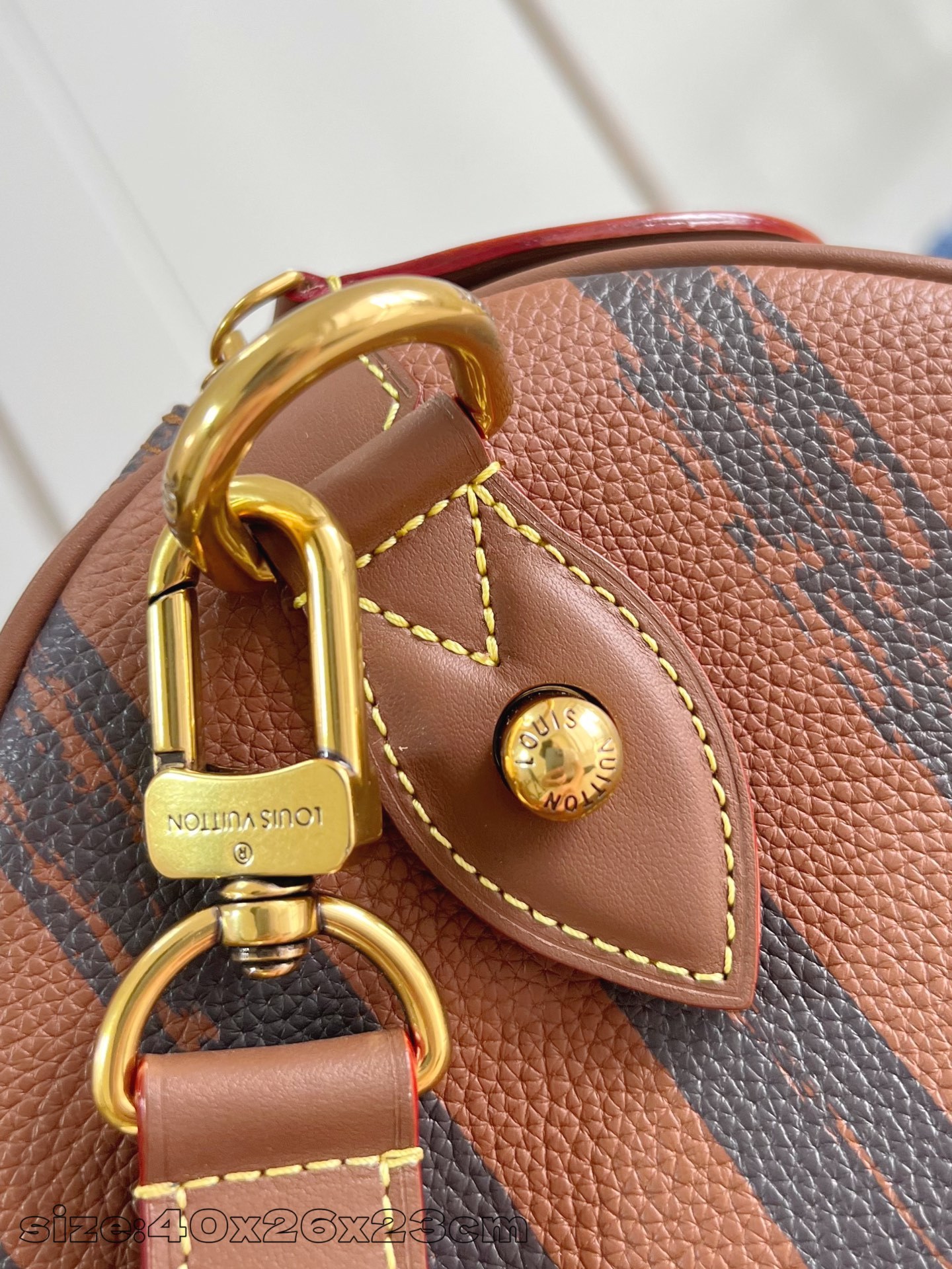 The Speedy Bandoulière 40 features soft, grained leather and a silk-screened Monogram. Dimensions: 40 x 26 x 23 cm.