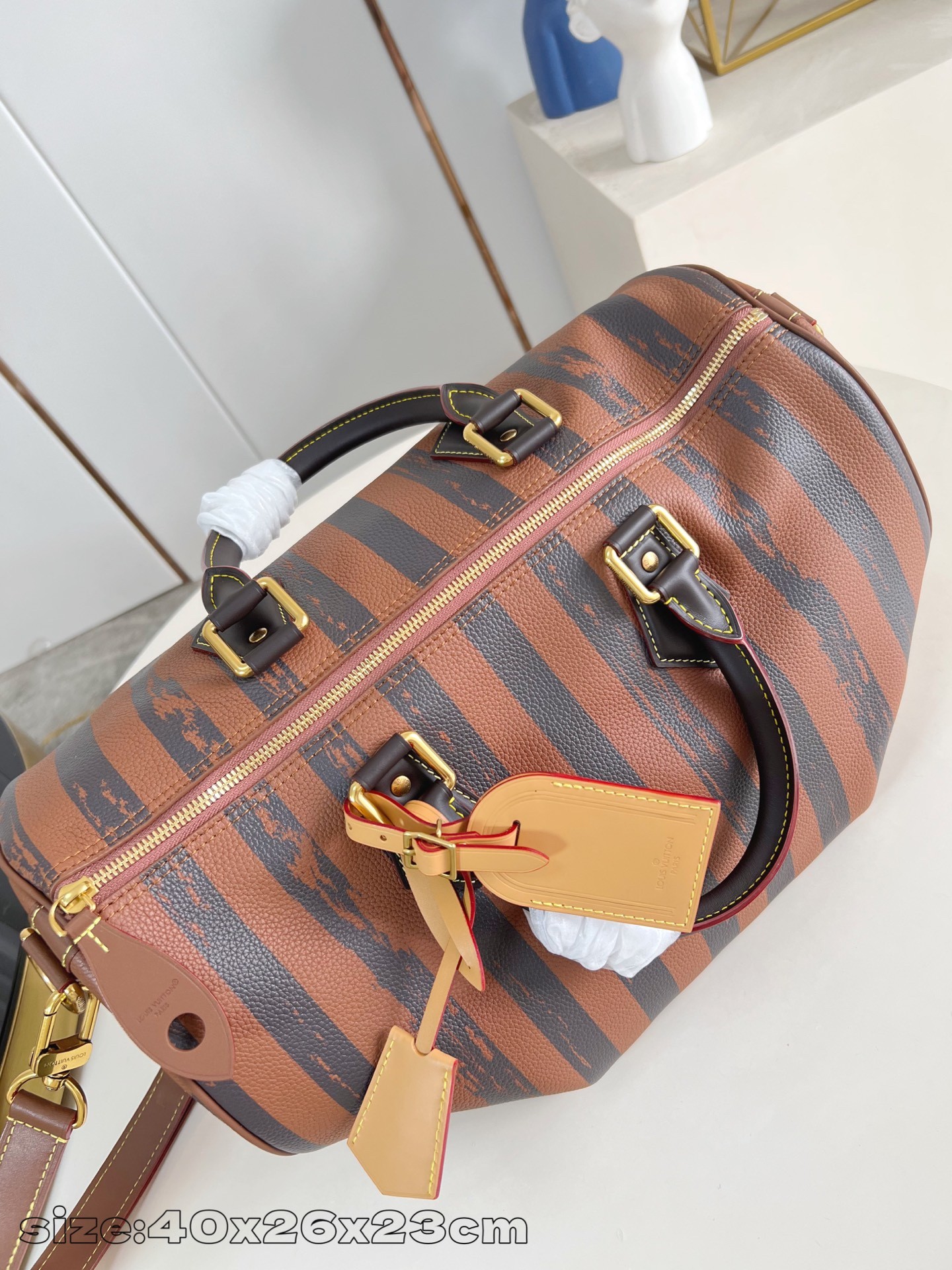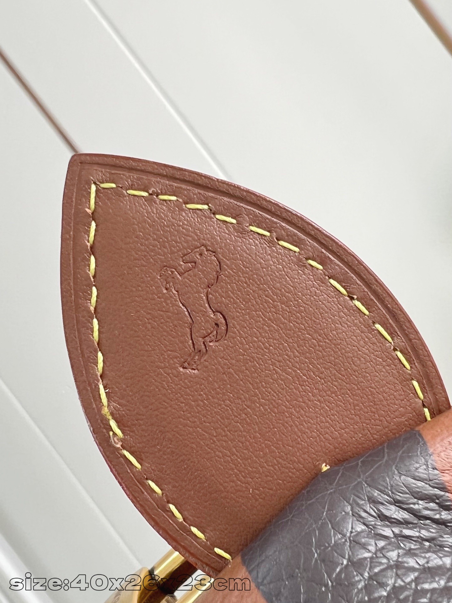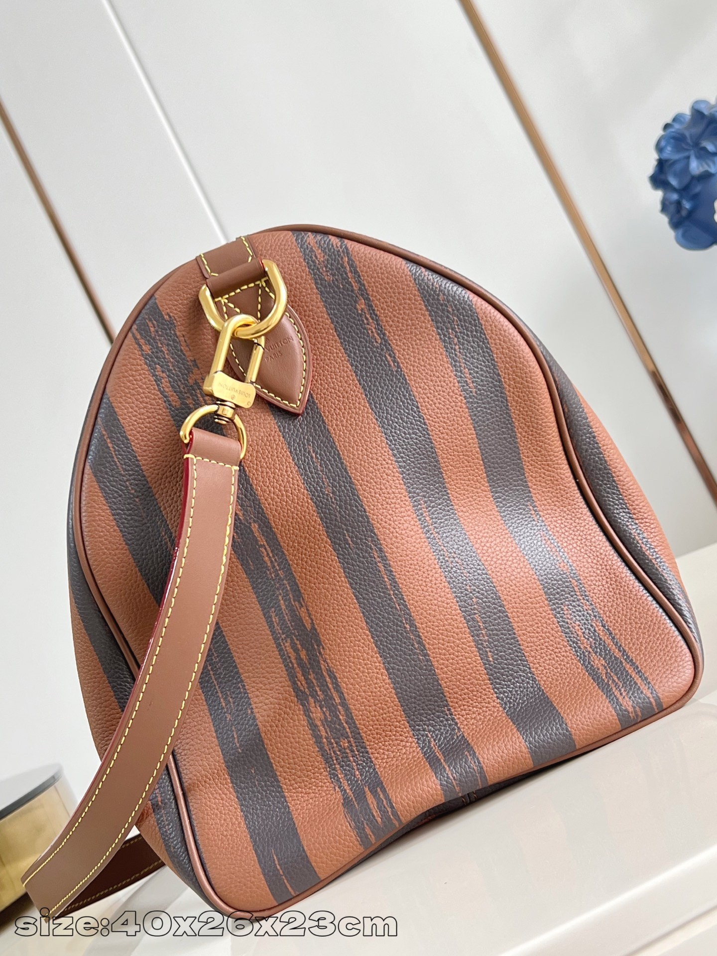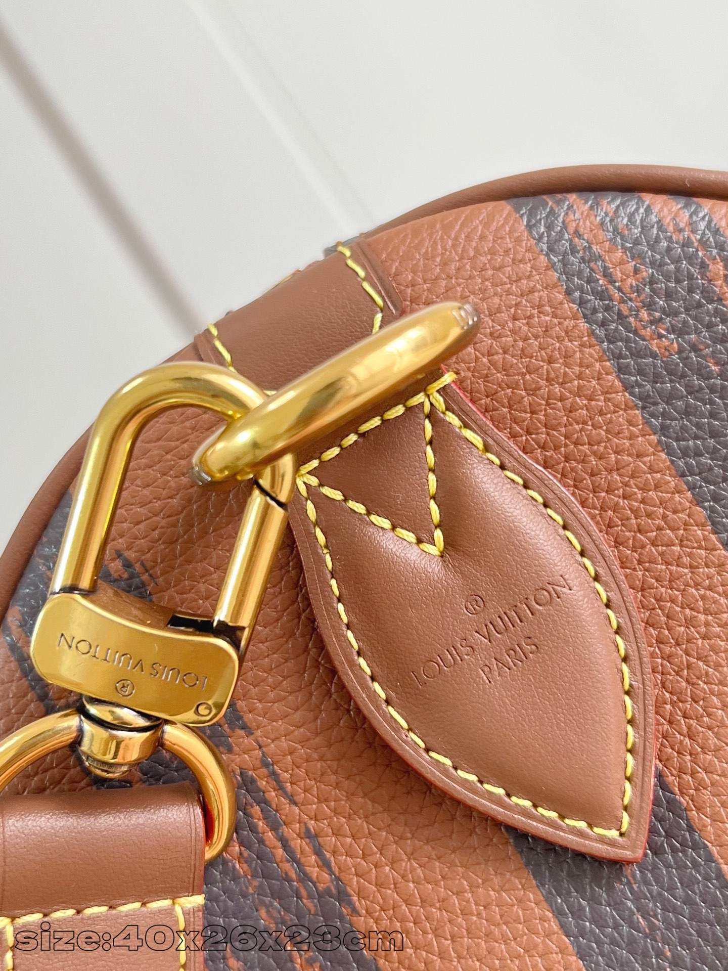 The Speedy Bandoulière 40 features soft, grained leather and a silk-screened Monogram. Dimensions: 40 x 26 x 23 cm.