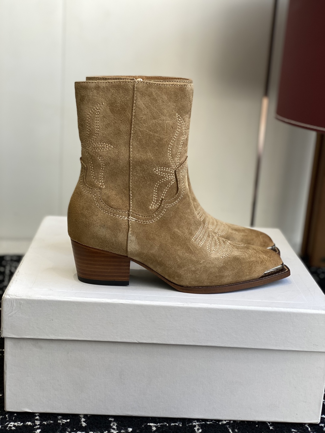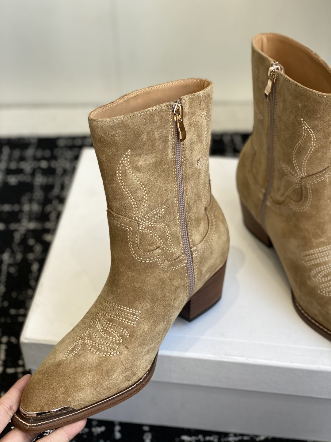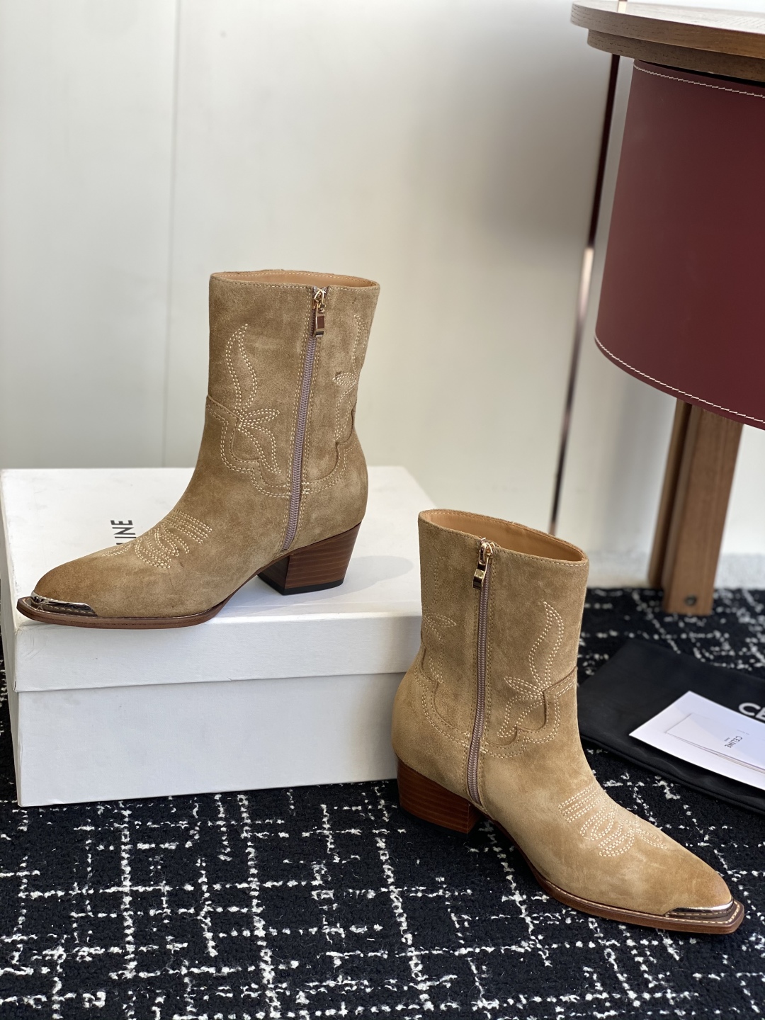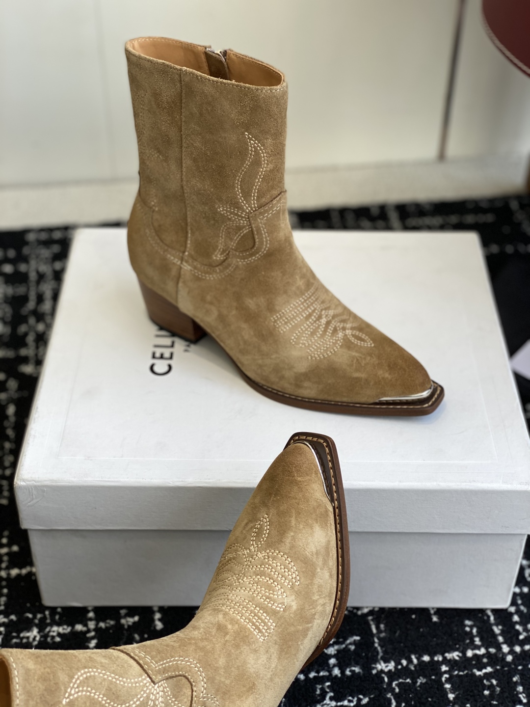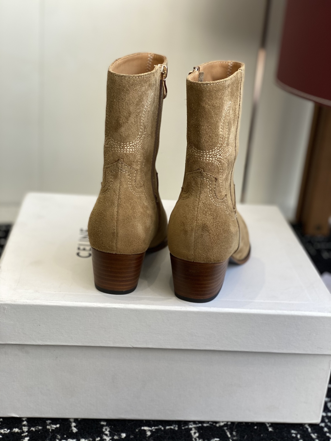 Celine Women's Western Suede Ankle Boots, Pointed Toe, Stacked Heel, Size 35-40