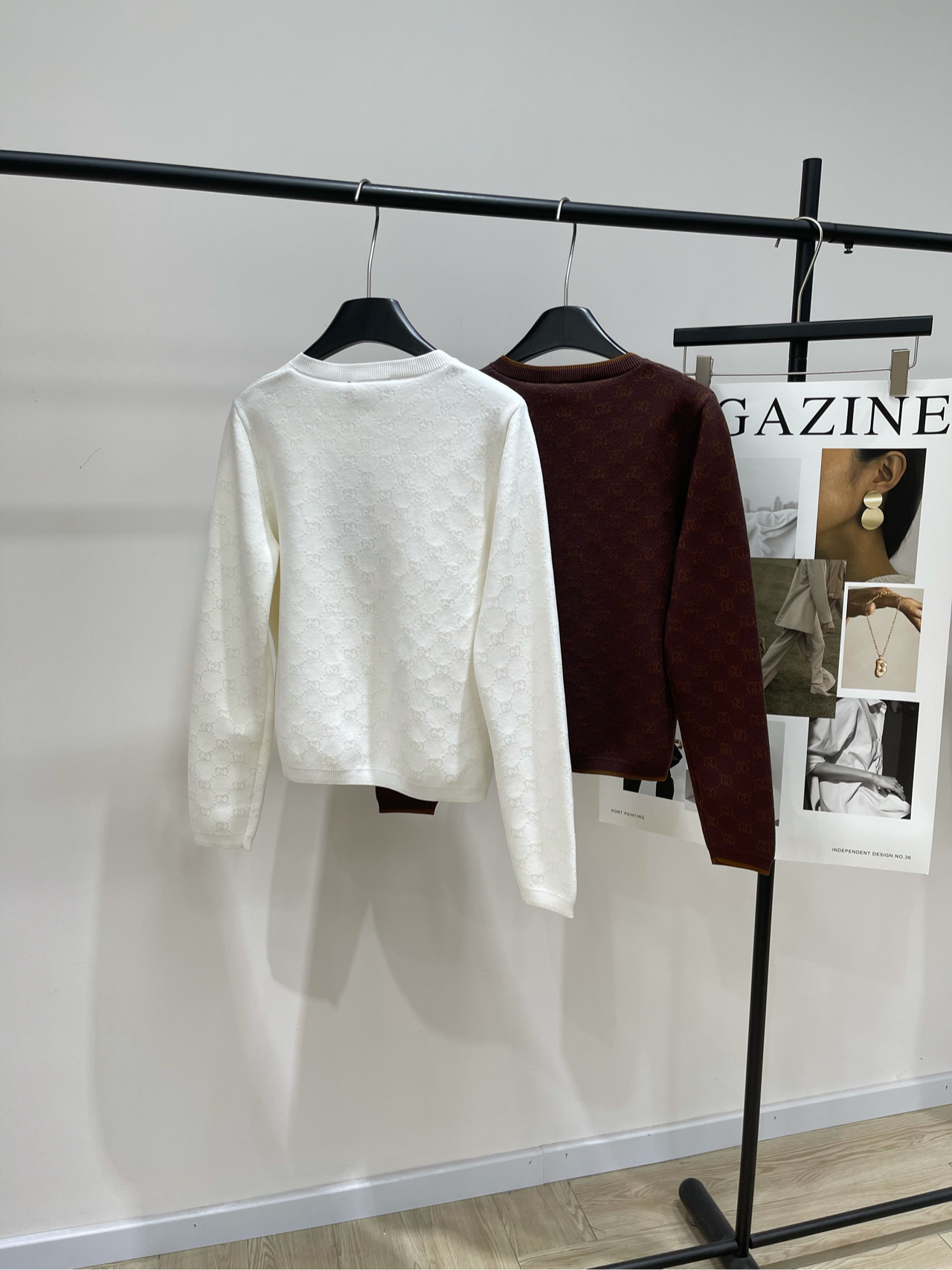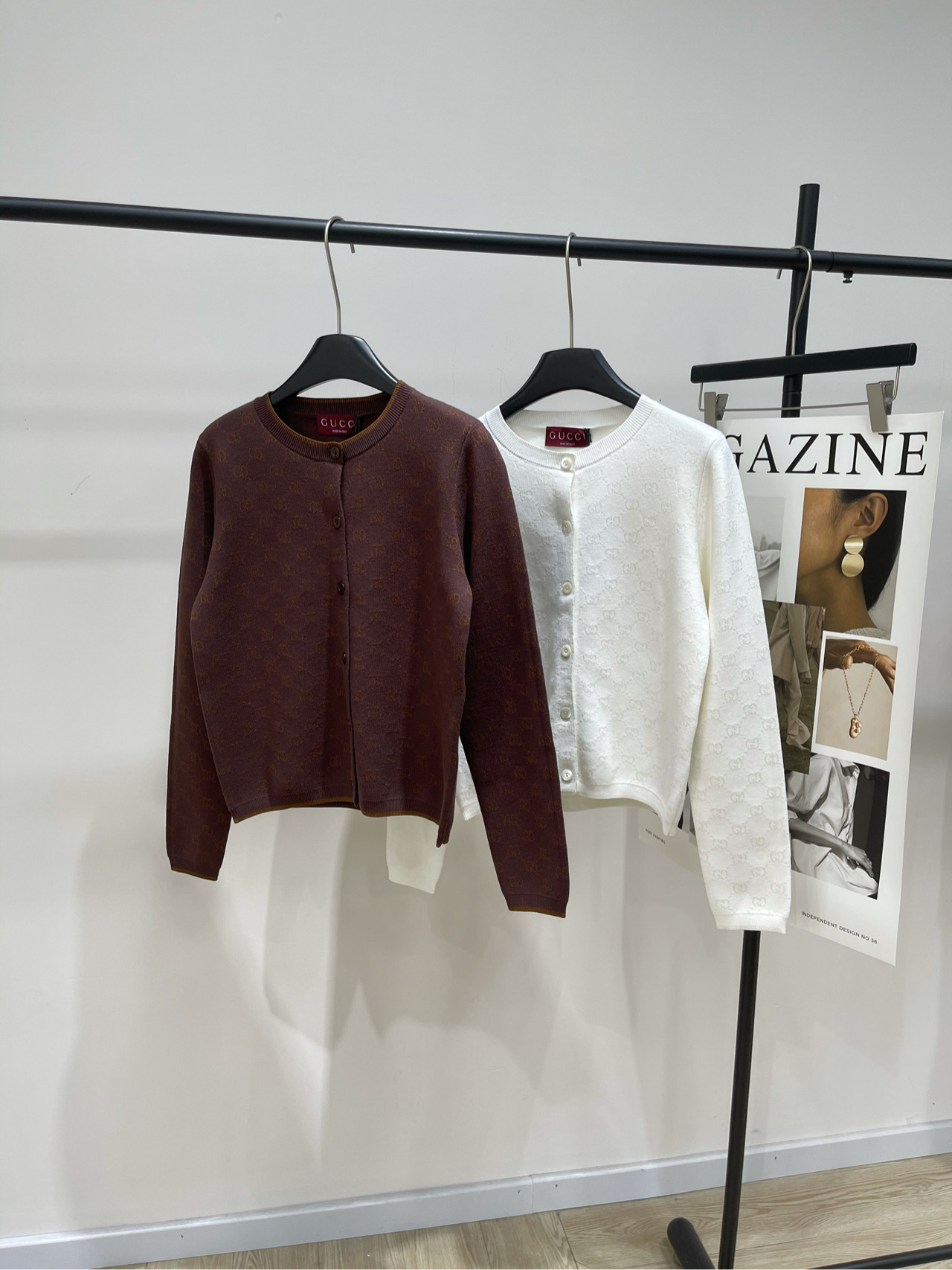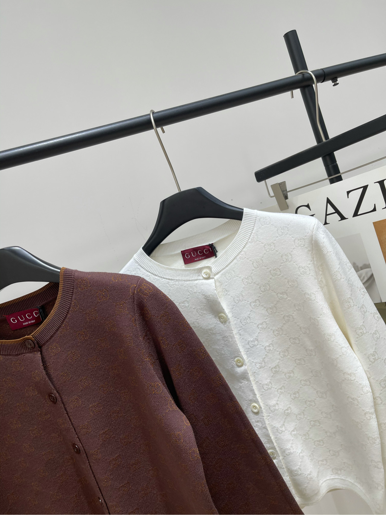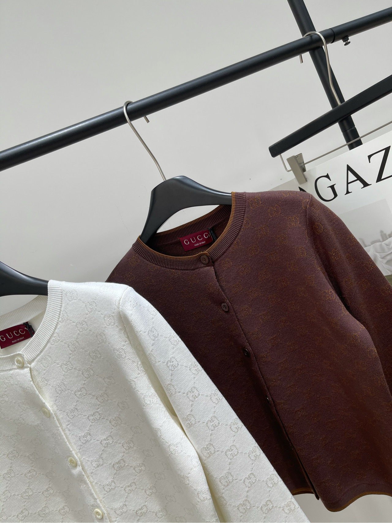 Elevate your style with this Gucci knit cardigan featuring a subtle jacquard pattern, round neck, and front button closure. Soft, comfortable, and effortlessly chic.