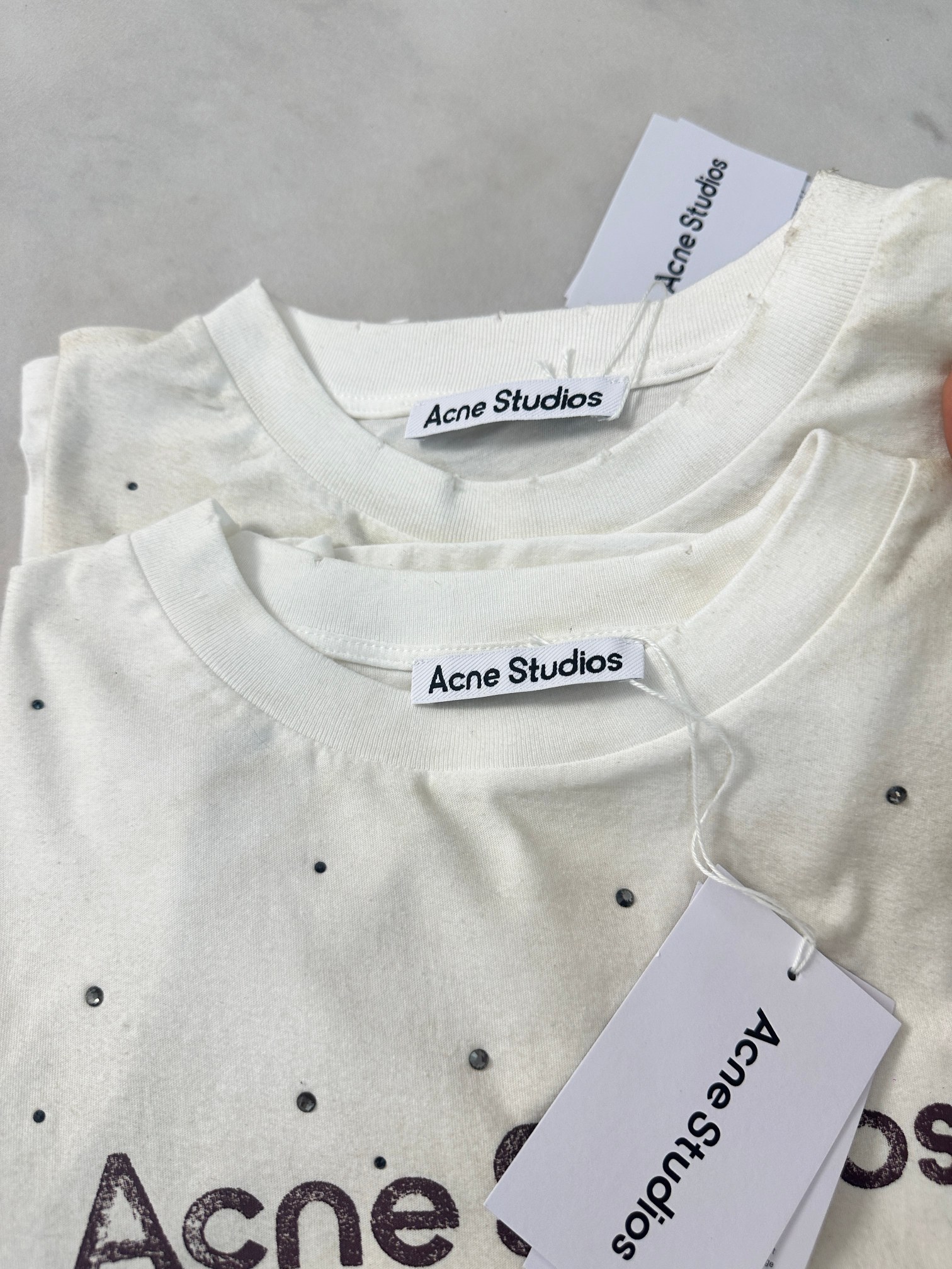 Vintage-inspired Acne Studios long sleeve tee with distressed details & rhinestone accents. Soft, comfortable cotton, perfect for layering or solo wear.