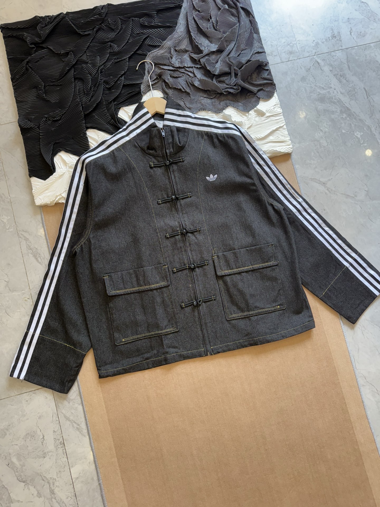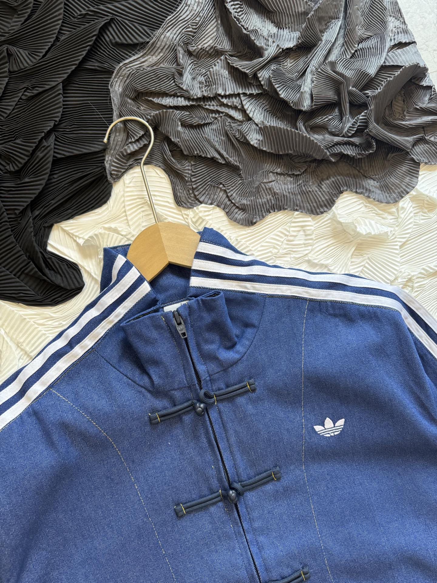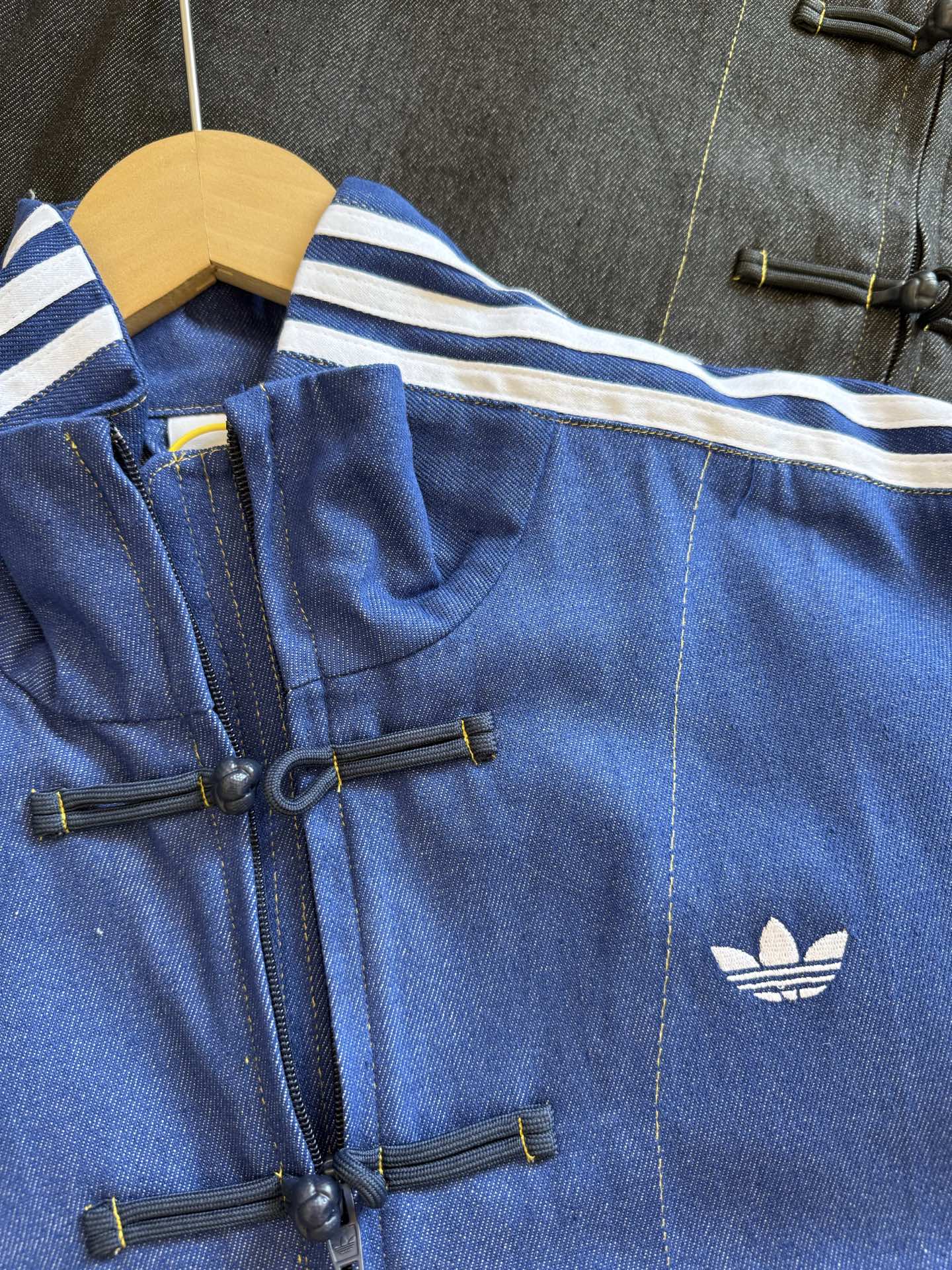 This Adidas denim jacket combines traditional Chinese design with modern streetwear. It features a unique blend of Eastern and Western styles, making it a standout piece for any wardrobe.