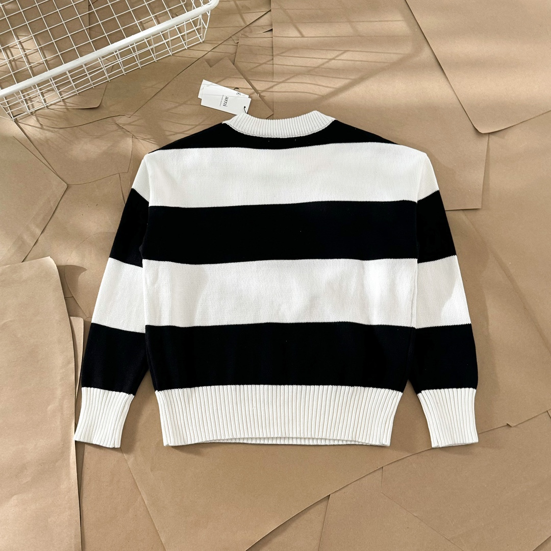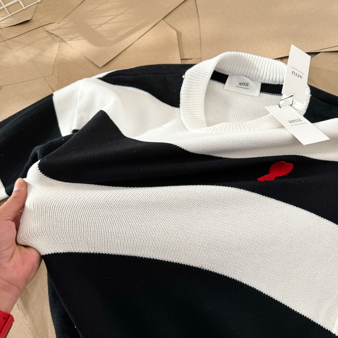 This AMI Paris sweater combines classic design with a touch of modern flair. Made from soft wool, this sweater features bold stripes and the brand's signature Ami de Coeur logo, making it a stylish addition to any wardrobe.