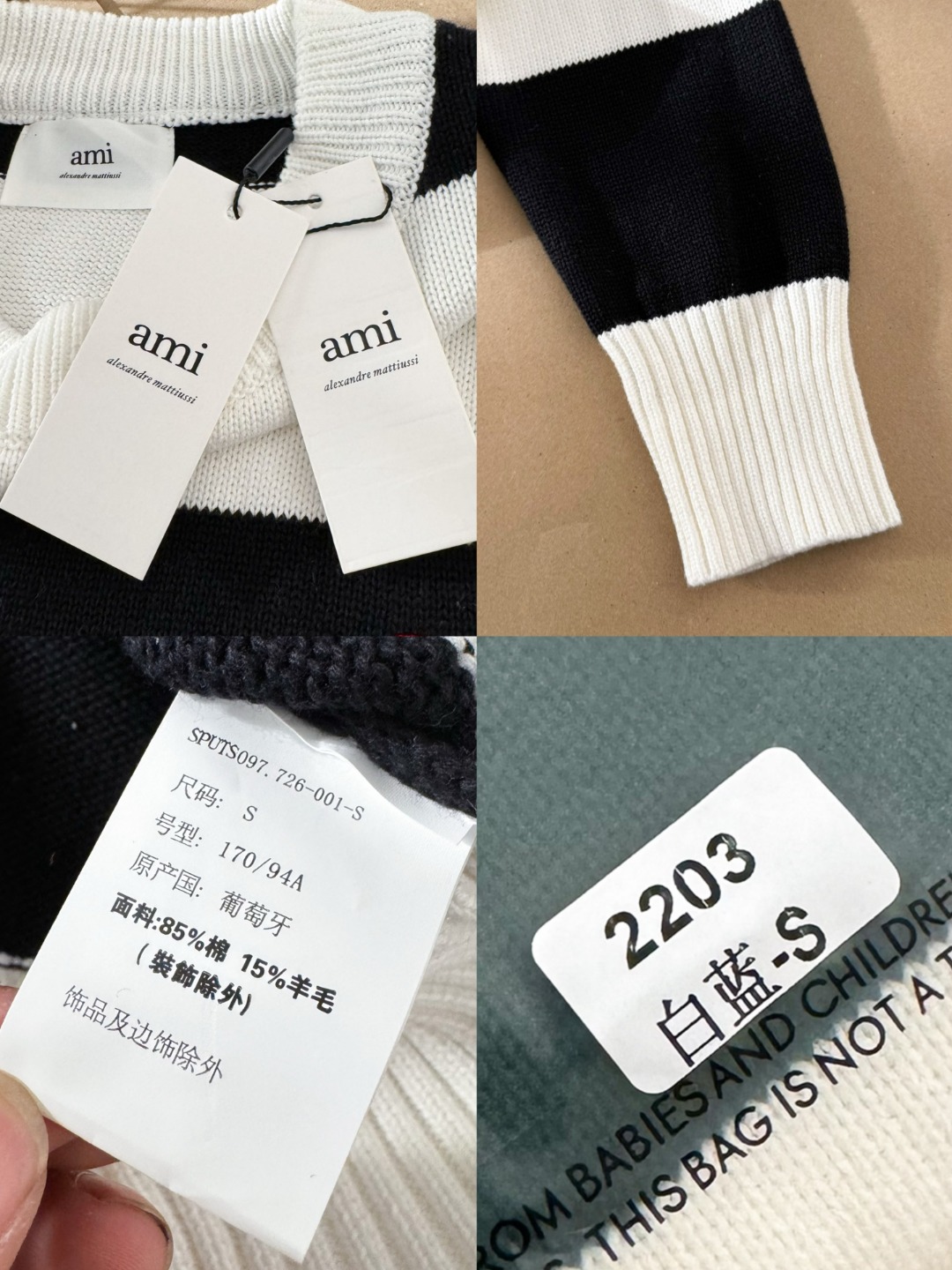 Stay cozy in style with this AMI Paris striped wool sweater featuring the iconic Ami de Coeur embroidery. Perfect for a relaxed, unisex look.