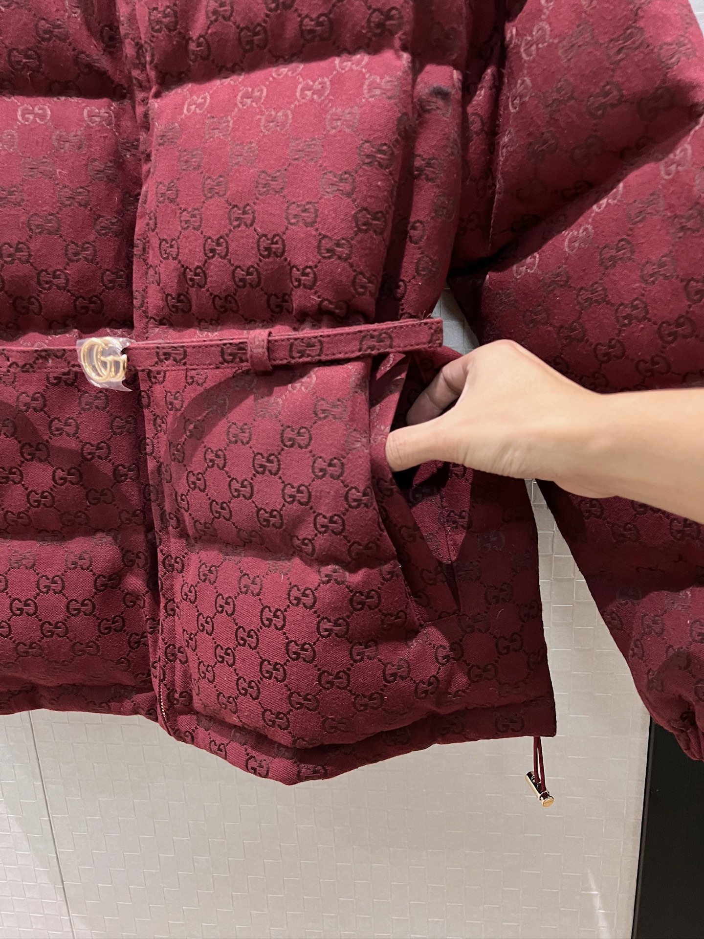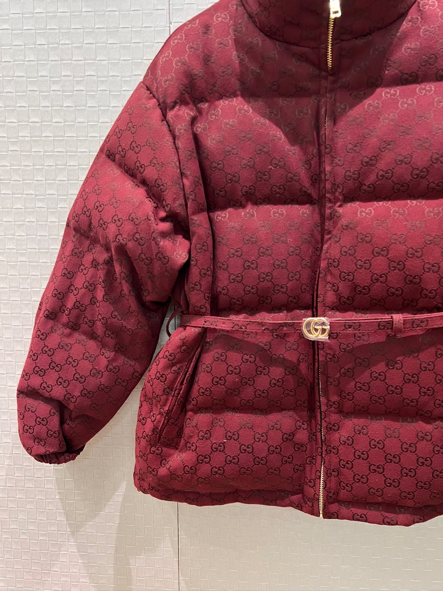 Stay warm and stylish with this Ancola red down jacket featuring a double G jacquard design and a flattering belt. Perfect for the winter season!