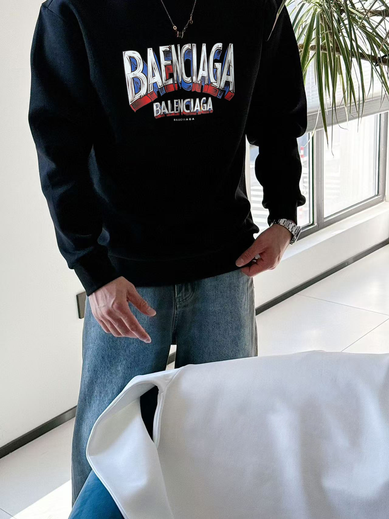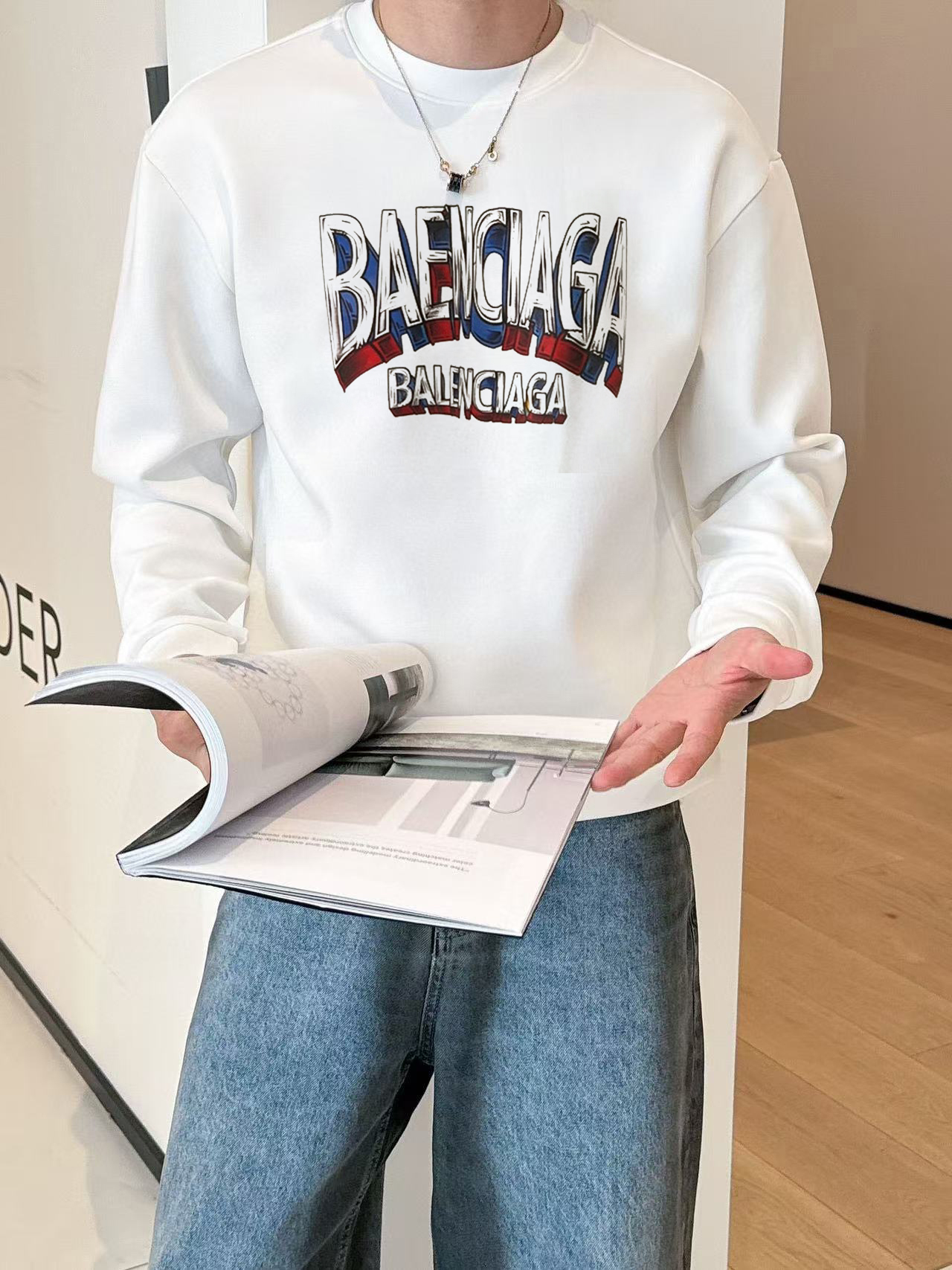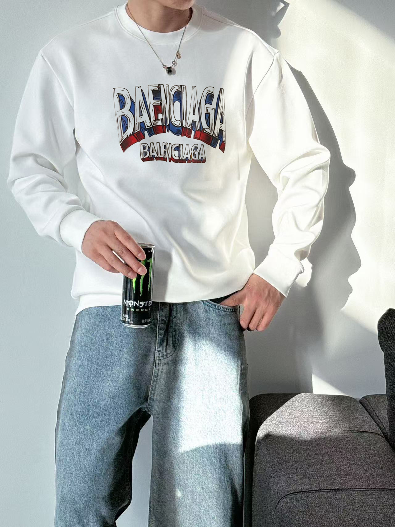Elevate your fall style with this Balenciaga crew neck sweatshirt. Crafted from 400g pure cotton, it offers comfort, warmth, and a high-end, luxurious feel.