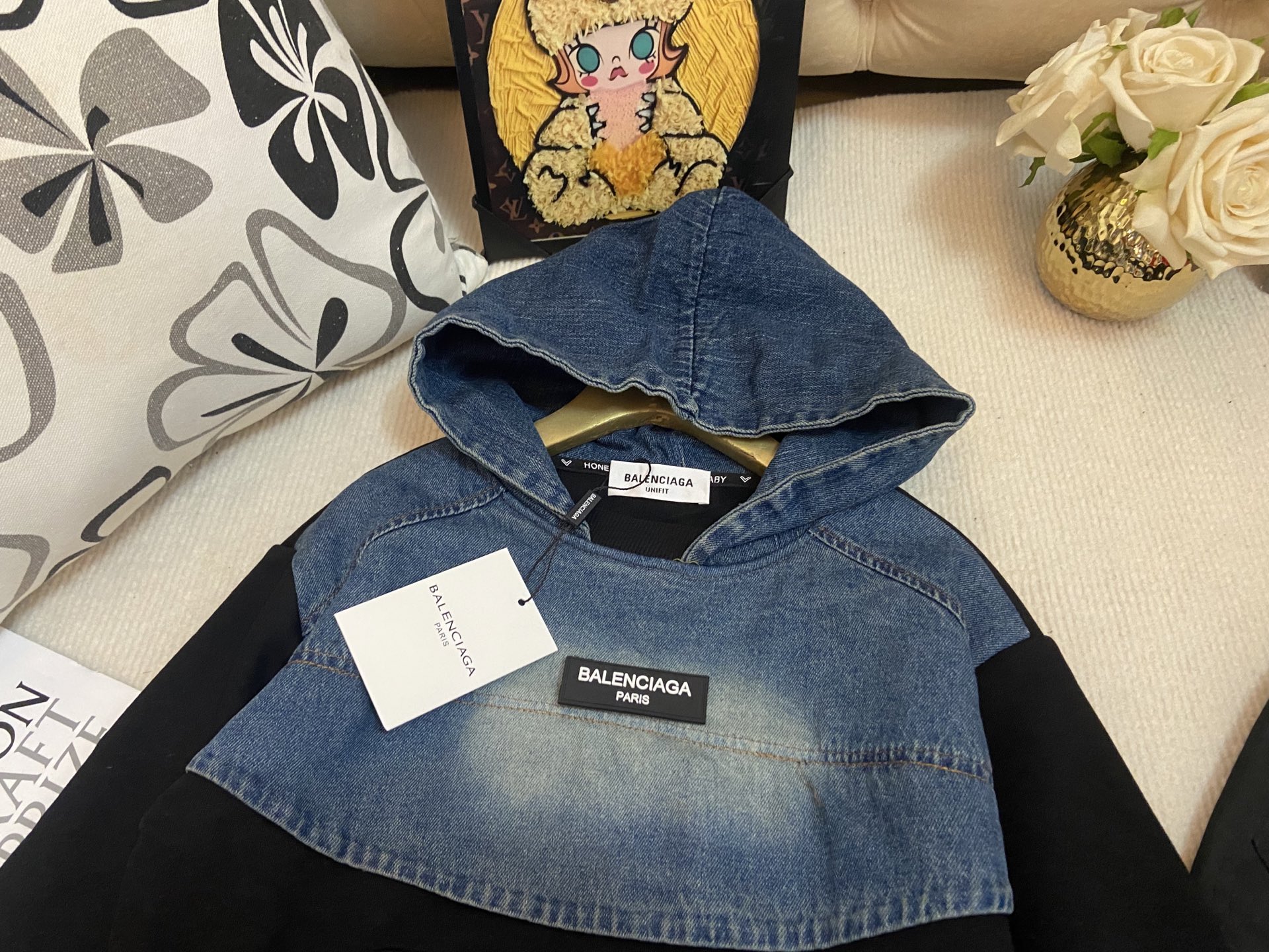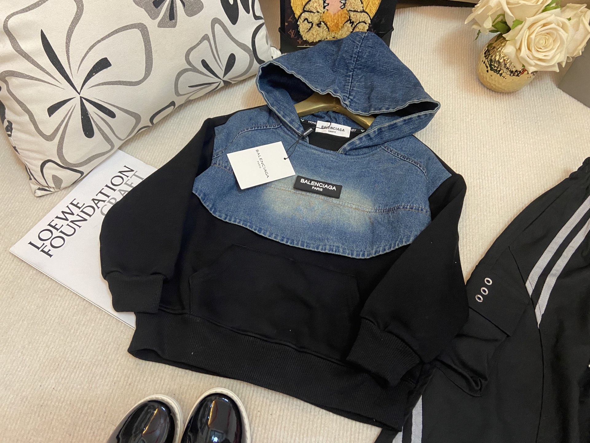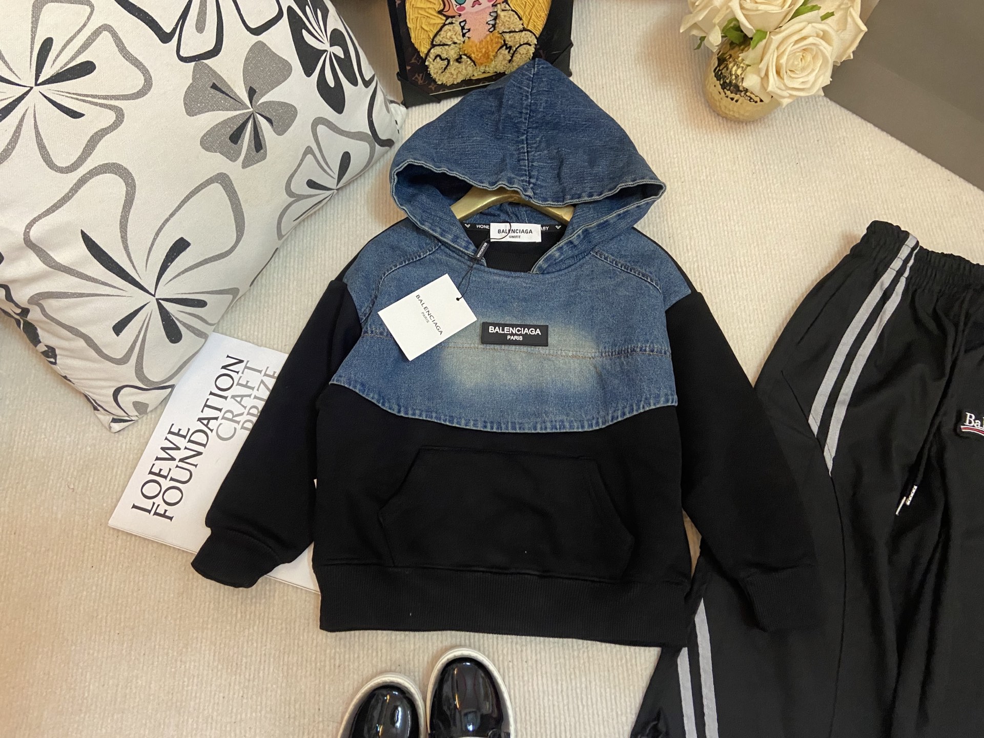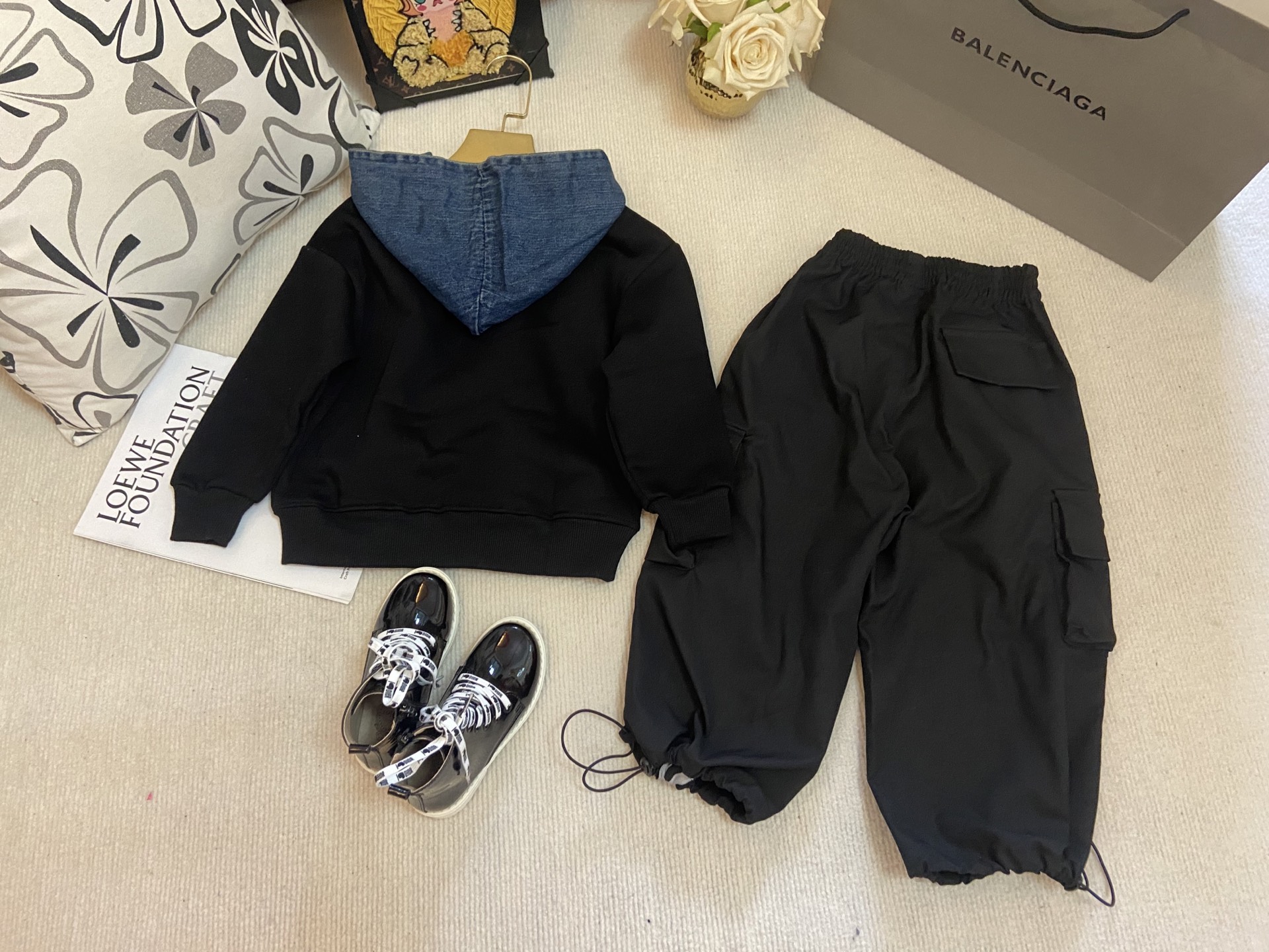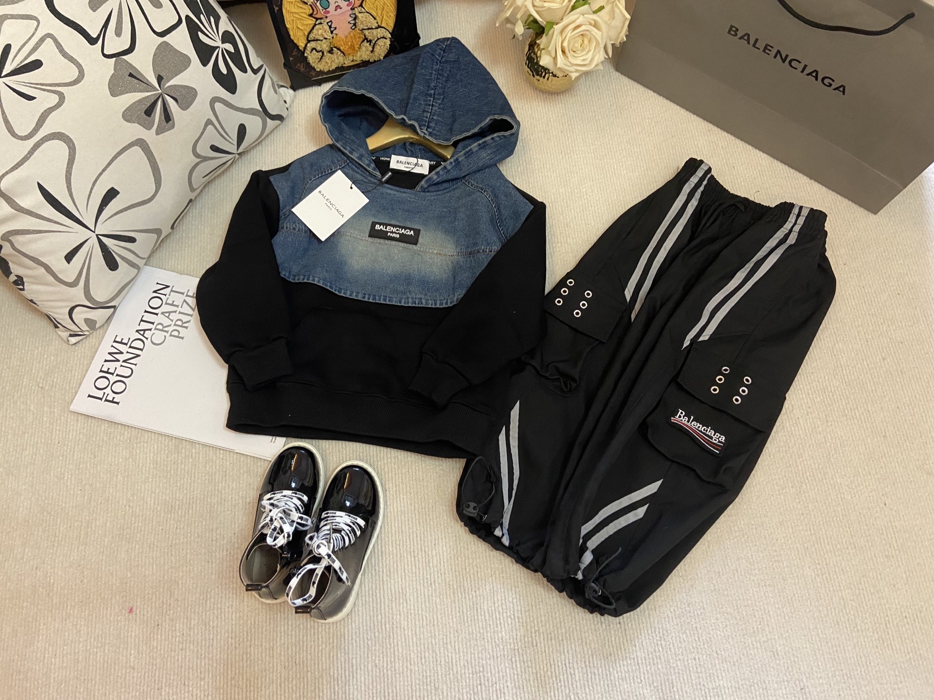 Elevate your child's style with this Balenciaga two-piece set. Features a stylish denim hoodie and comfortable cargo sweatpants.