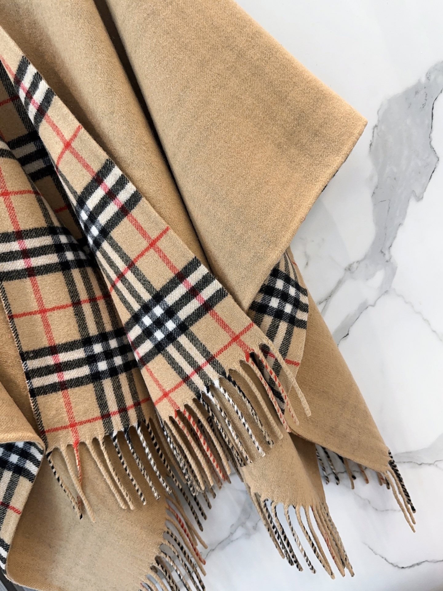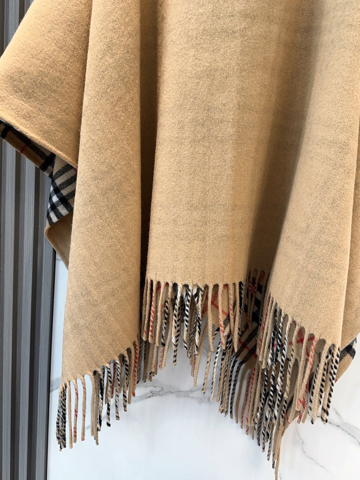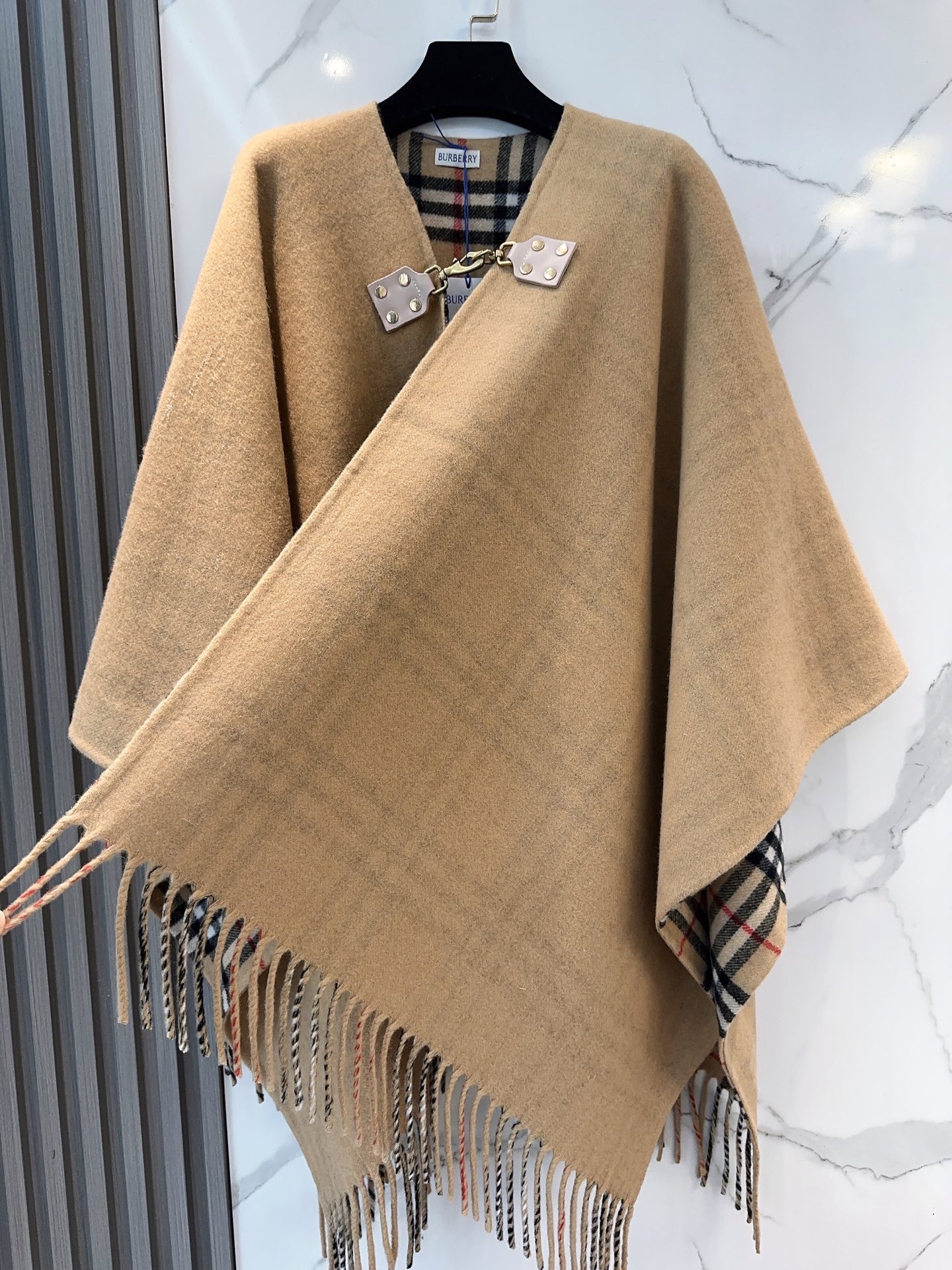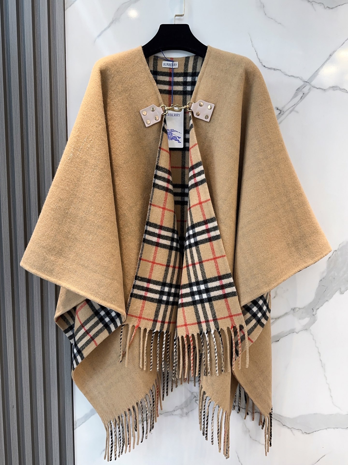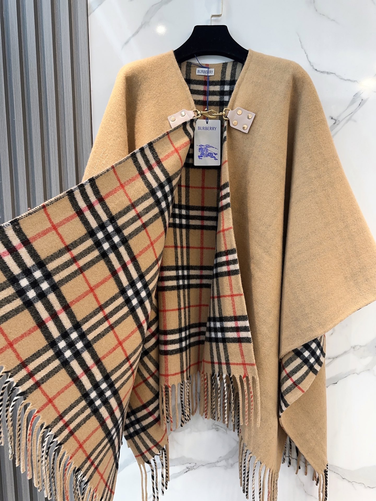 Elevate your style with this Burberry wool cape shawl. Features equestrian-inspired details, iconic check and solid color reversible design. Versatile as a cape, shawl, or top.