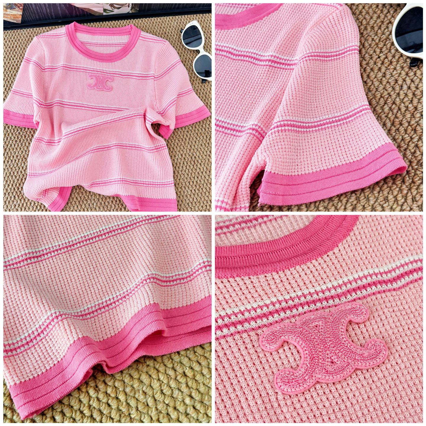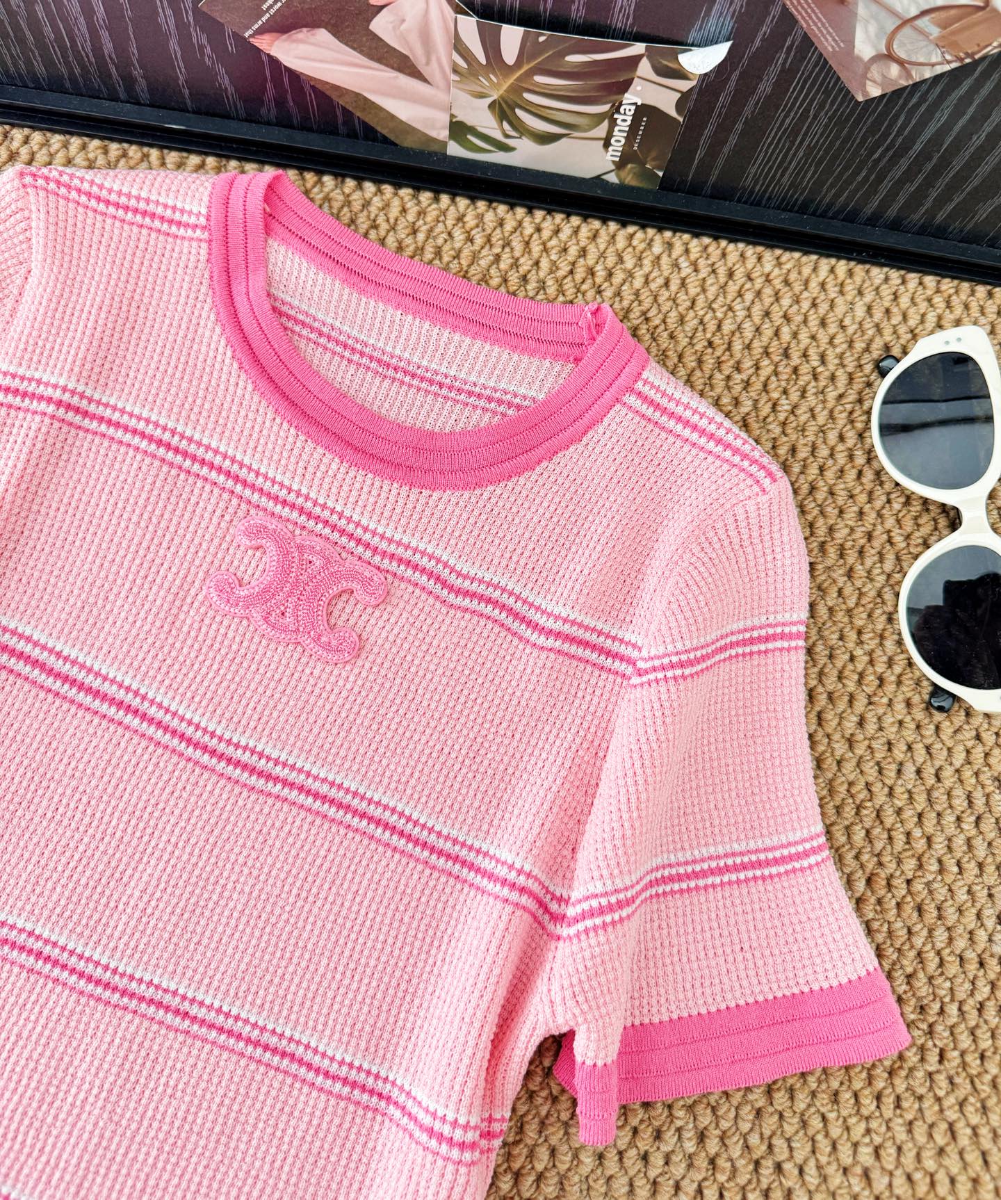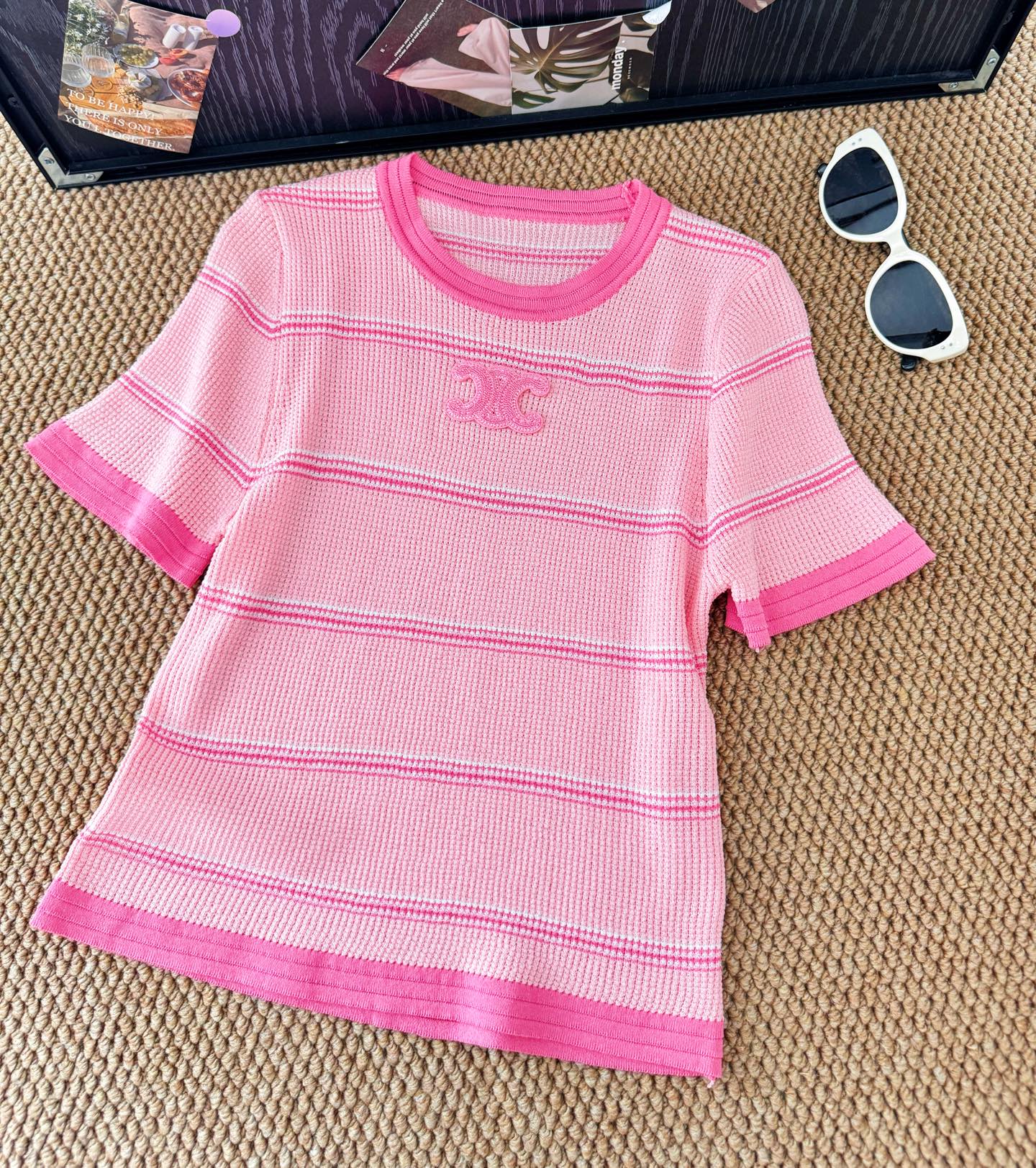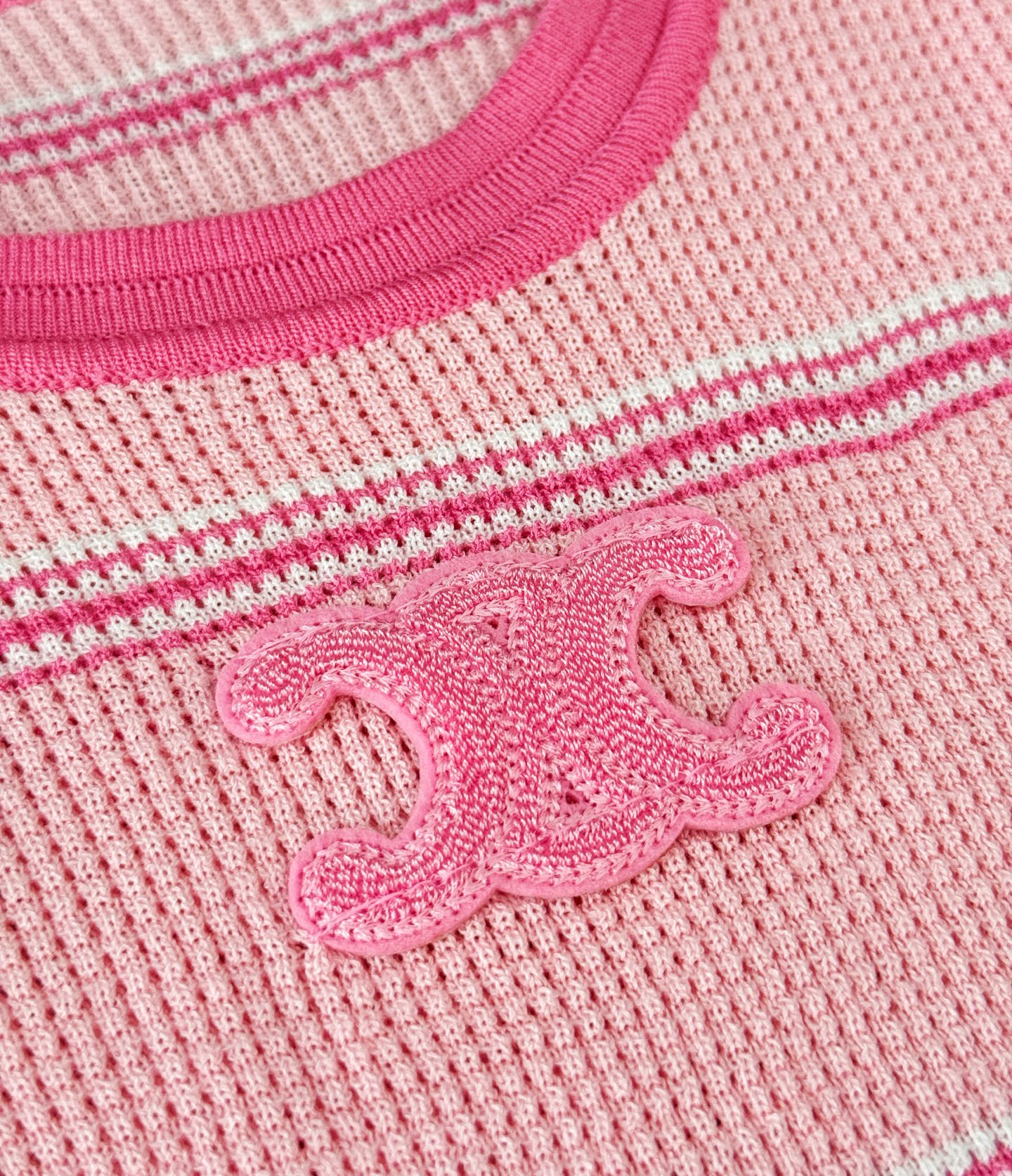 Sweet pink striped knit tee with Celine's Triomphe logo. Soft, comfortable, and perfect for adding a touch of luxury to your casual look. Shop now!