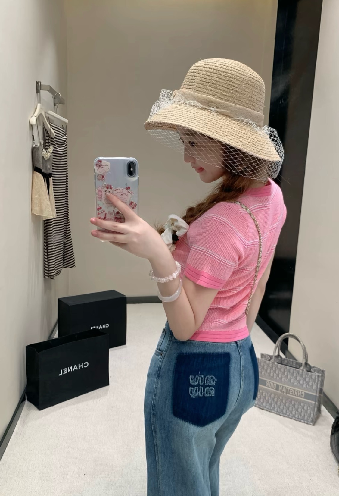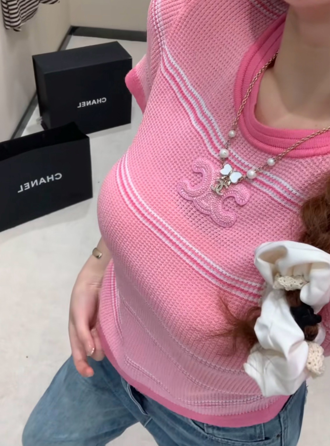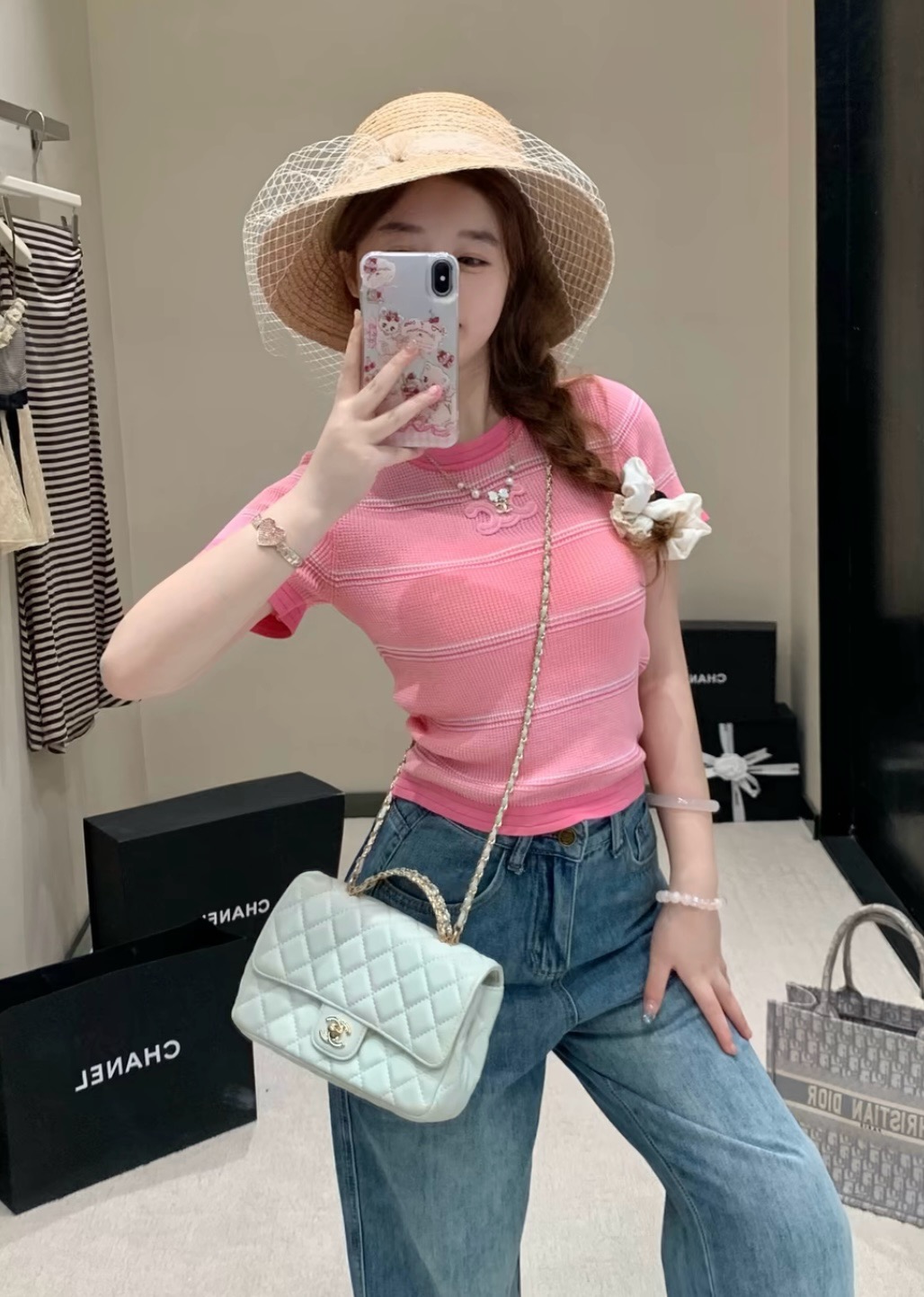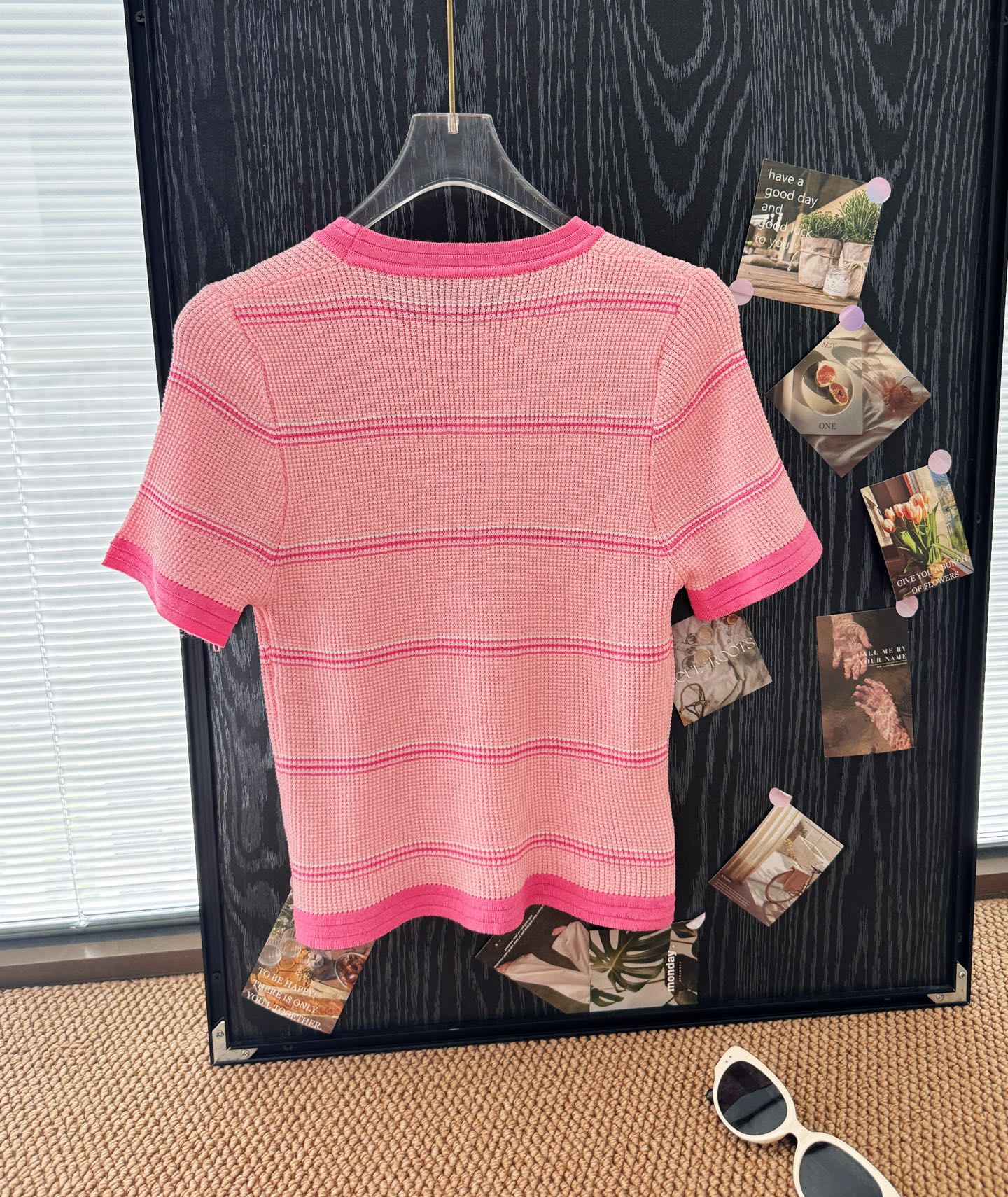 Sweet pink striped knit tee with Celine's Triomphe logo. Soft, comfortable, and perfect for adding a touch of luxury to your casual look. Shop now!