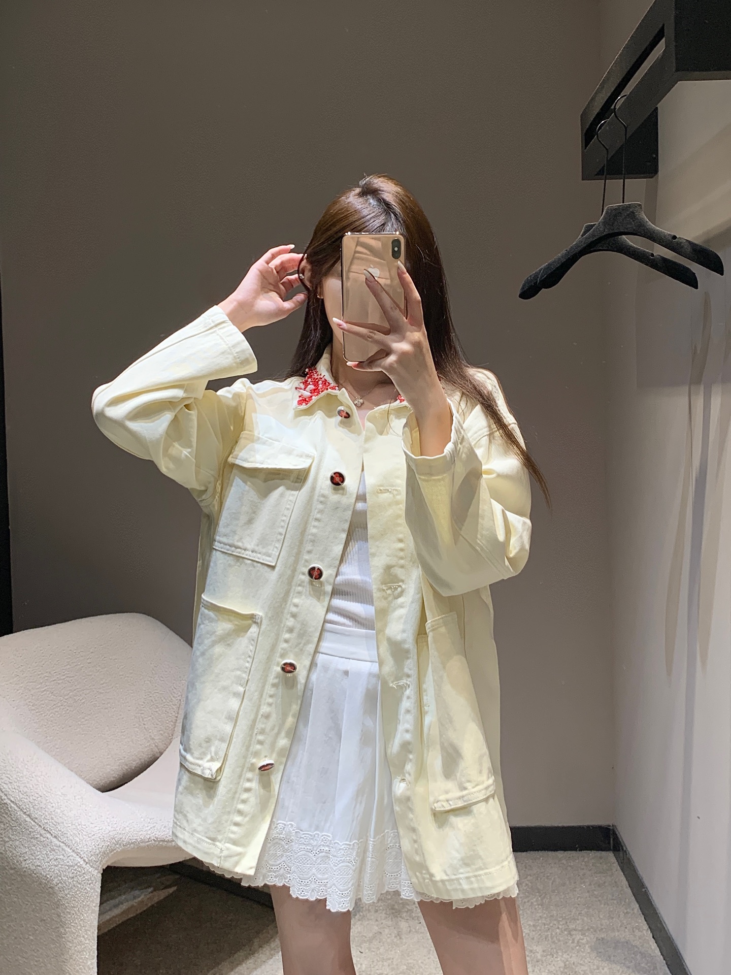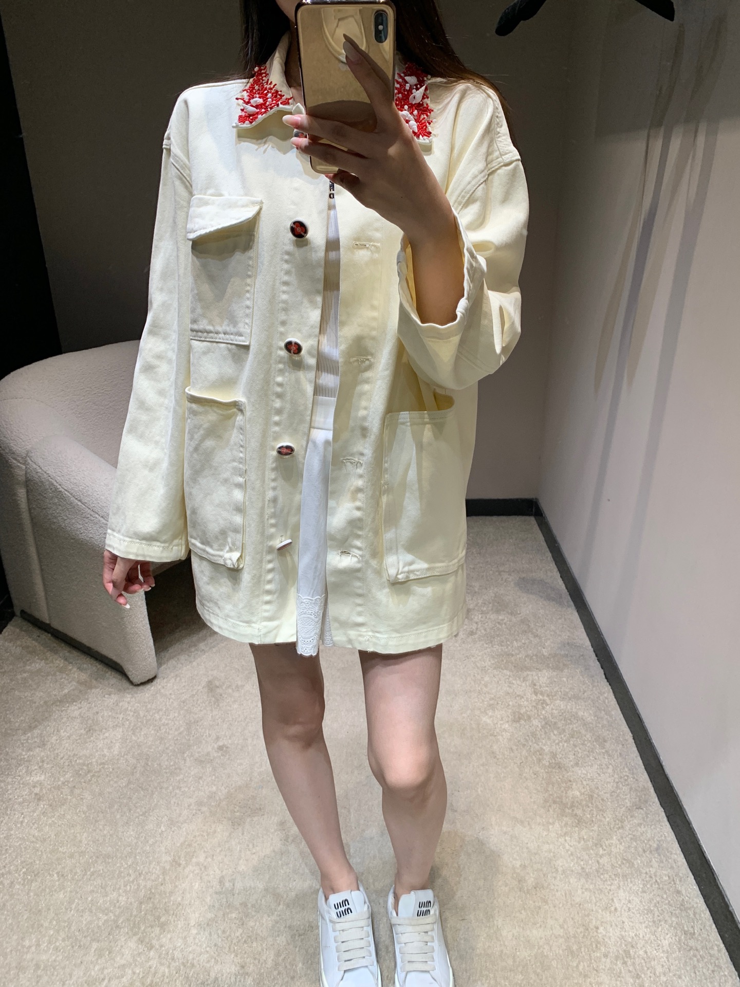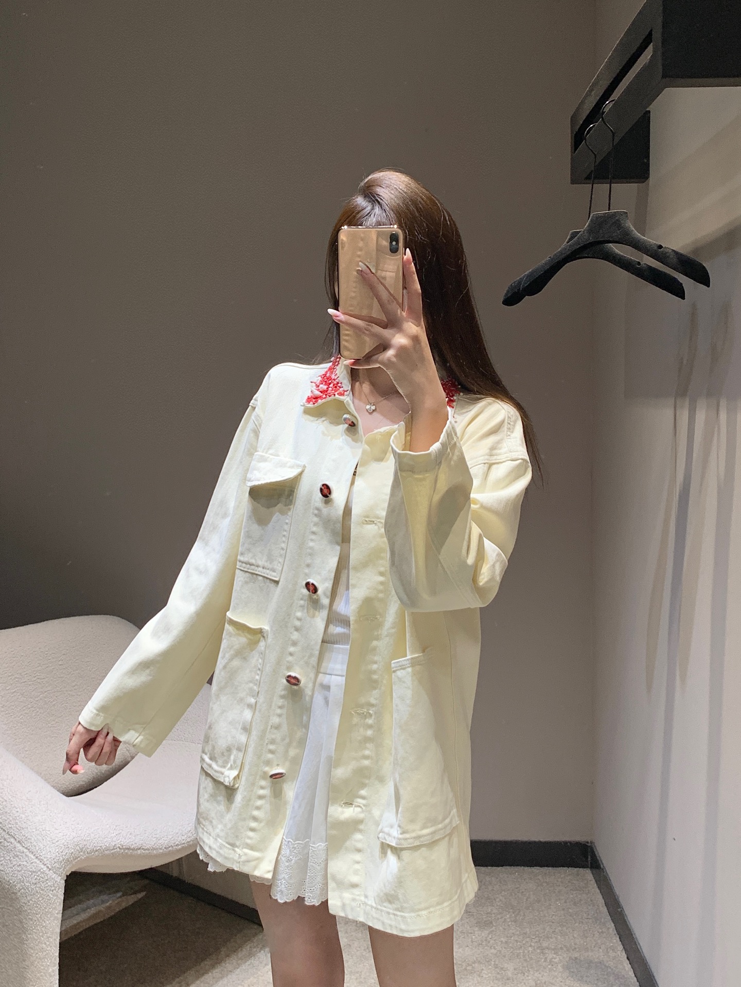 This Chanel-inspired denim jacket combines classic style with unique detailing. The soft yellow denim and delicate embroidered collar make it a standout piece.
