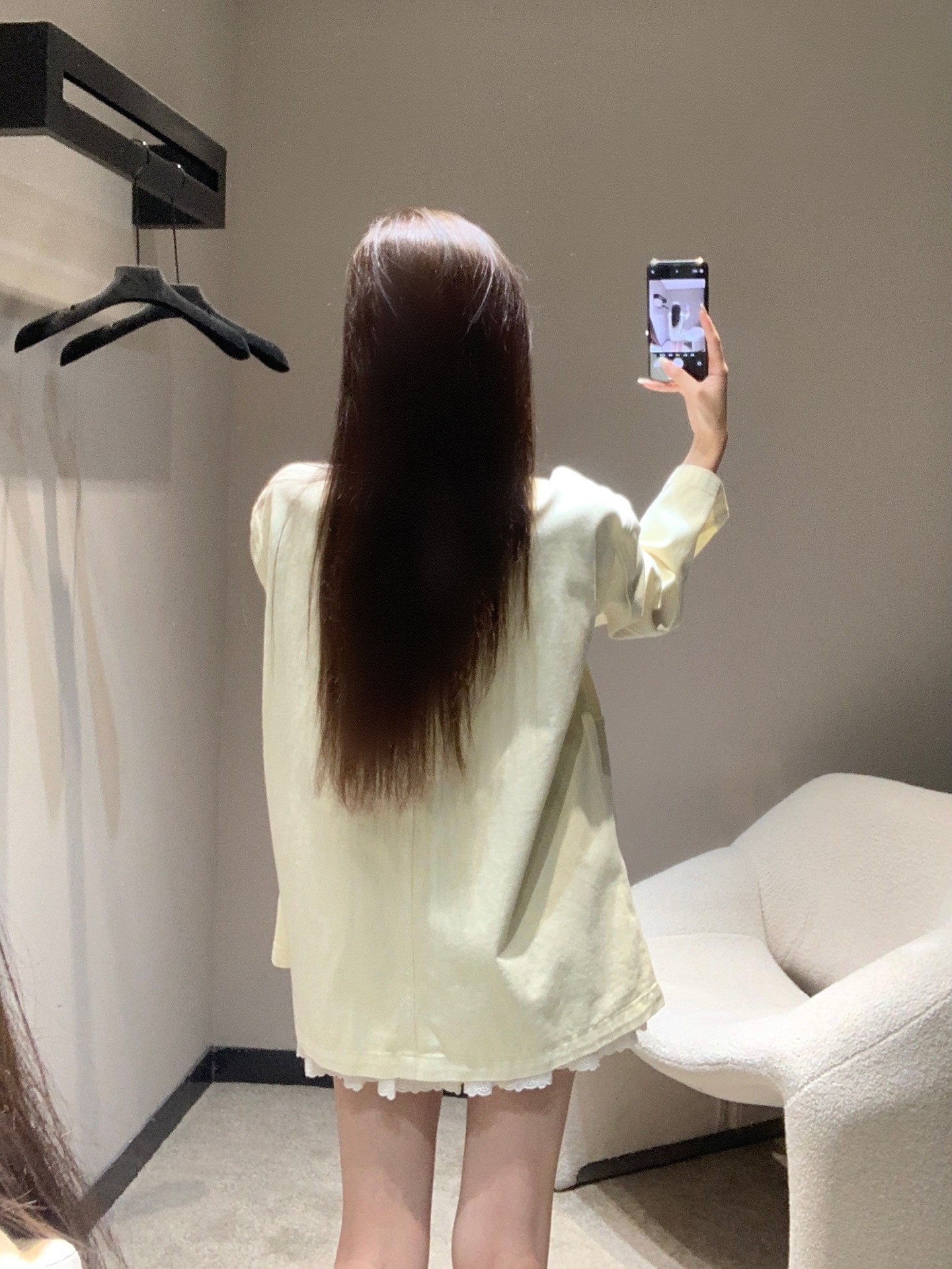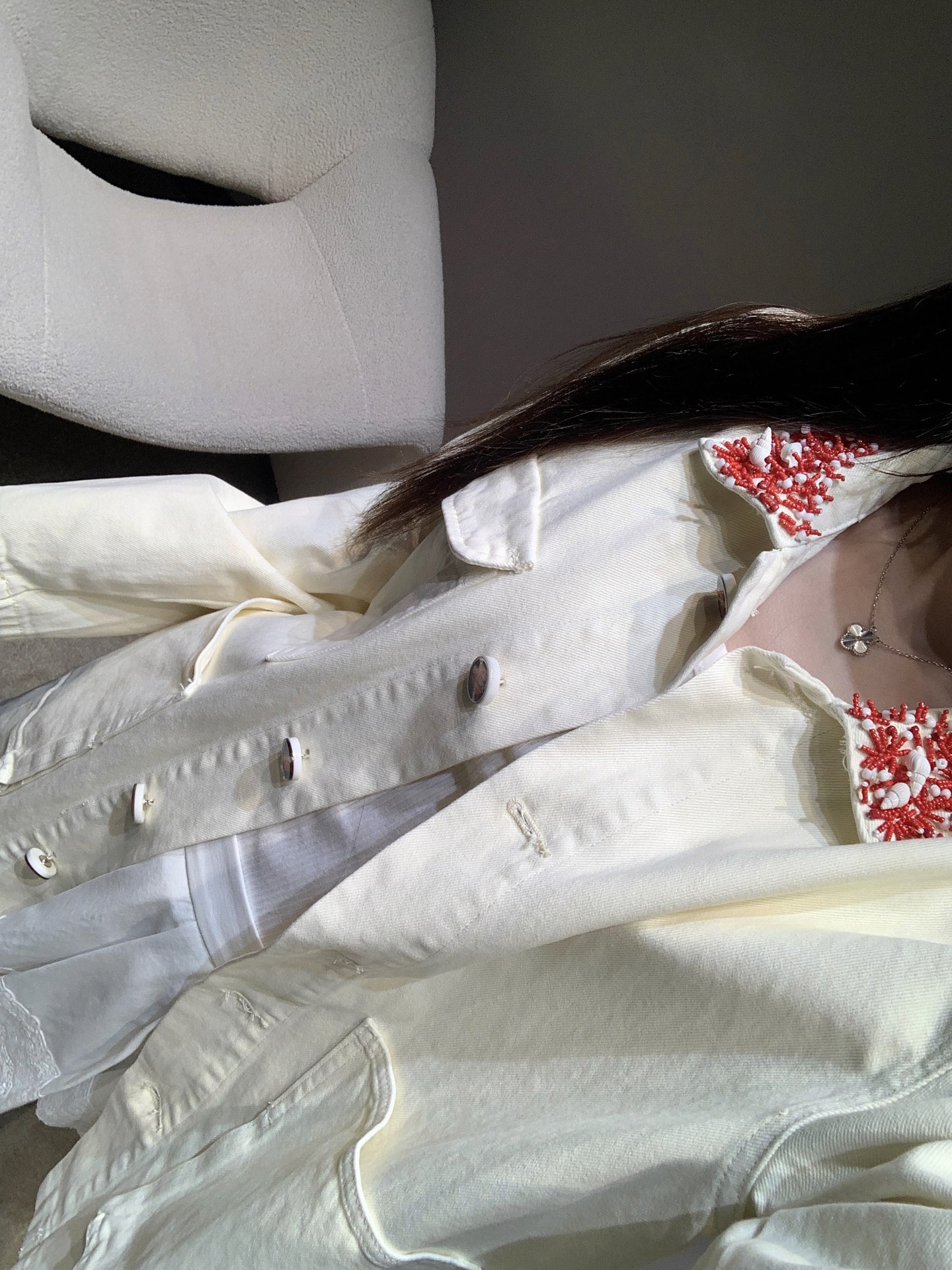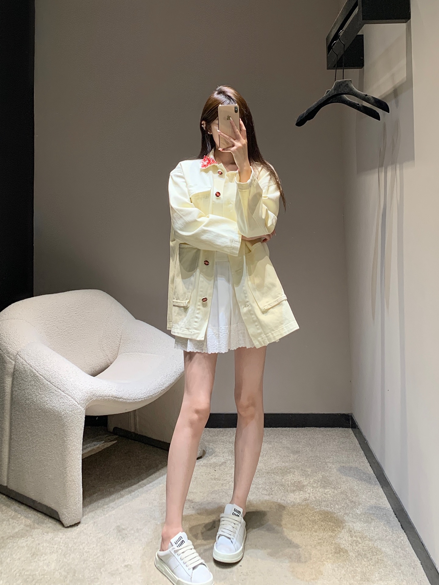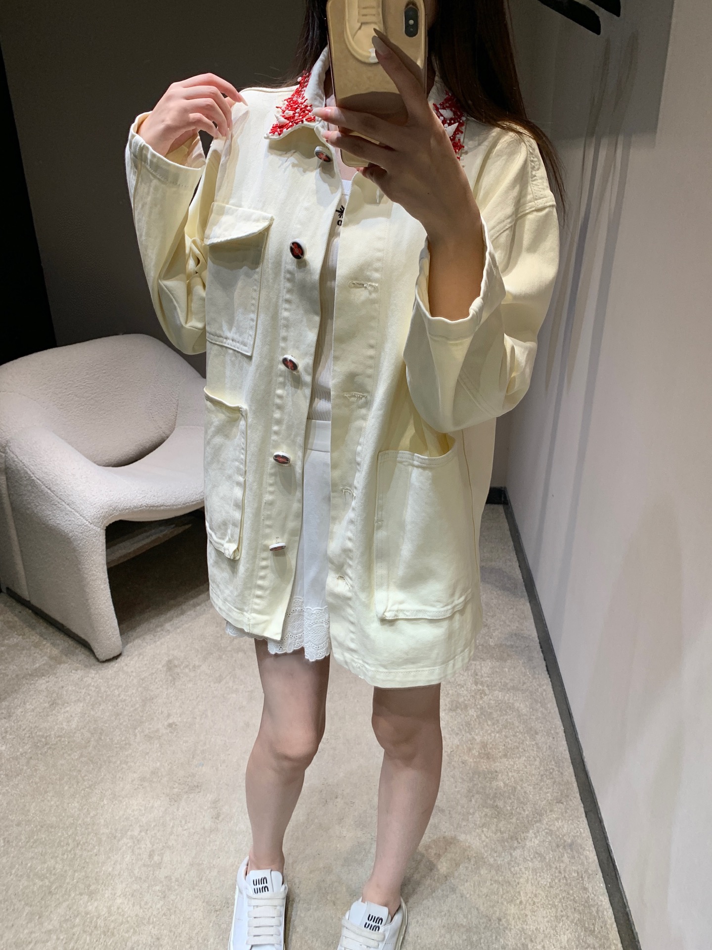 This Chanel-inspired denim jacket combines classic style with unique detailing. The soft yellow denim and delicate embroidered collar make it a standout piece.