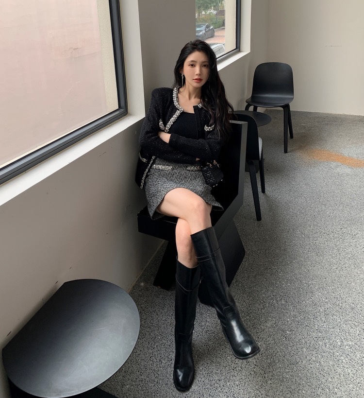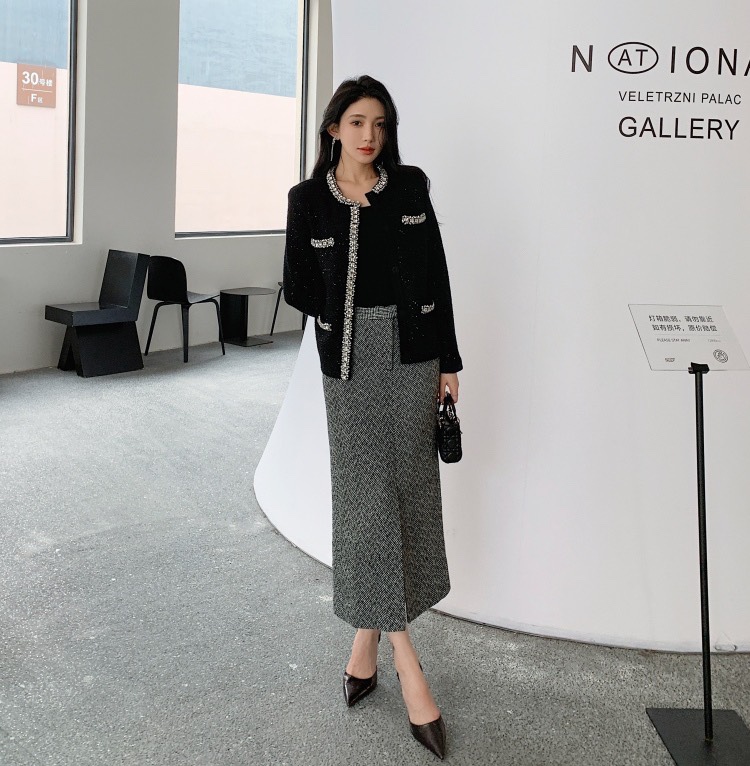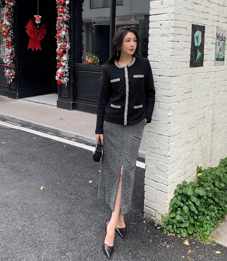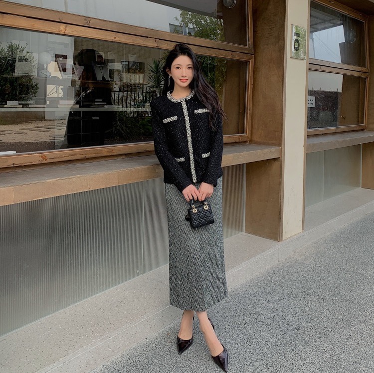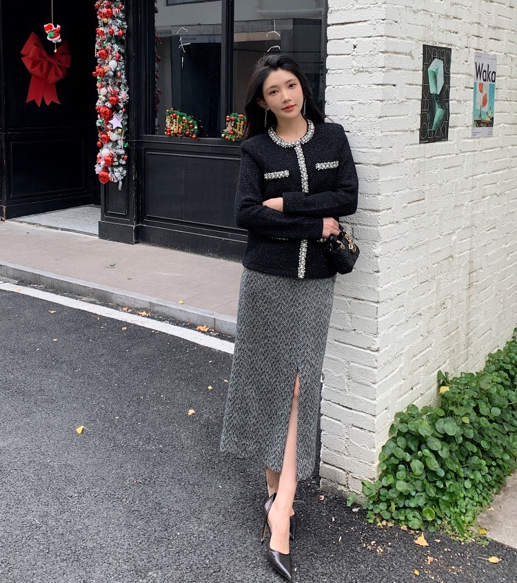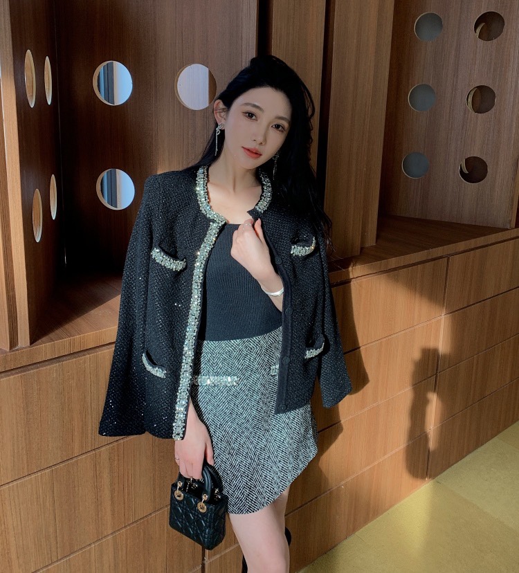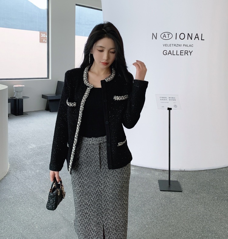 Elevate your wardrobe with this chic black tweed jacket. Features a stylish round neck and exquisite rhinestone detailing.