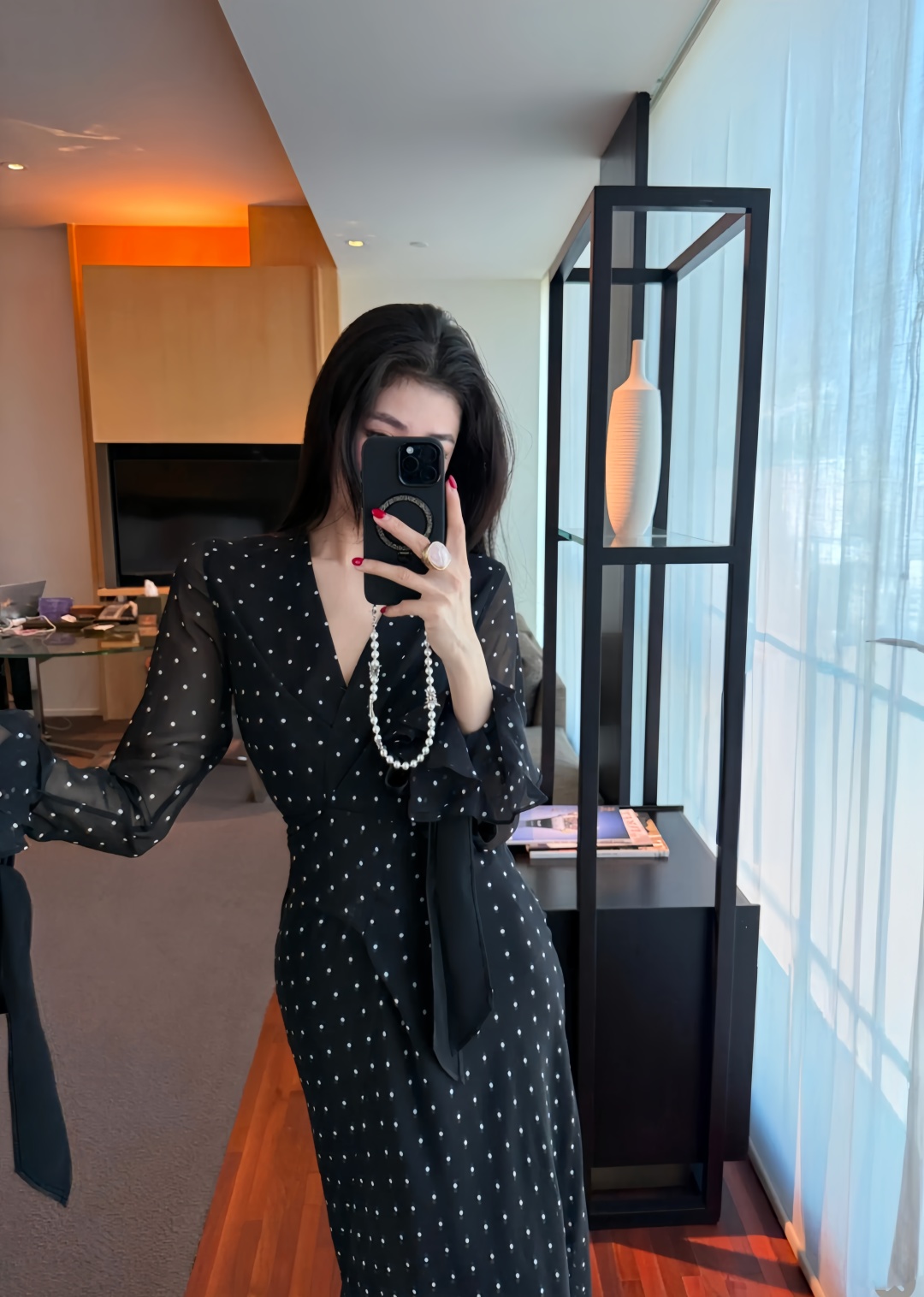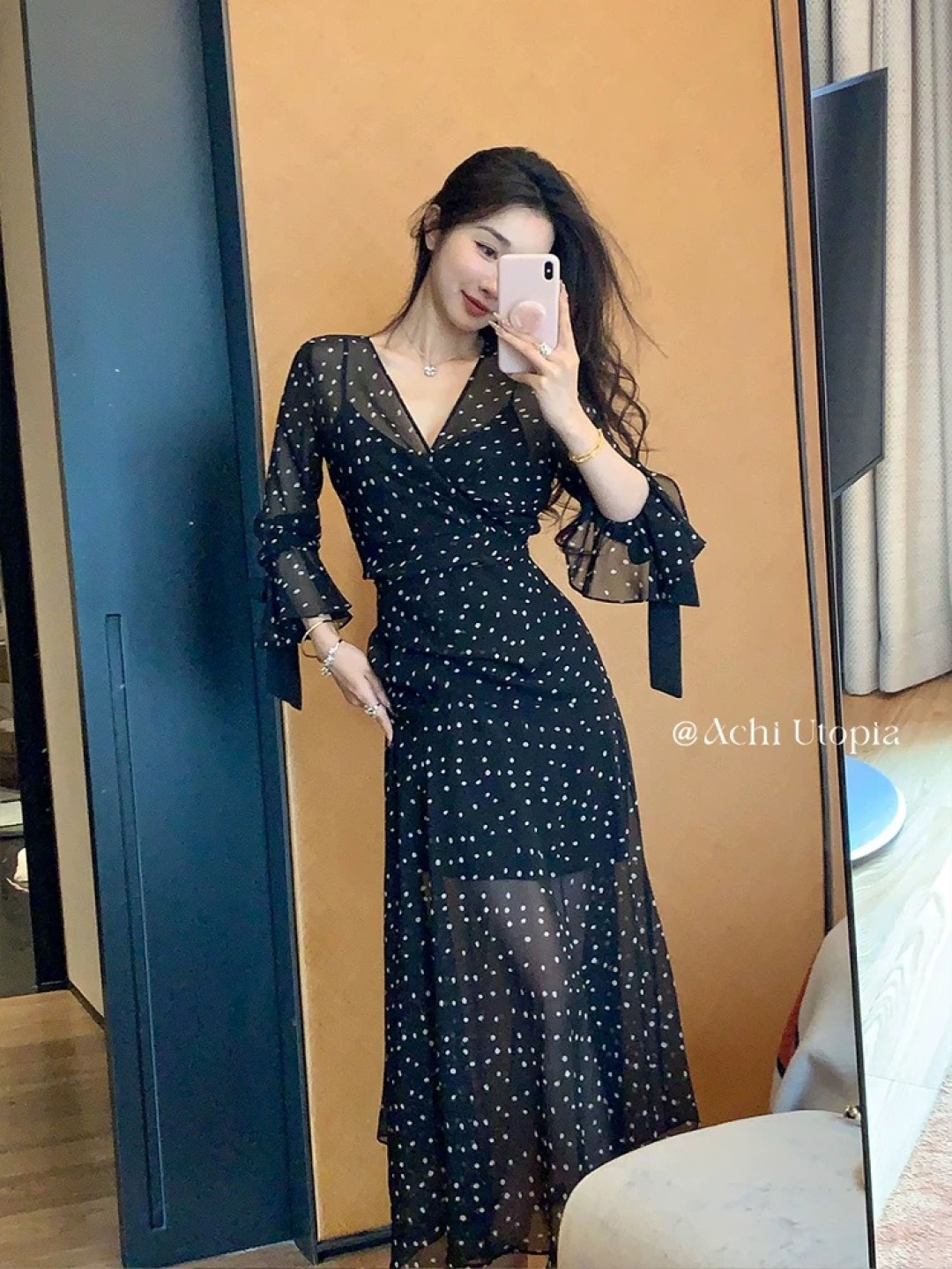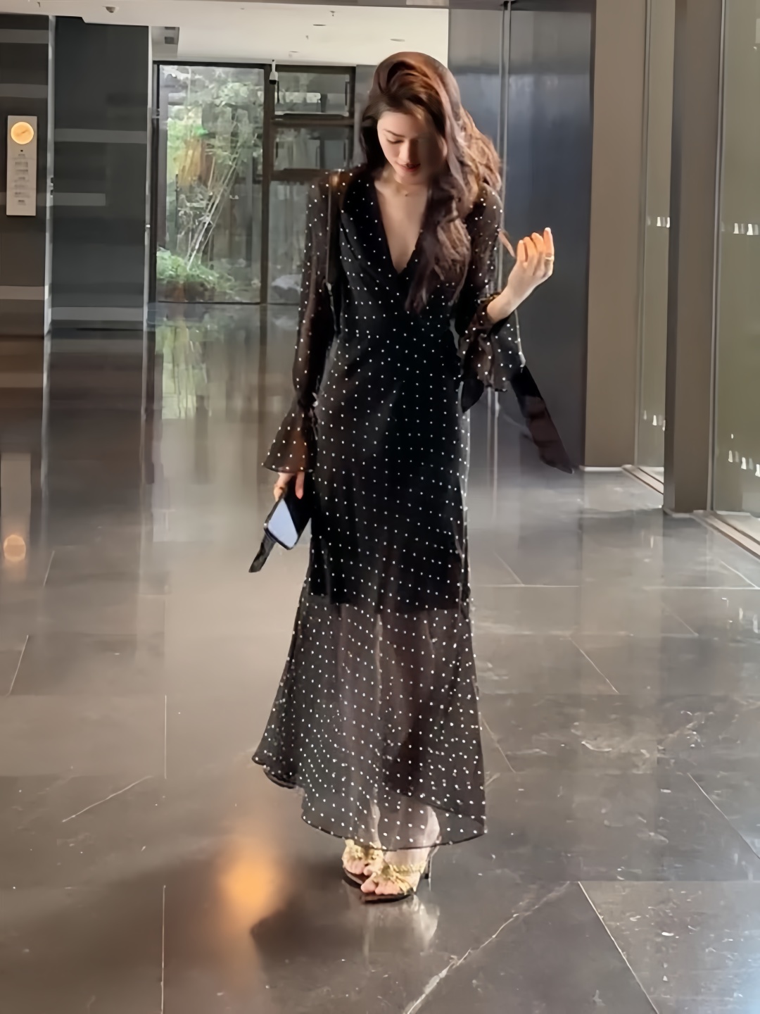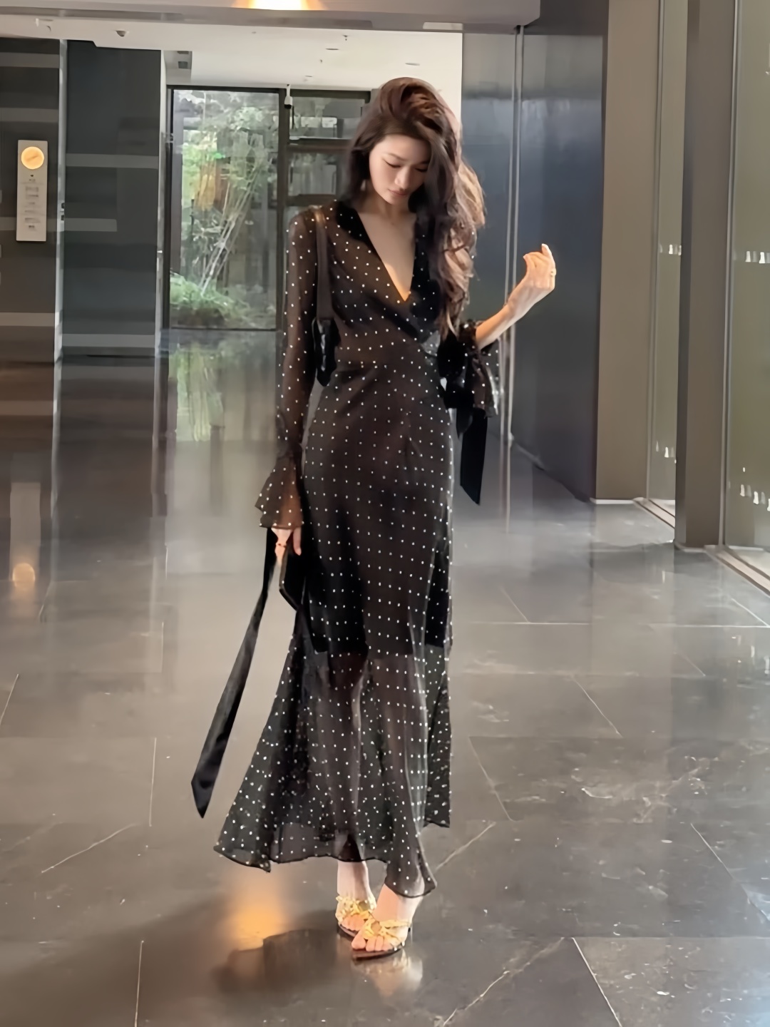 Elegant Women's V-Neck Polka Dot Chiffon Maxi Dress with Long Sleeves