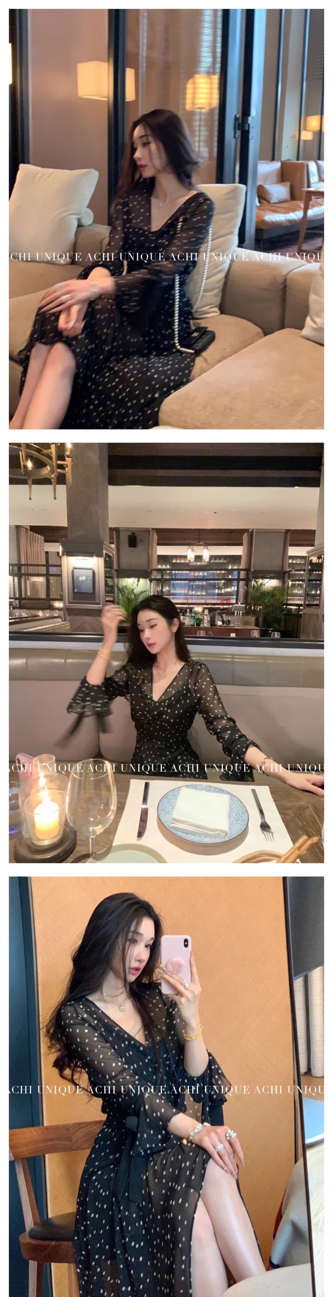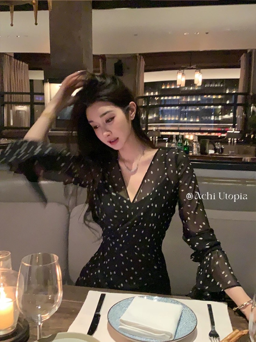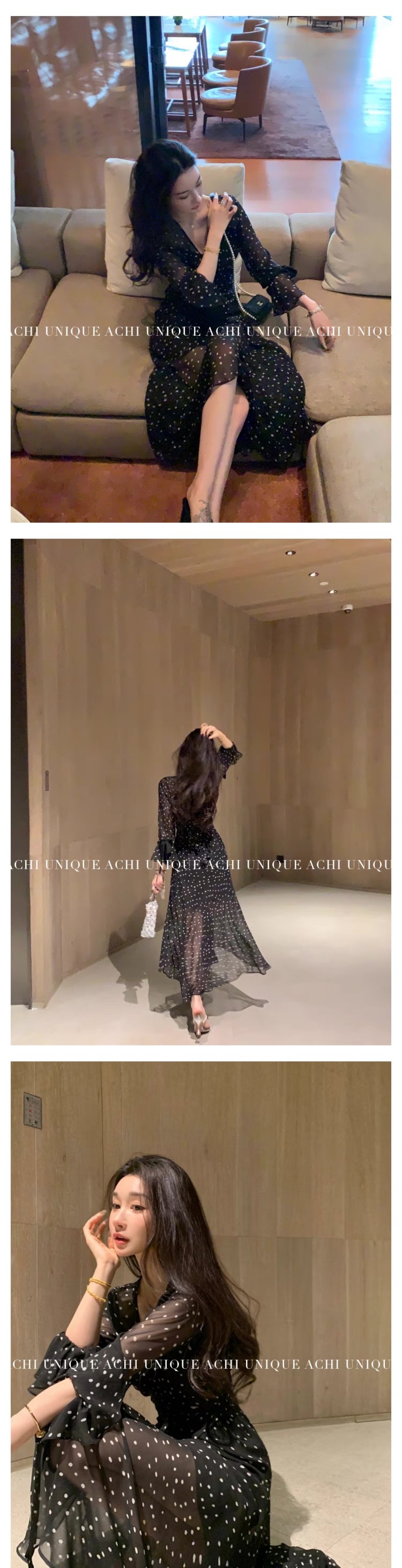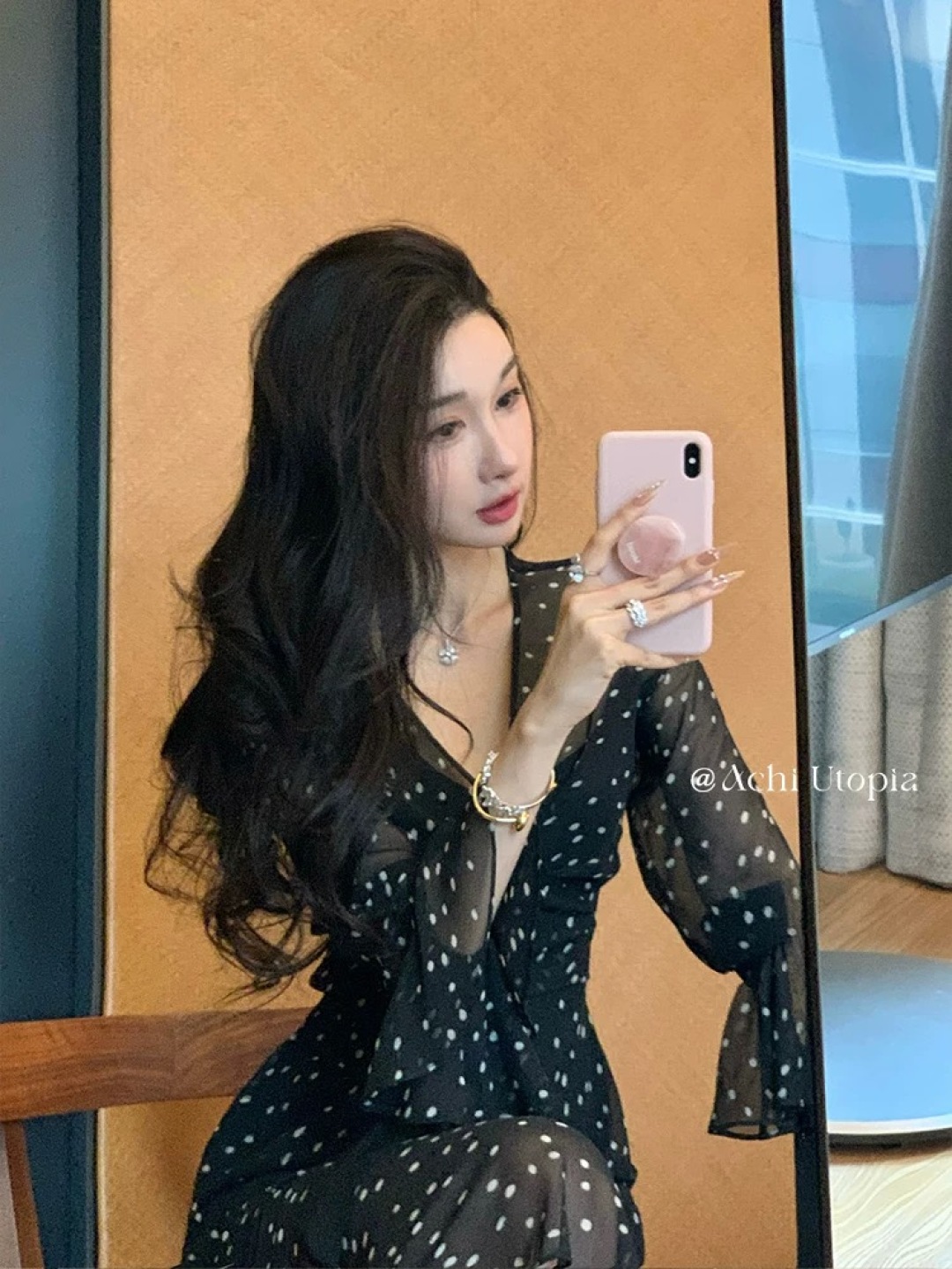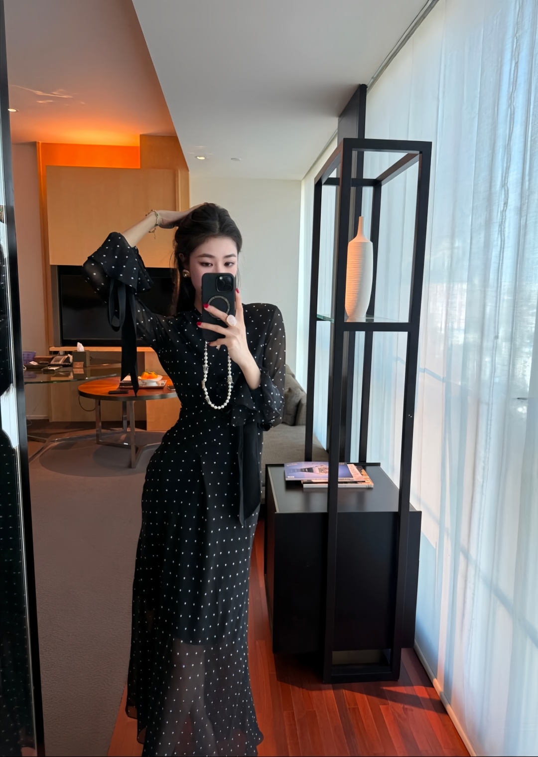 Elegant Women's V-Neck Polka Dot Chiffon Maxi Dress with Long Sleeves