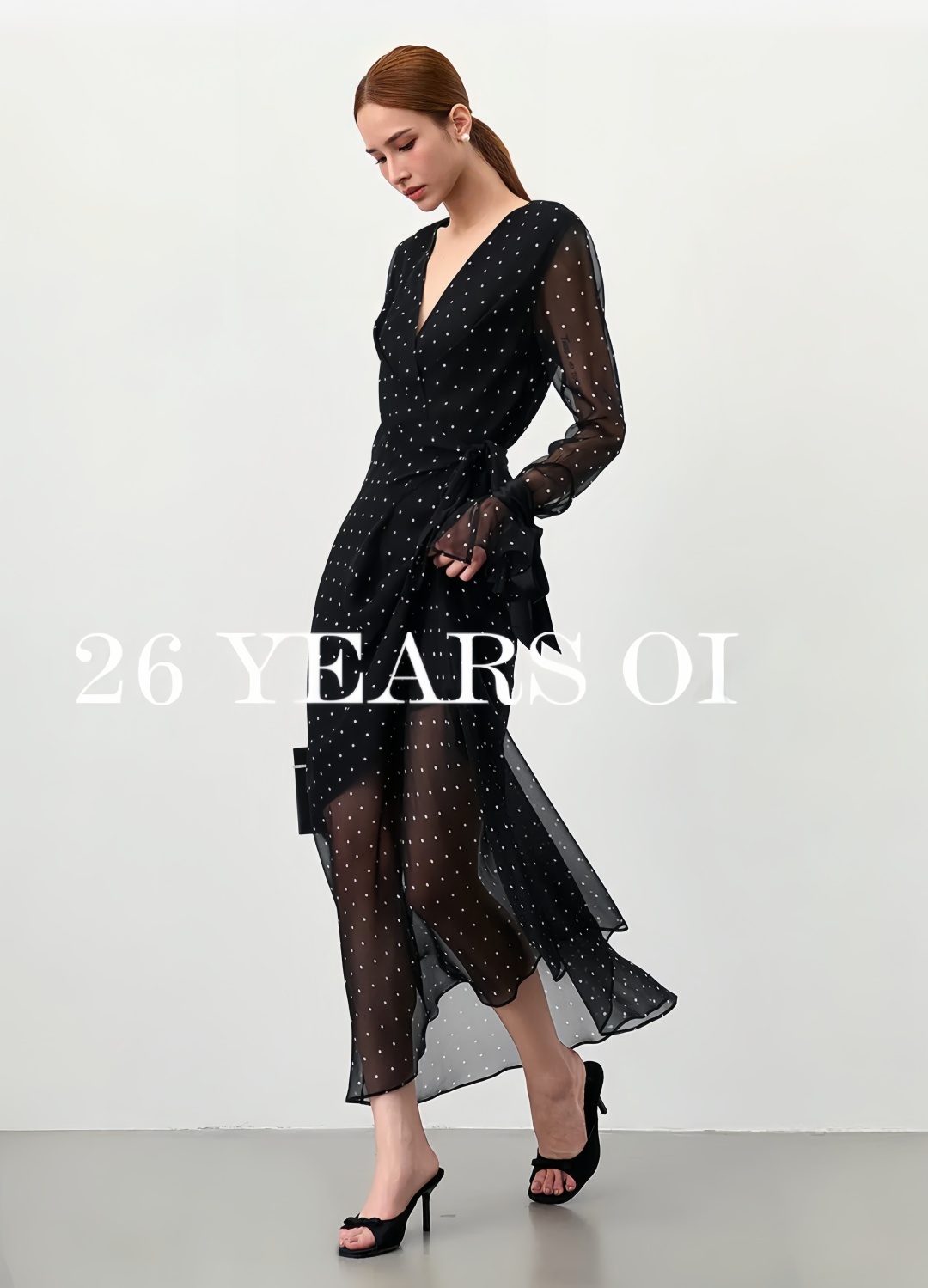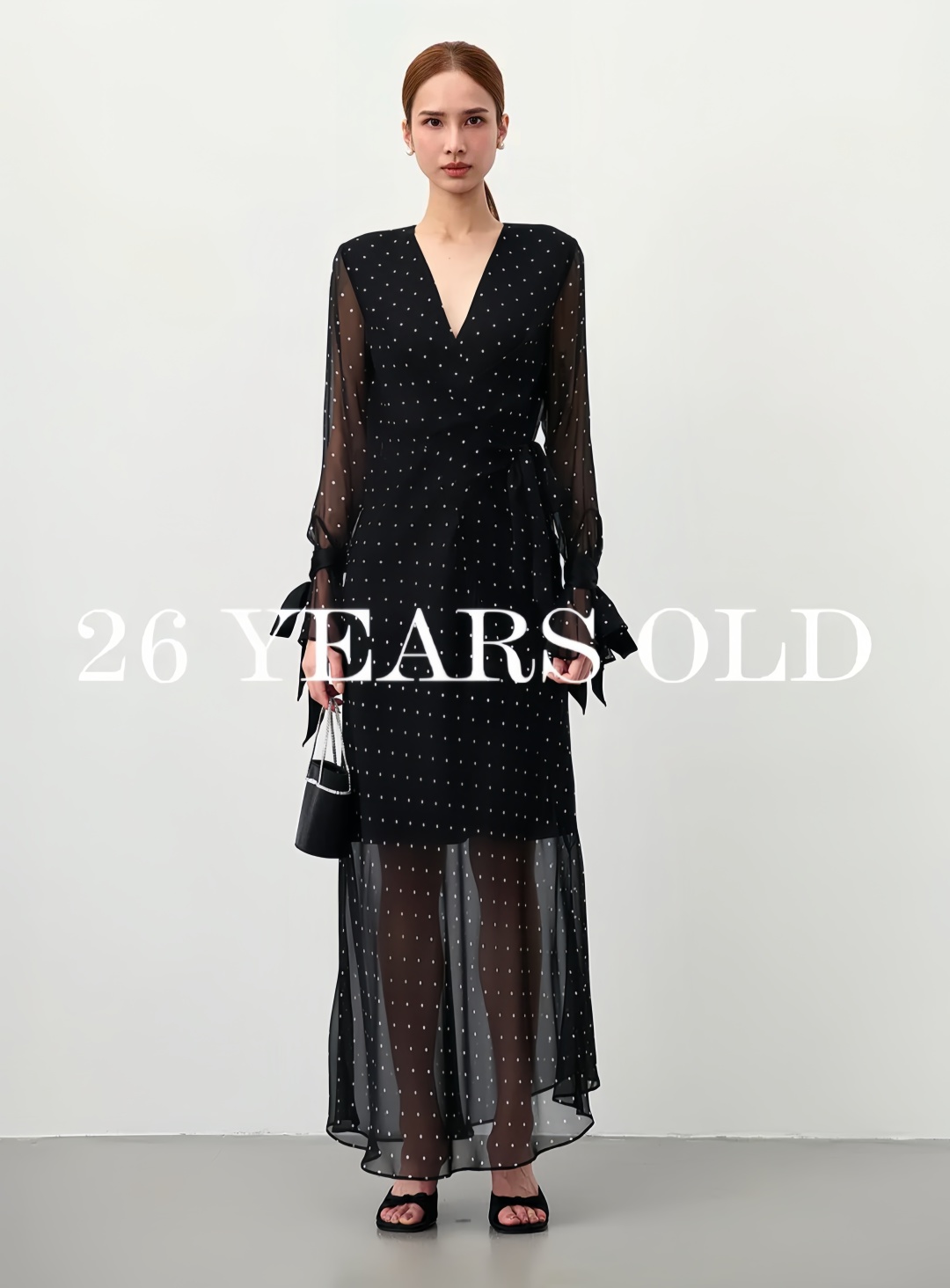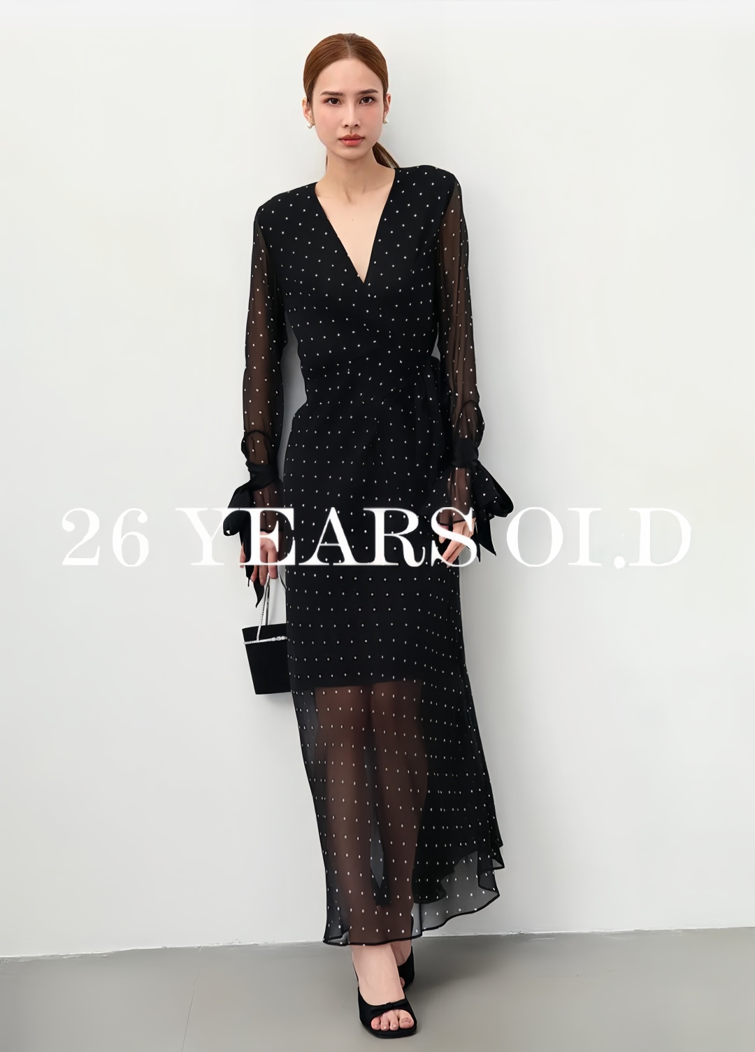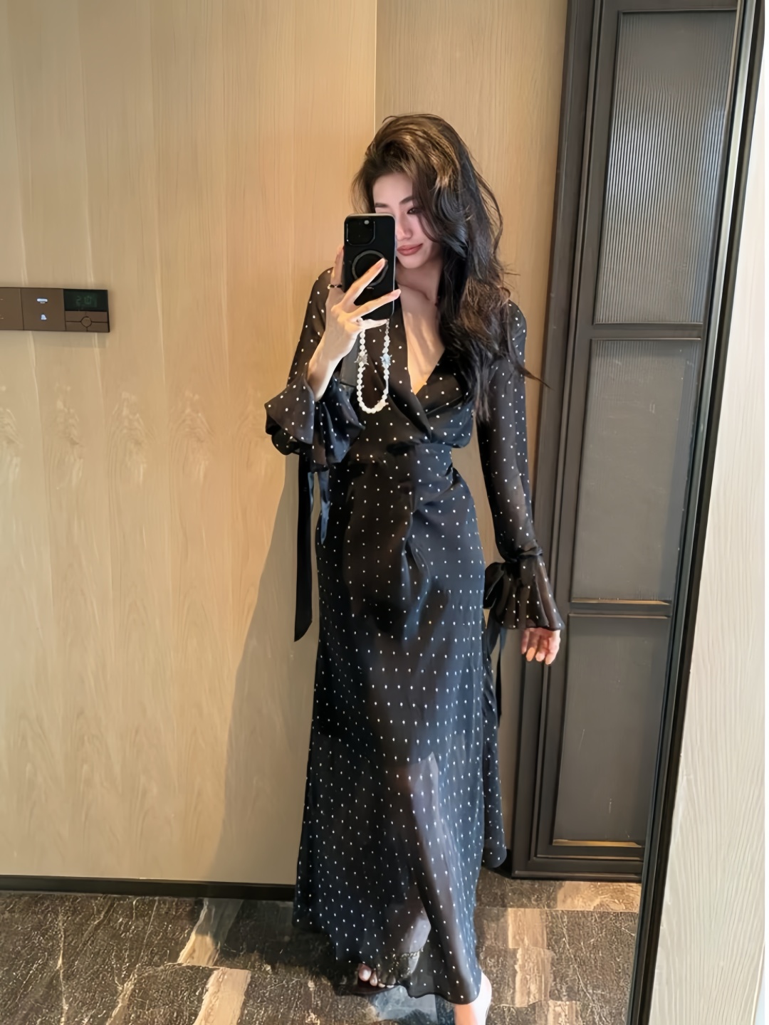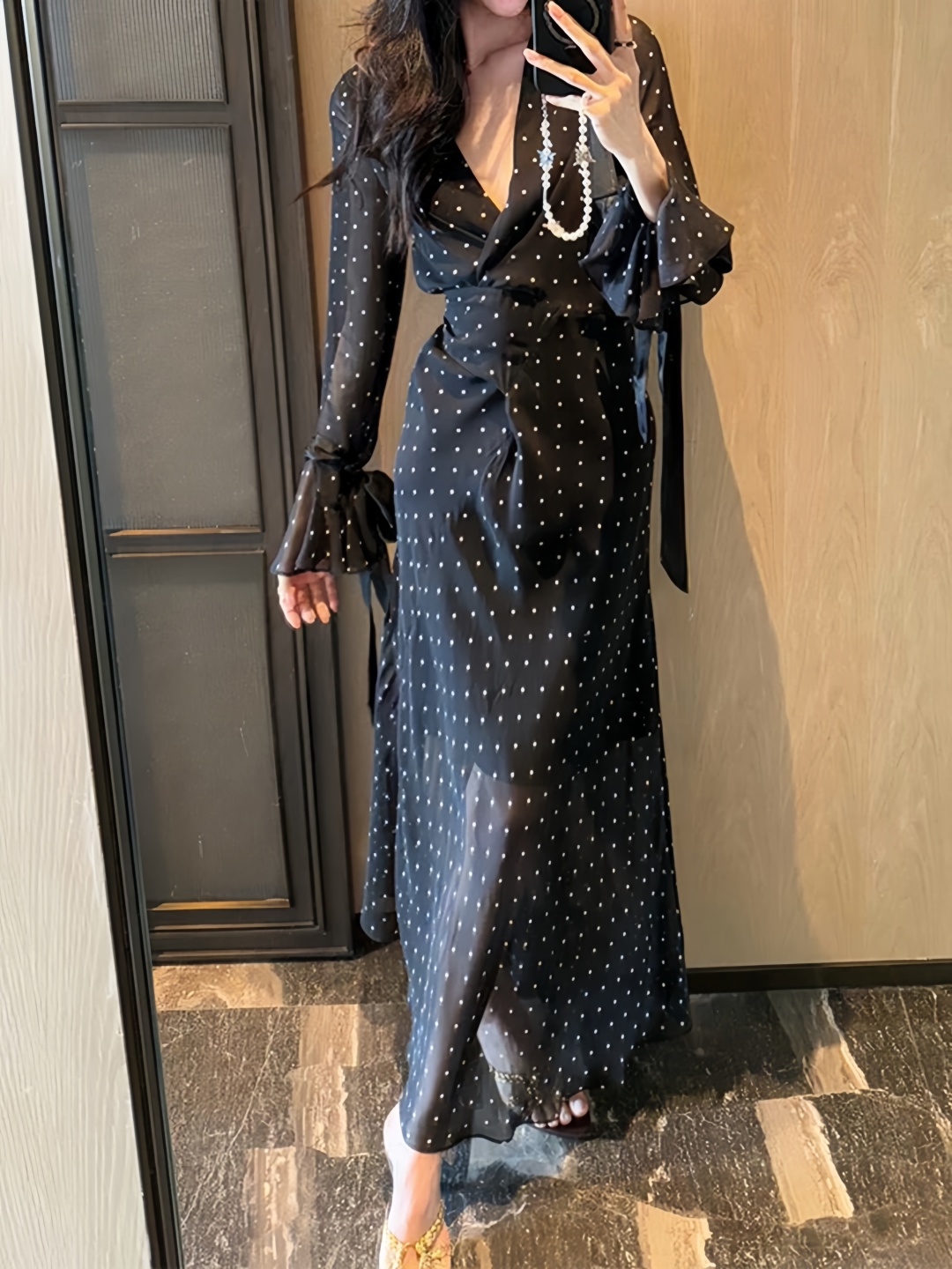 Chic polka dot maxi dress featuring a flattering V-neck, long sleeves, and a graceful, flowing design for a timeless, elegant look.
