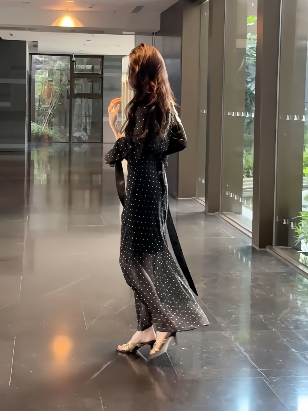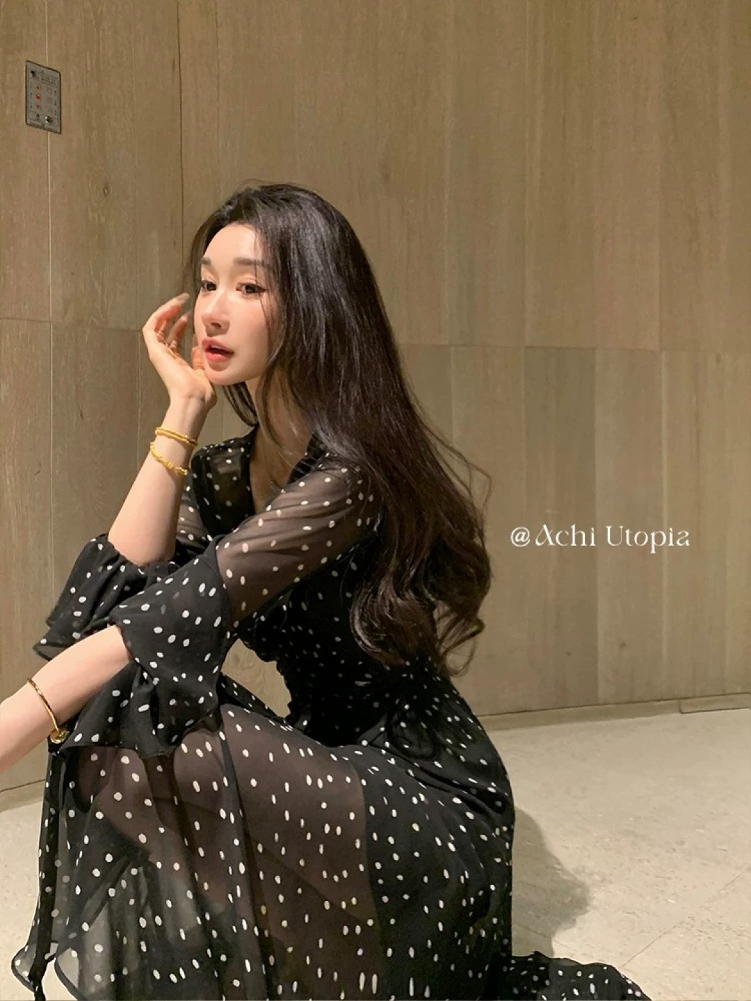 This stunning polka dot maxi dress combines classic elegance with modern design, making it a versatile addition to any wardrobe.