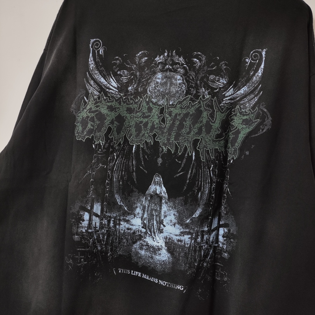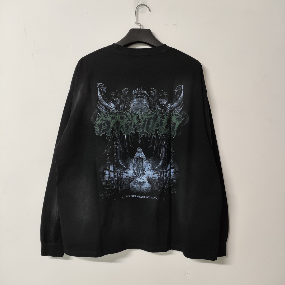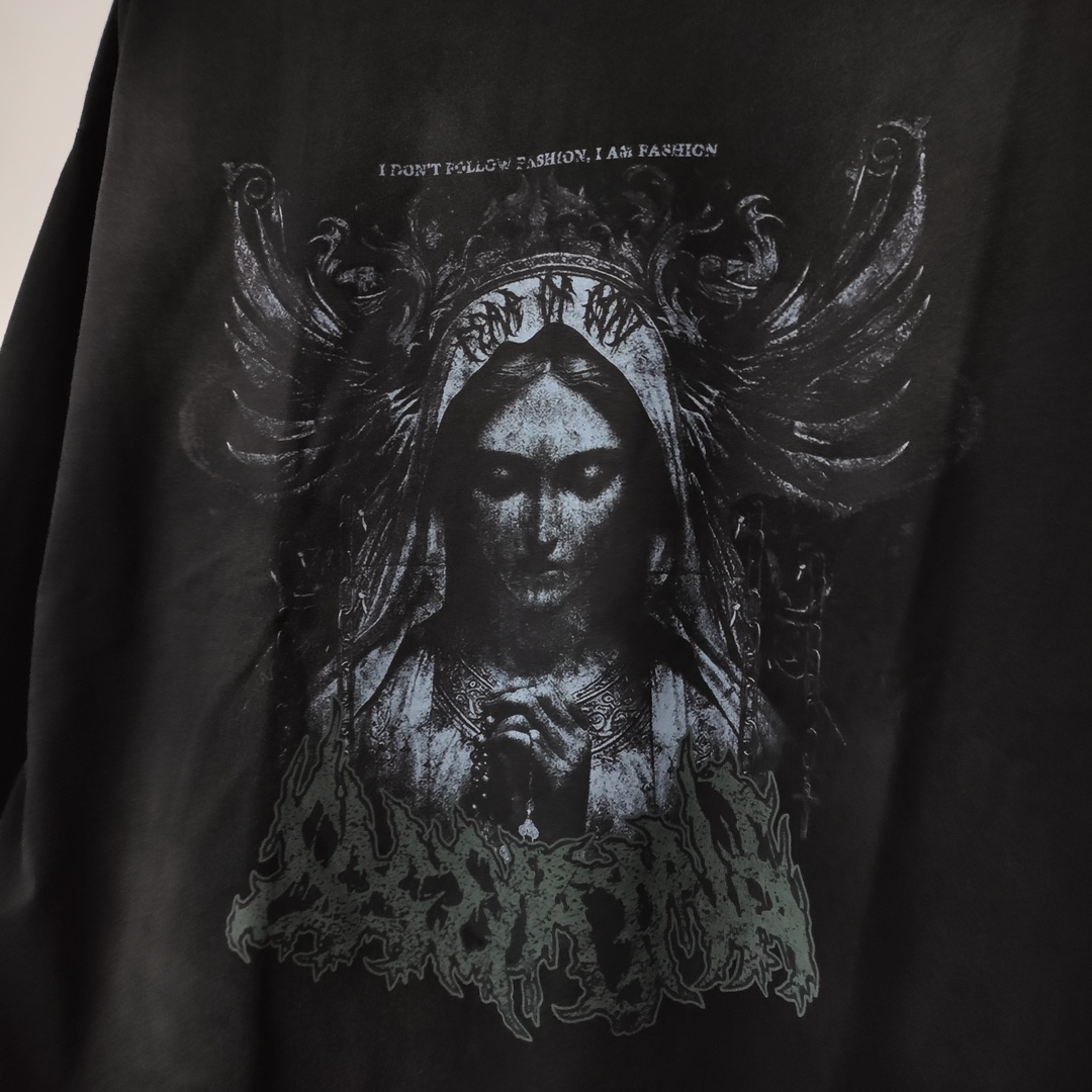 Vintage-inspired black long sleeve tee with unique gothic graphic design. Comfortable, oversized fit. Perfect for streetwear enthusiasts.