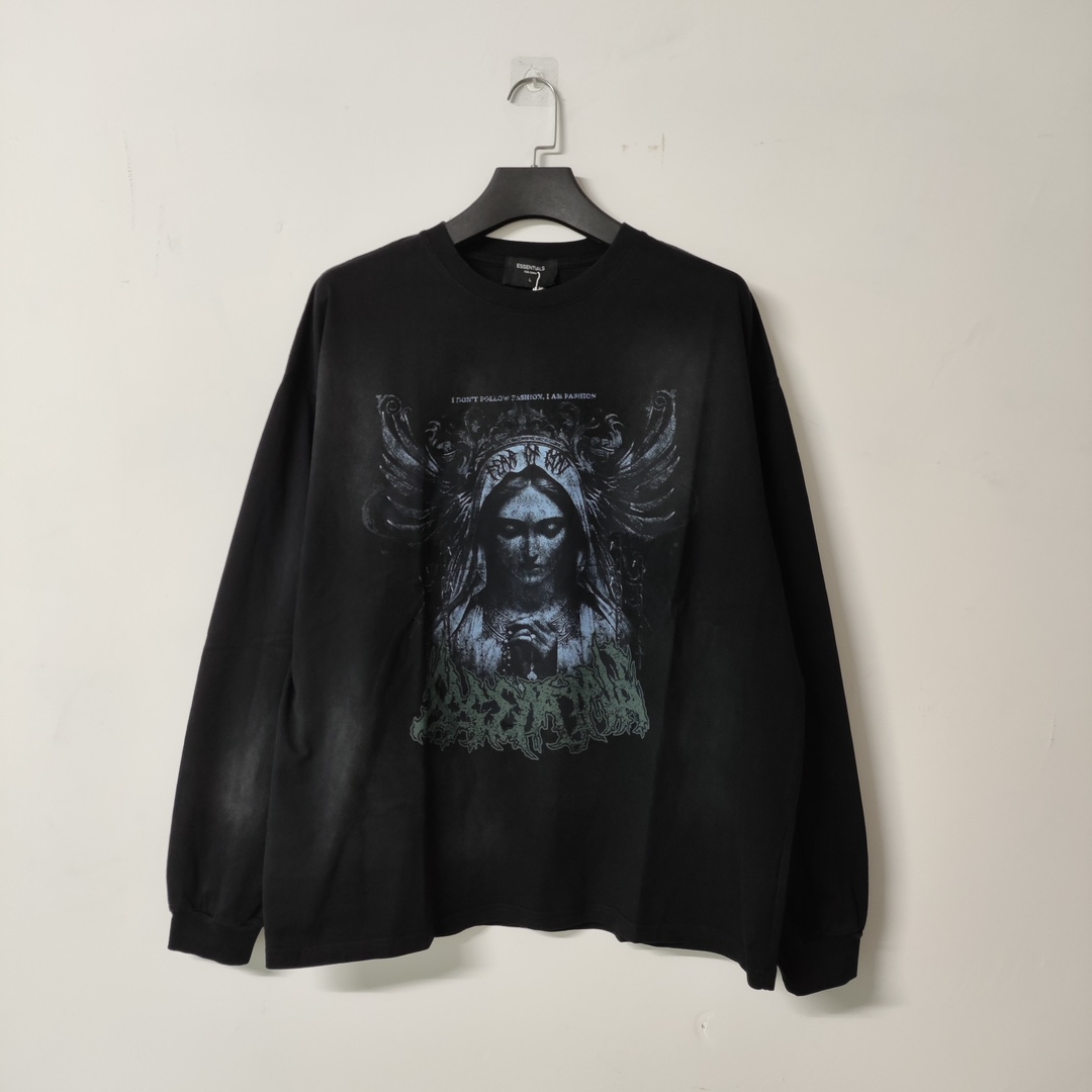 This Essentials Fear of Dog long sleeve t-shirt is a unique blend of vintage aesthetics and modern streetwear sensibilities. The garment features a distinctive gothic-inspired graphic, making it a standout piece for anyone looking to add an edge to their wardrobe.