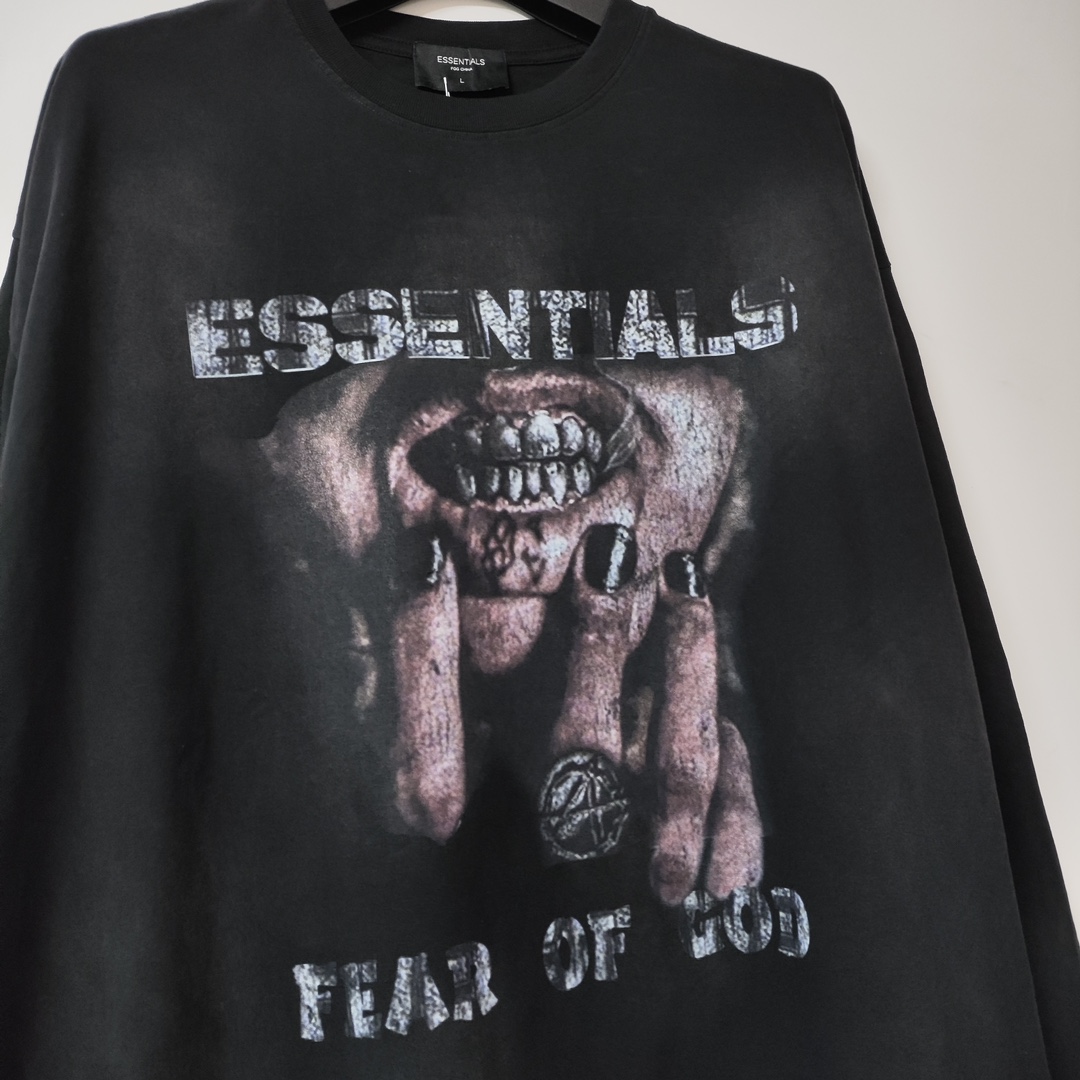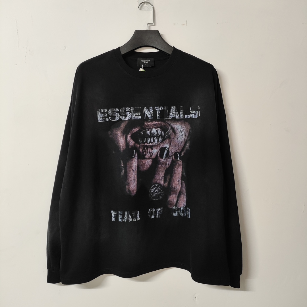 Introducing the Essentials Fear of God vintage black long-sleeve T-shirt, a blend of comfort and edgy style for your wardrobe.