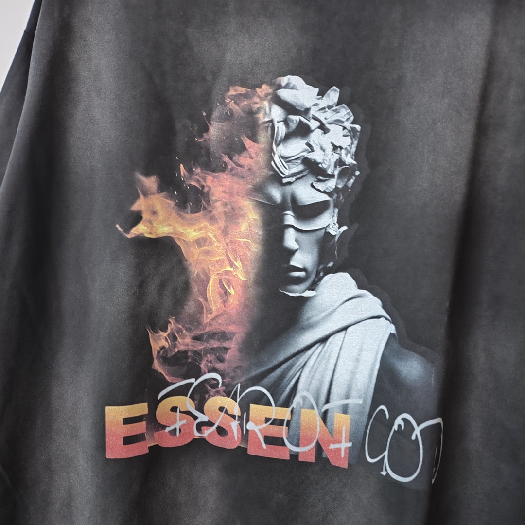 This vintage-washed black long sleeve T-shirt combines comfort with a unique streetwear edge. Its eye-catching flame statue print sets it apart, making it a standout piece for any casual wardrobe.