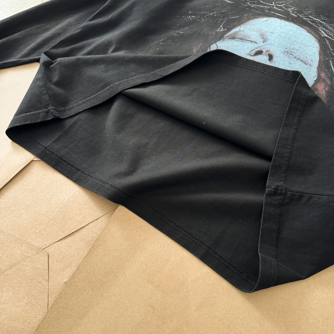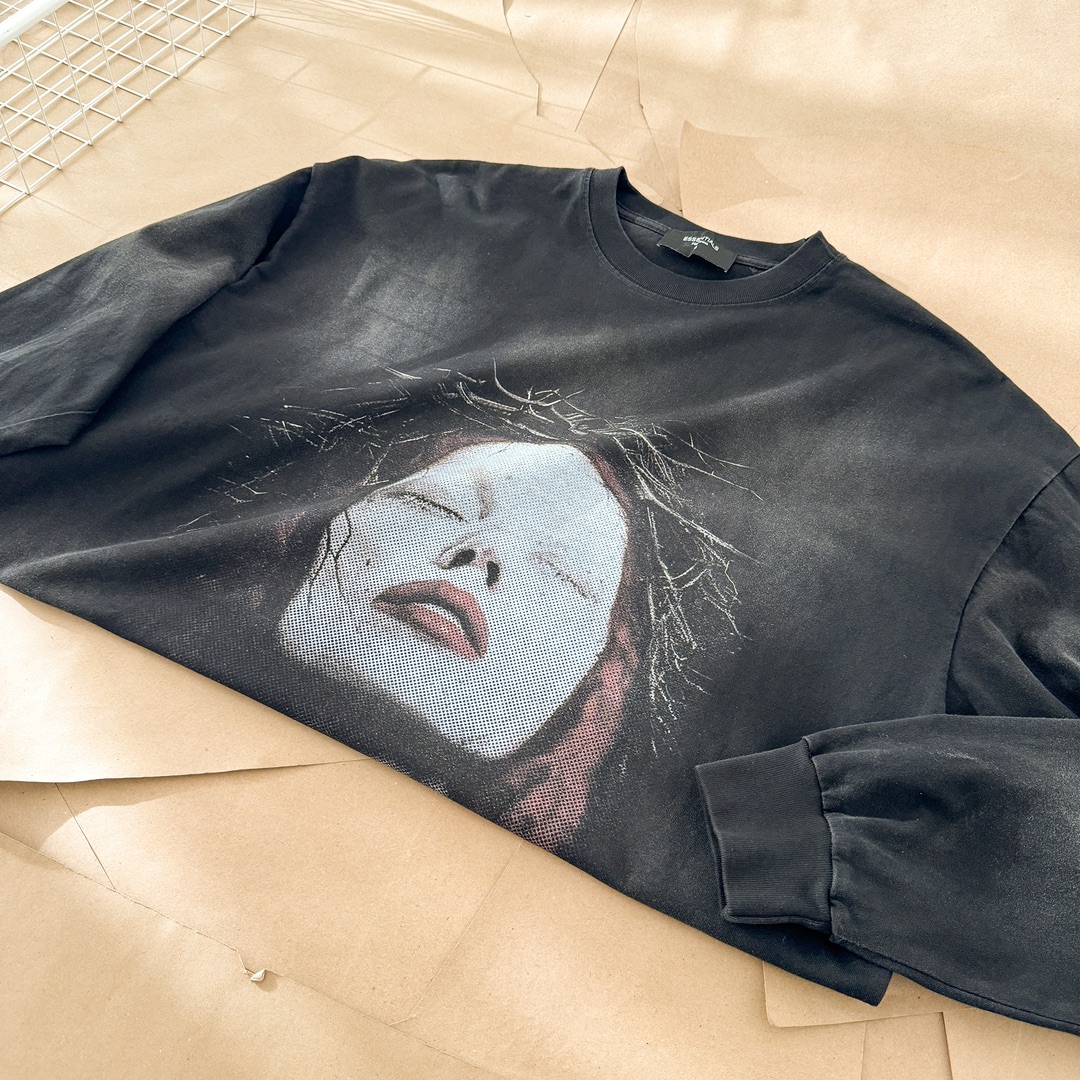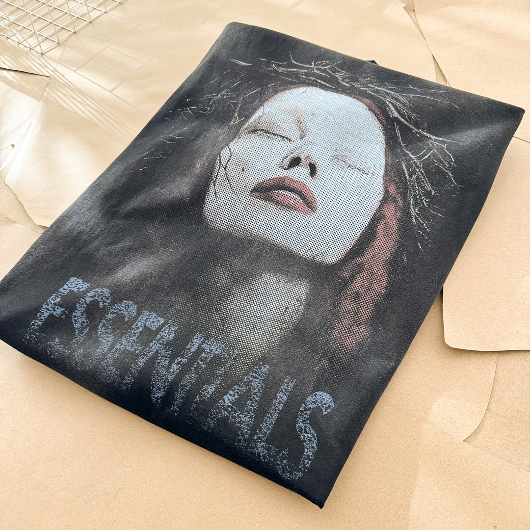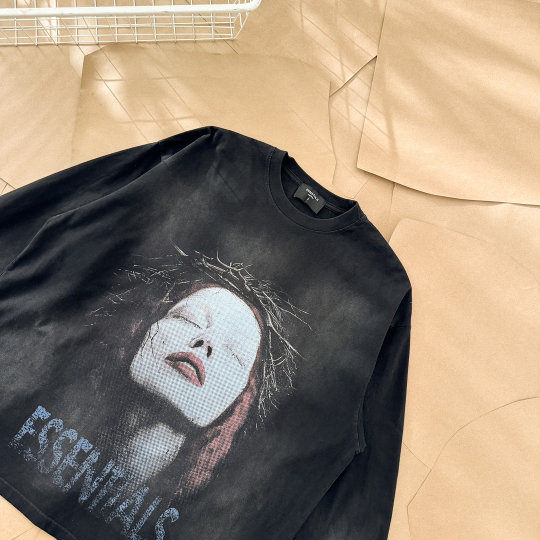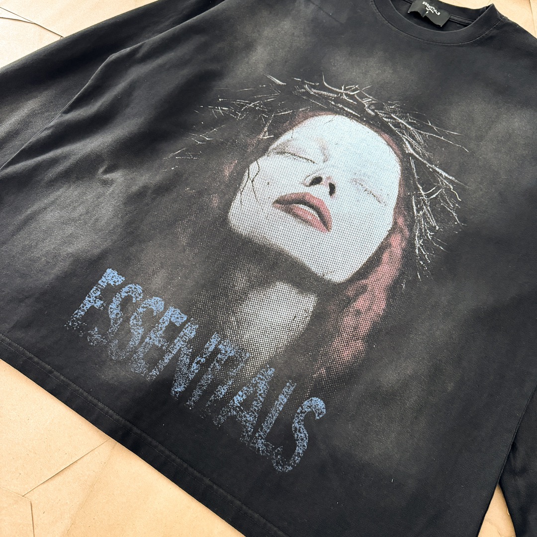 Elevate your style with this Fear of God Essentials long sleeve tee. Features a unique 'Sleeping Goddess' graphic and a washed black finish.