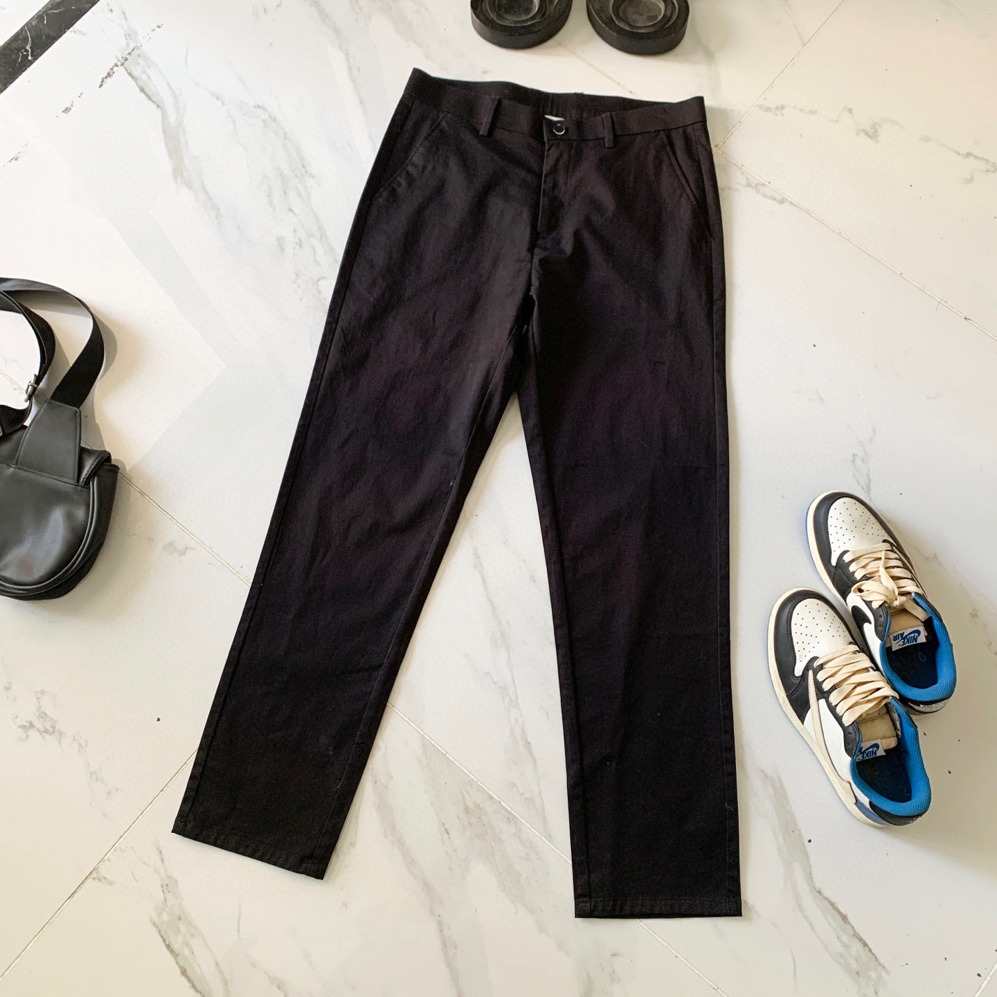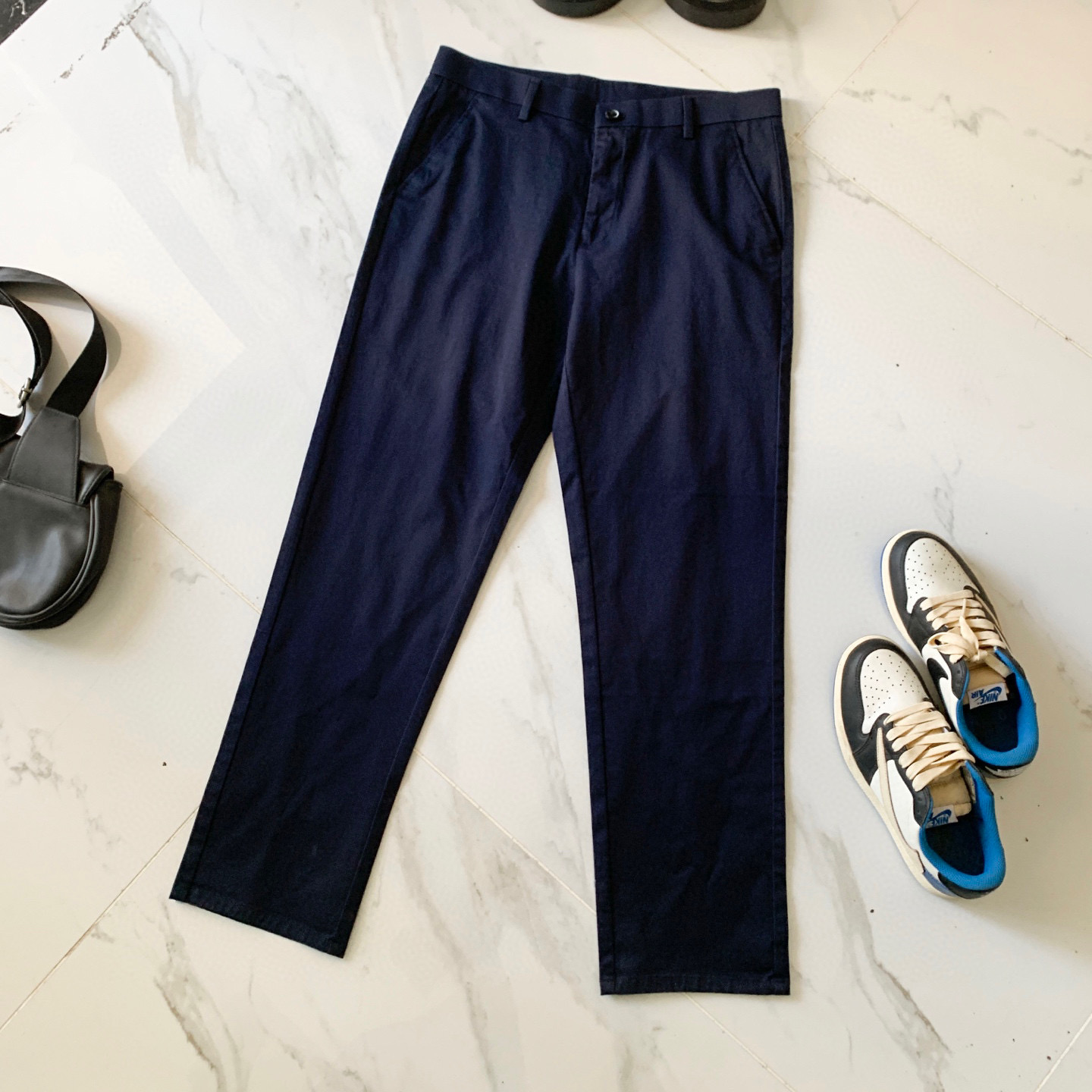 - Closure: Button and zipper fly