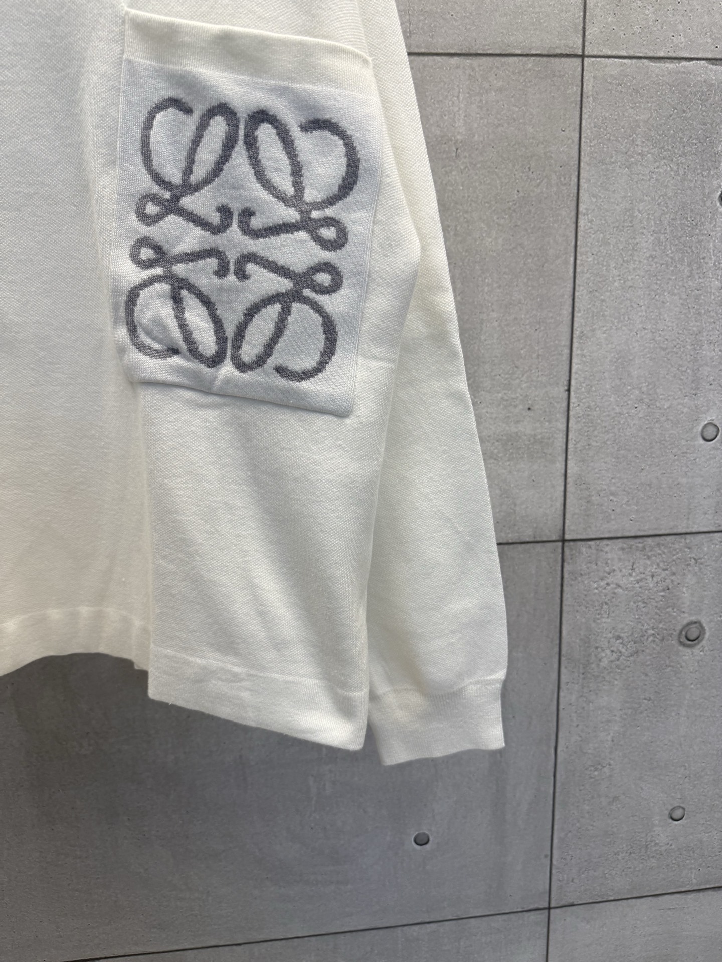 Elevate your style with this Loewe 23FW knit sweater. Features a jacquard pocket, relaxed fit, and crafted with a blend of viscose, cotton, nylon and spandex.