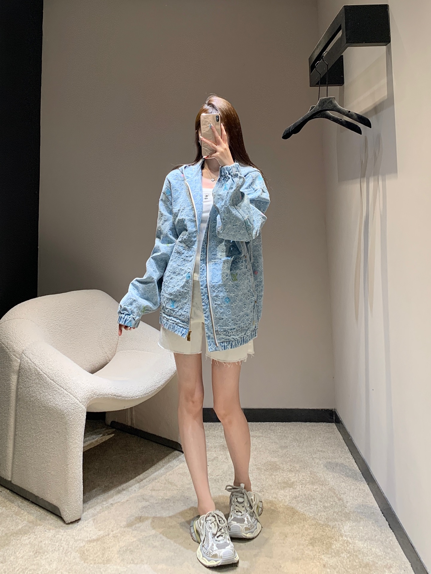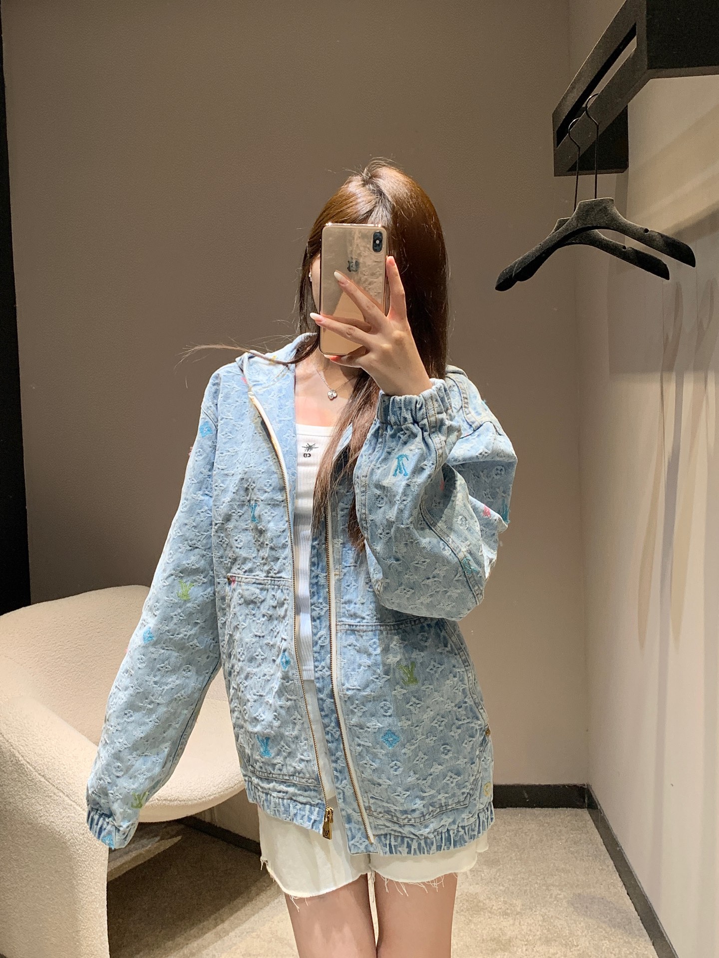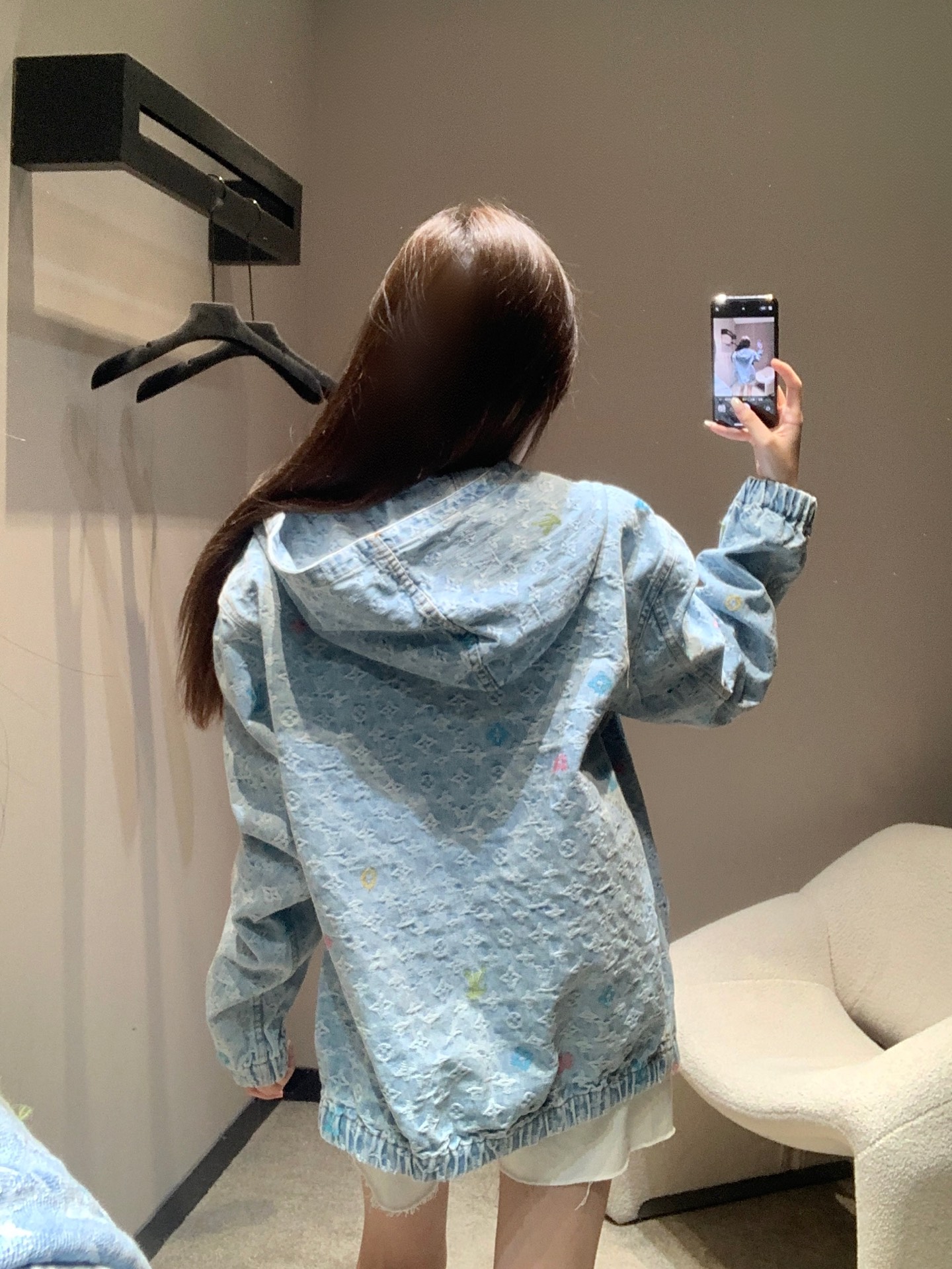 Elevate your style with this Louis Vuitton denim jacket.Features a light blue jacquard pattern, hooded design, and zip closure. Perfect for a fresh, trendy look.