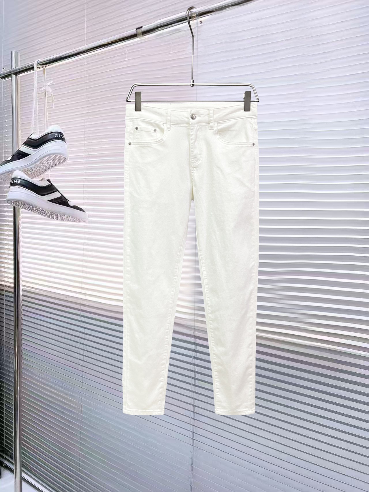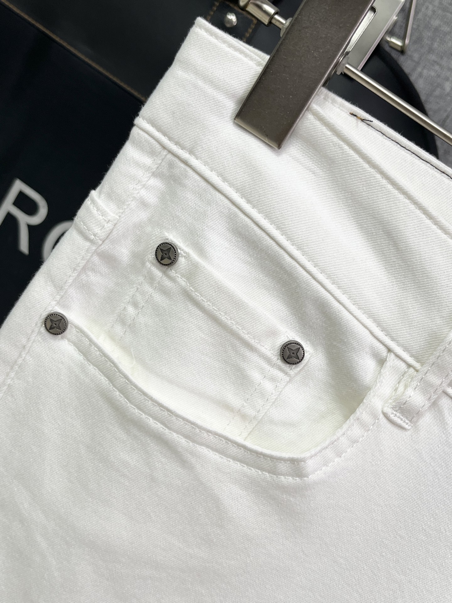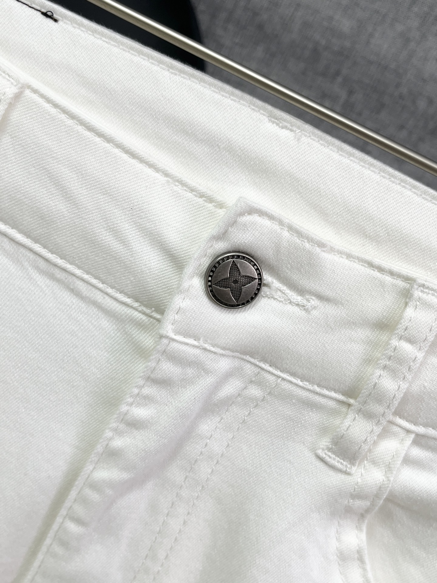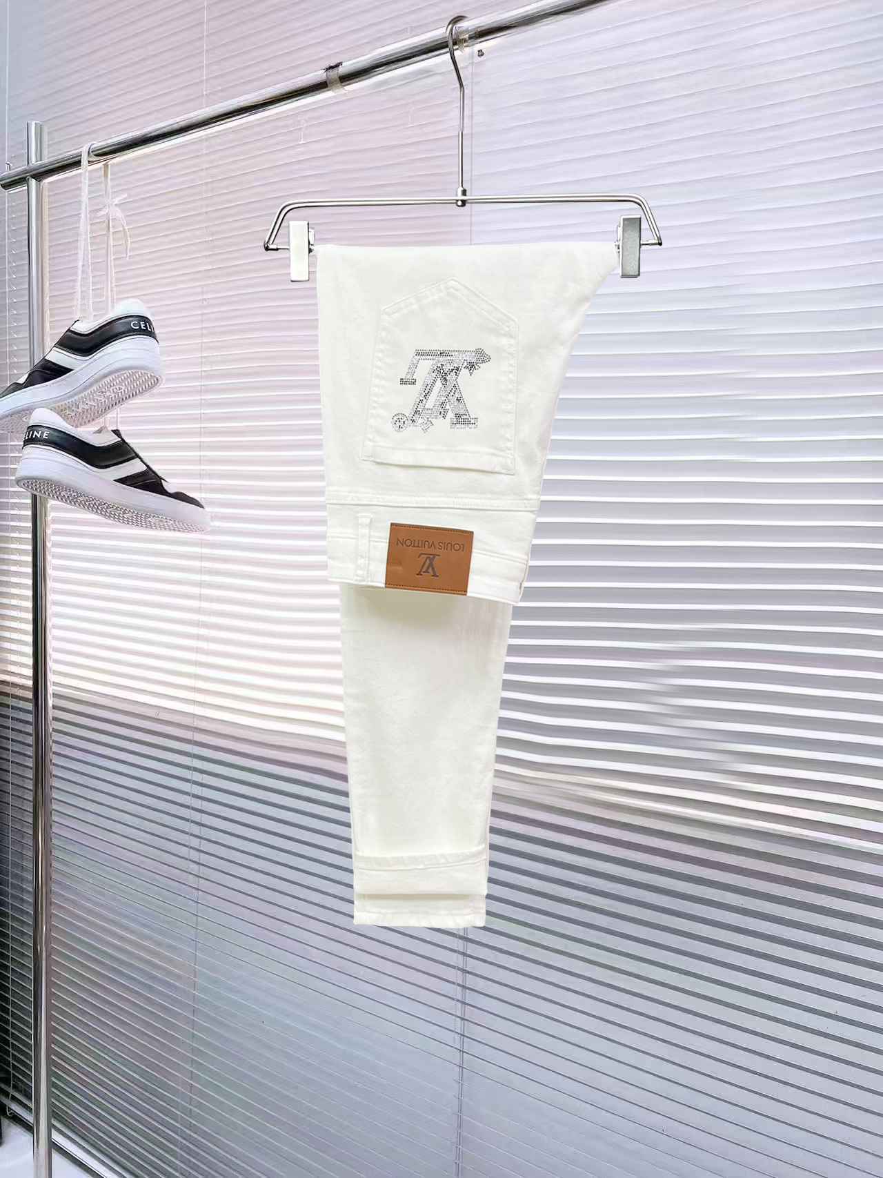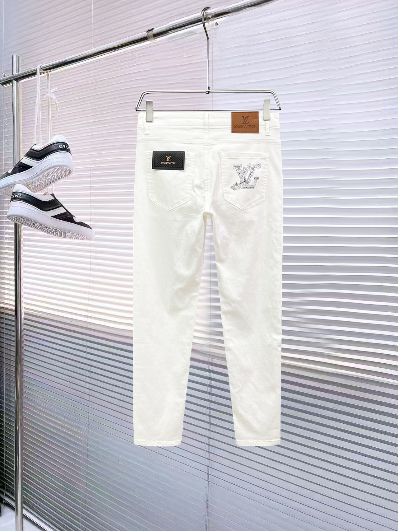 Louis Vuitton Men's White Casual Pants With LV Rhinestone Logo Design