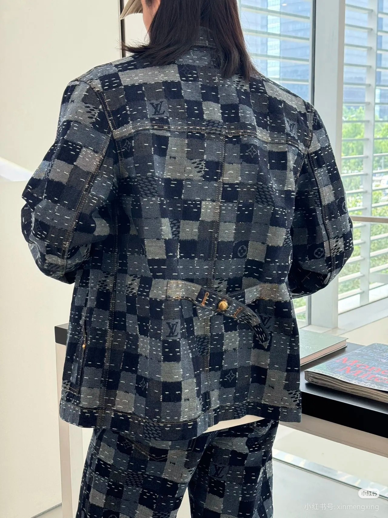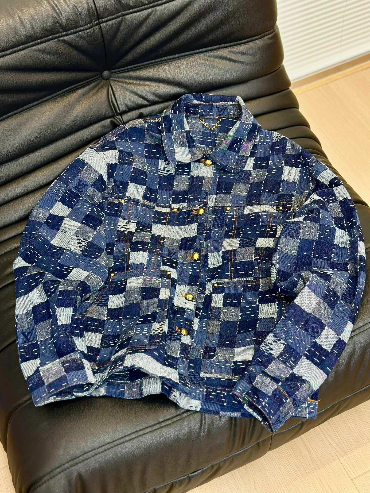 Elevate your style with the Louis Vuitton x Nigo denim jacket. Features a unique Damier pattern and gold button closures.
