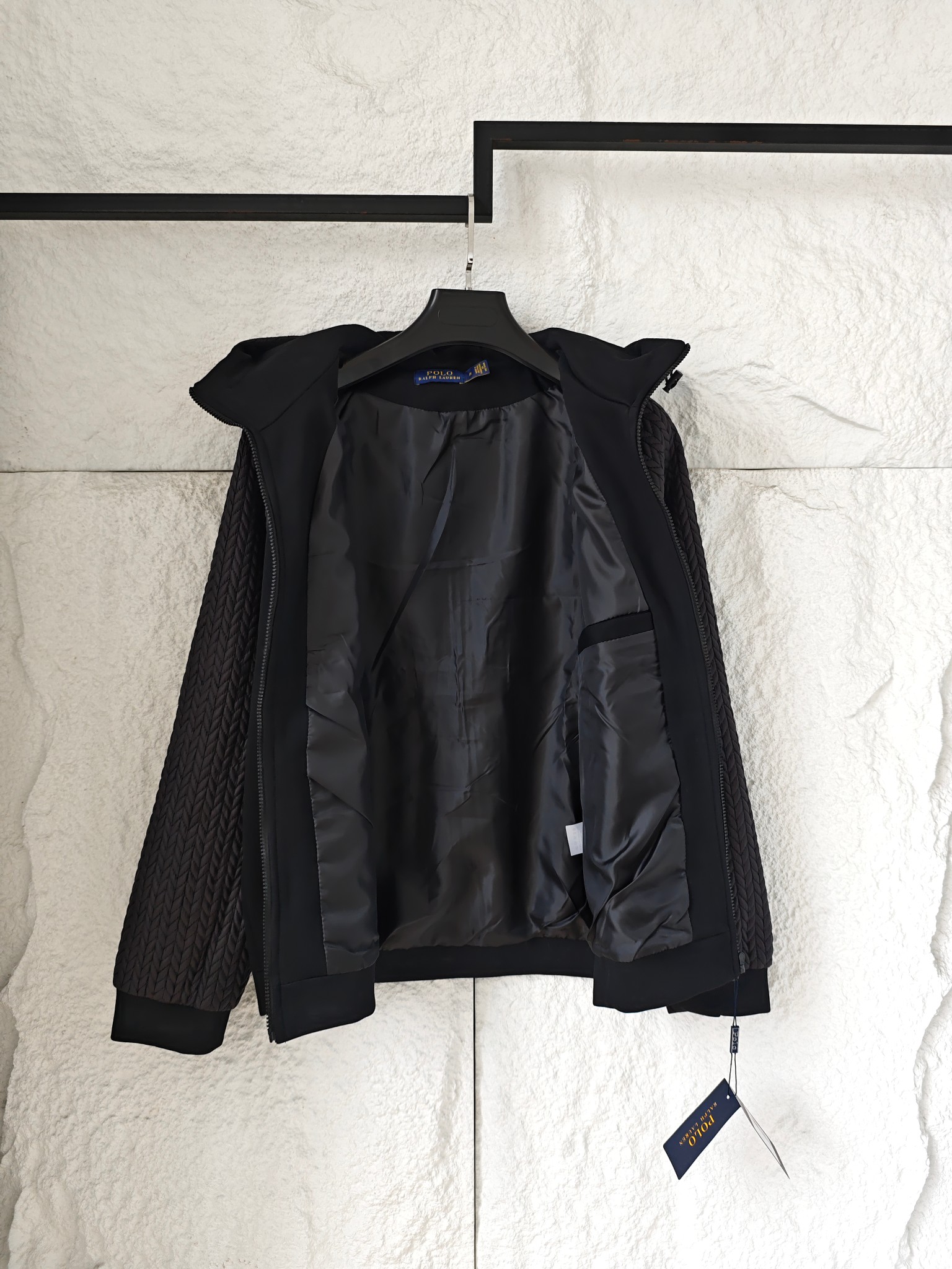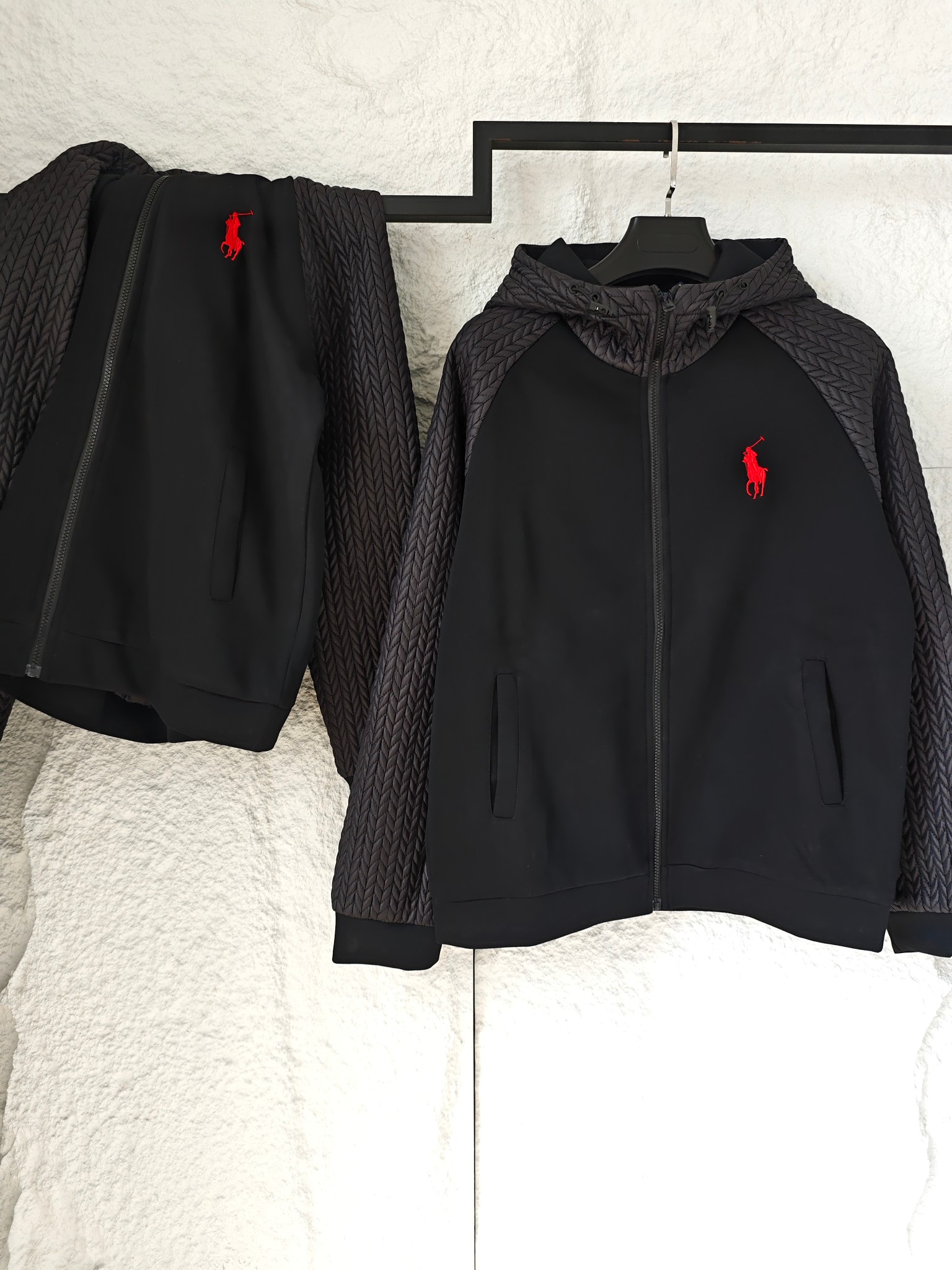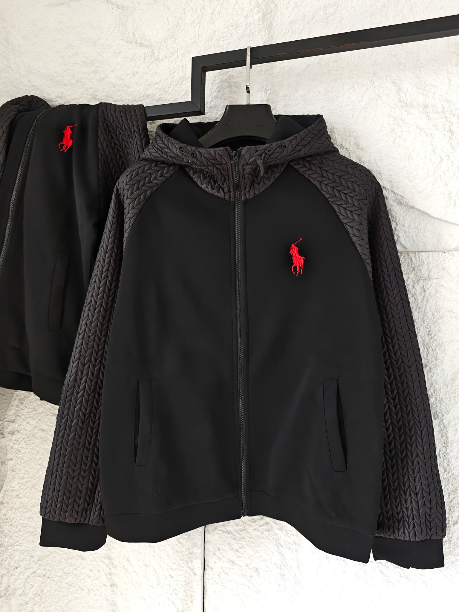 Ralph Lauren Men's Black Full-Zip Knit Sleeve Hoodie Jacket with Red Logo