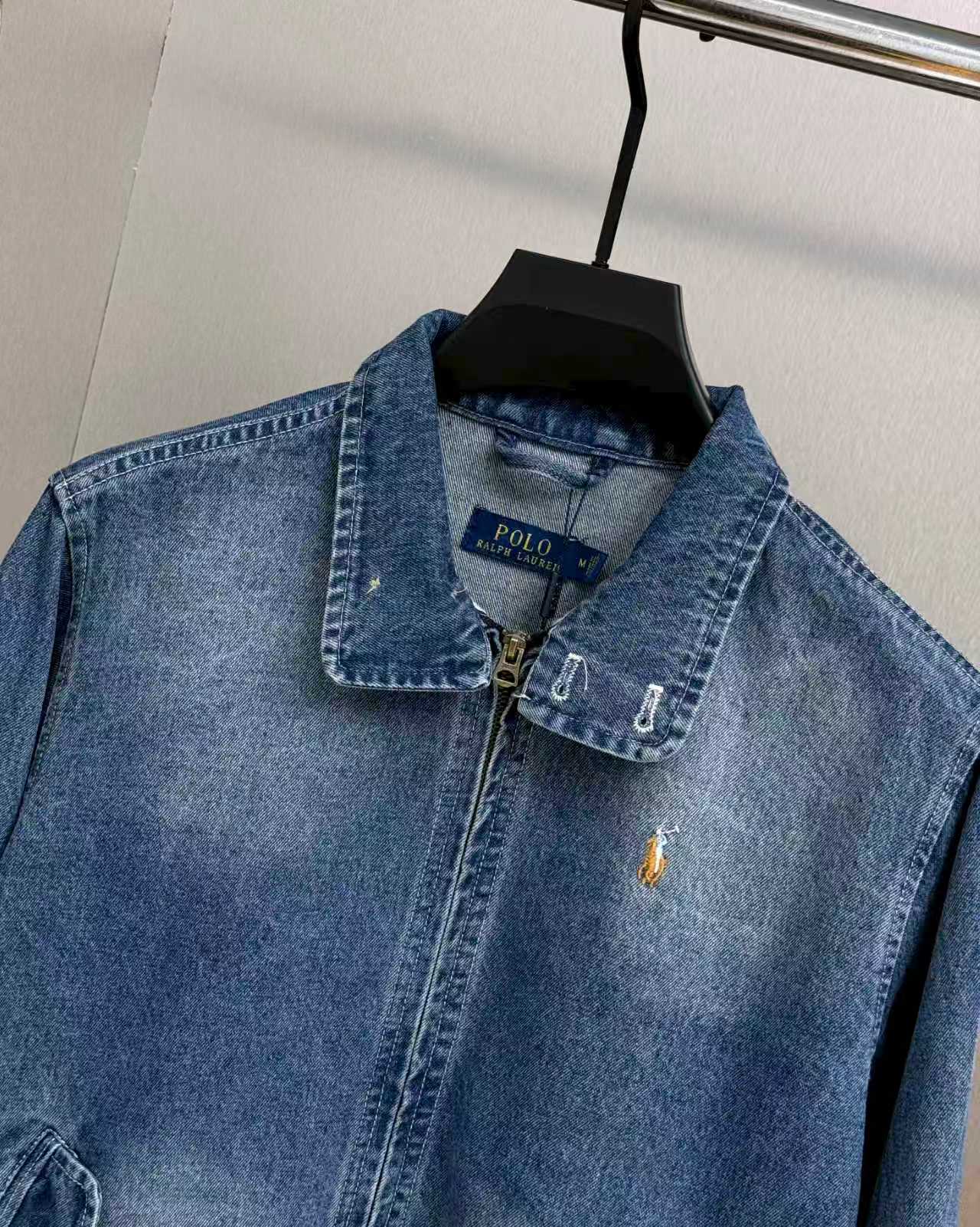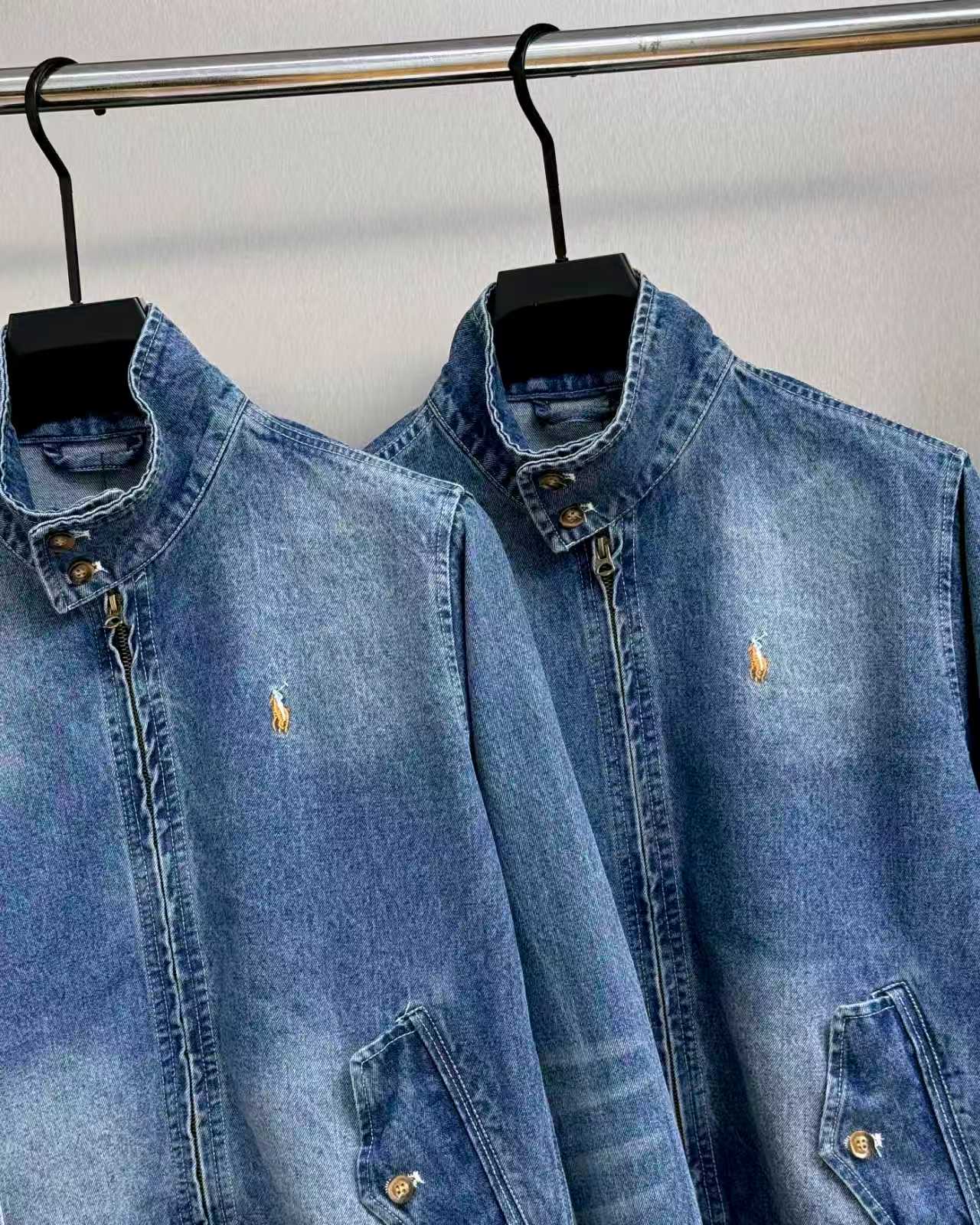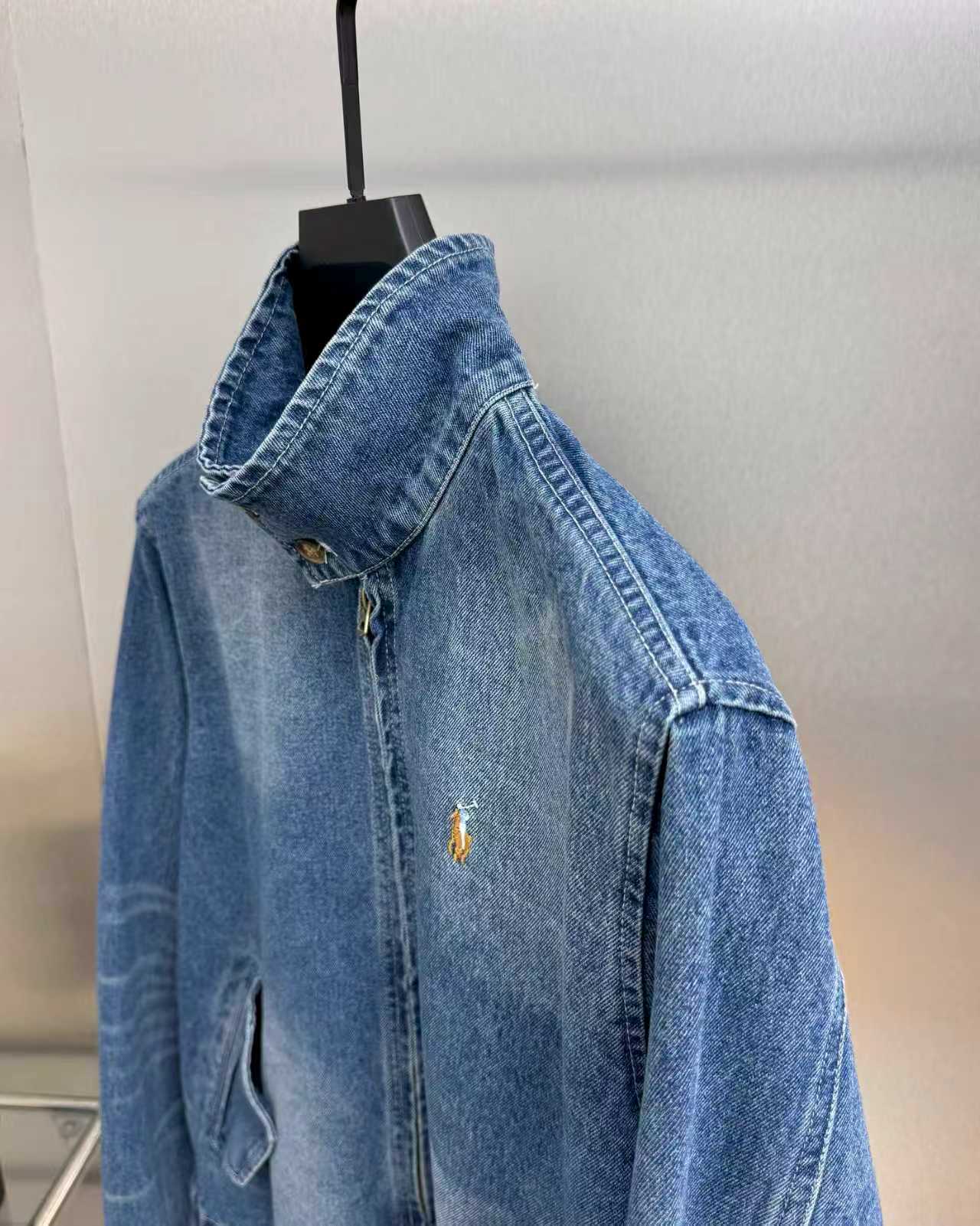 Elevate your style with this Ralph Lauren denim jacket. Features a relaxed fit, stand collar, full-zip closure, and washed blue finish.Perfect for a casual yet stylish look.