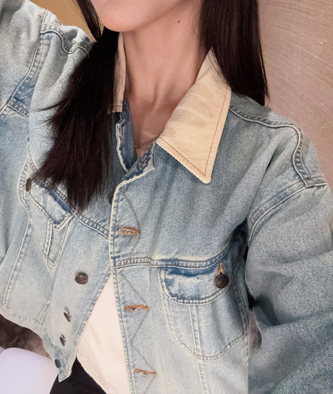 Elevate your style with this vintage-inspired denim jacket. Features a corduroy collar, button-down closure, and a comfortable loose fit.