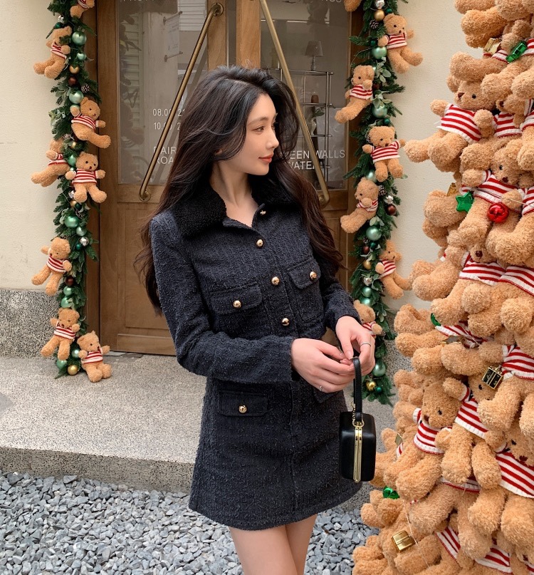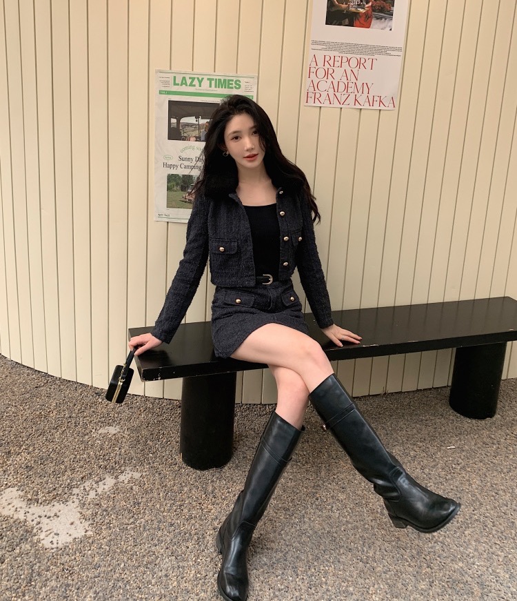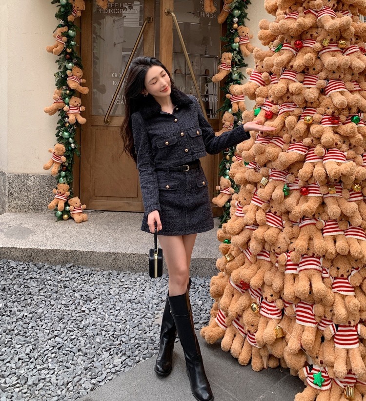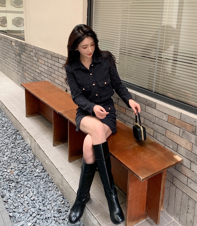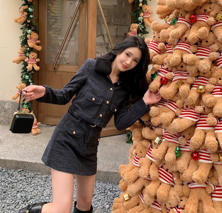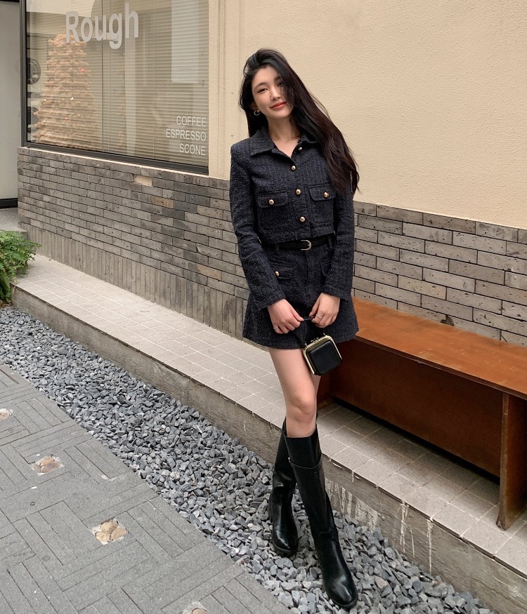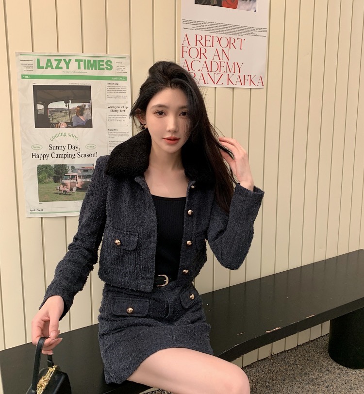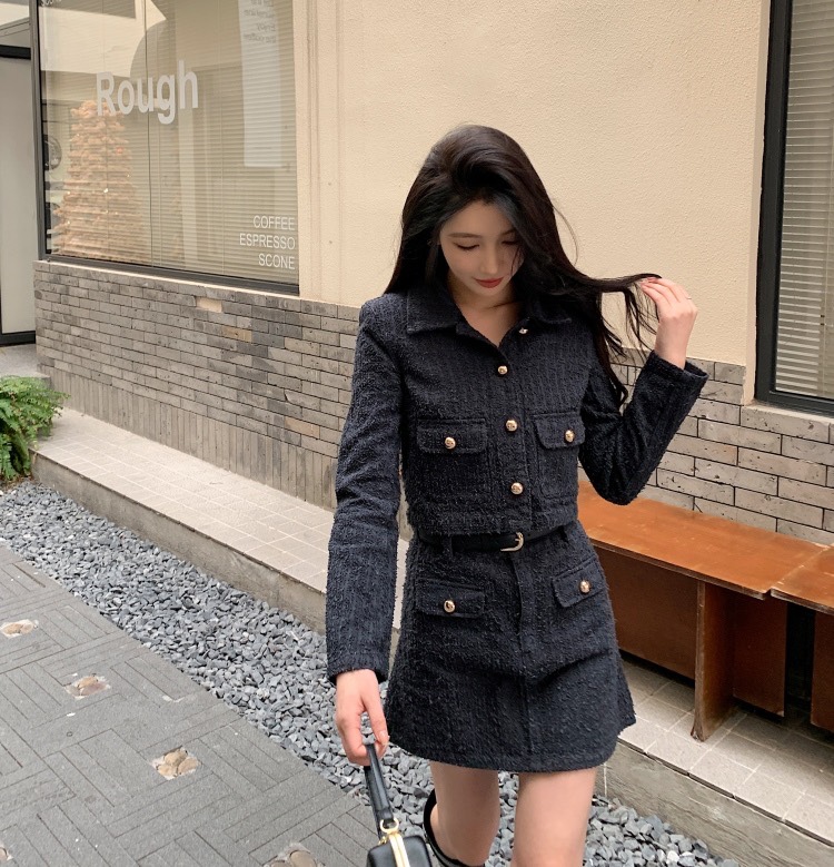This black denim jacket and skirt set offers high-end style with its unique design and quality craftsmanship.