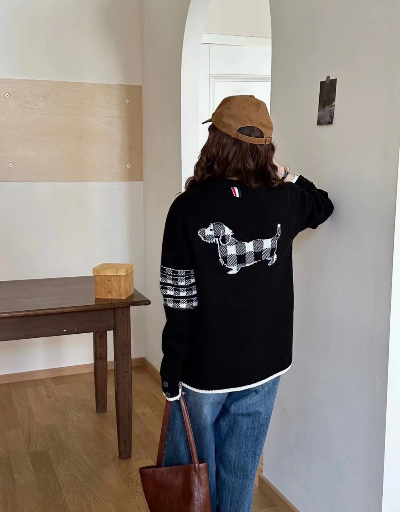 This Thom Browne cardigan is a stylish and comfortable garment perfect for layering. It features the brand's signature four-bar stripes, a unique plaid Corgi design, and is made from a high-quality wool blend.