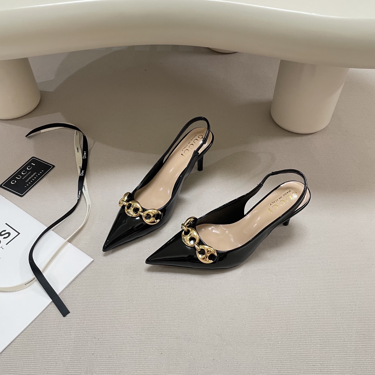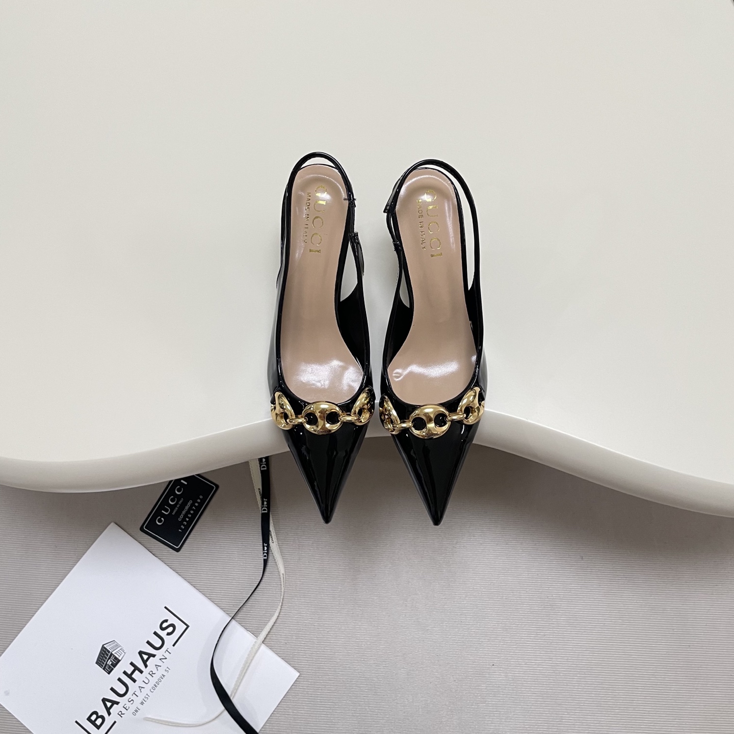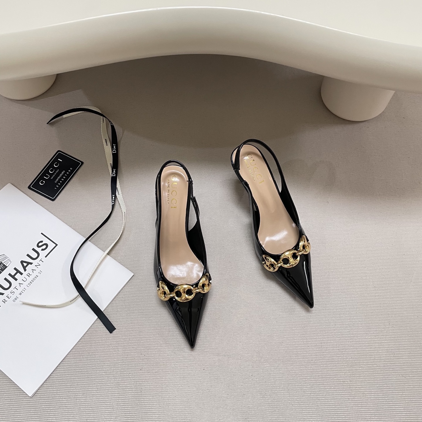 These Gucci kitten heels are crafted from luxurious black patent leather, these slingbacks exude sophistication and style. Made in Italy, they showcase the brand's commitment to quality and design.