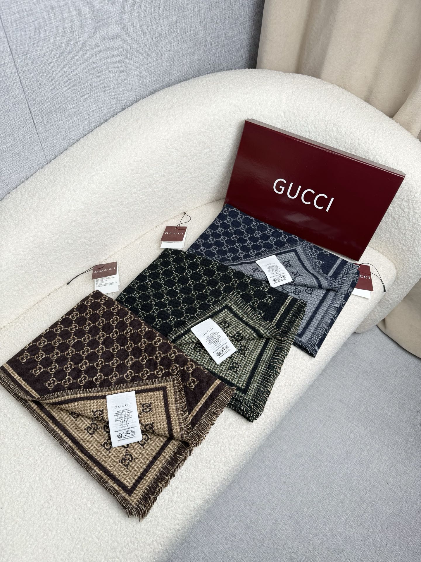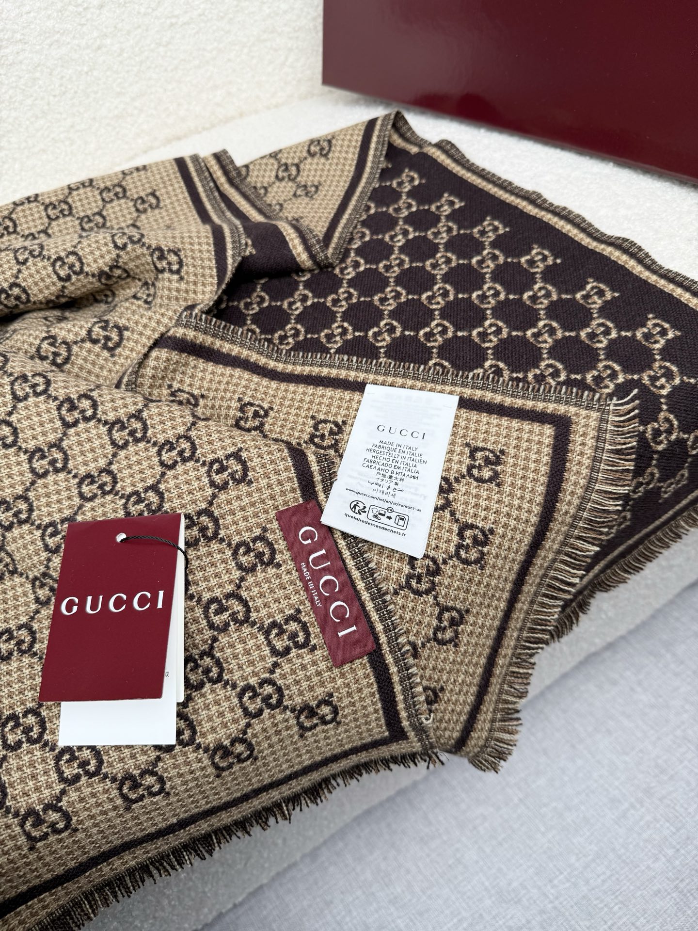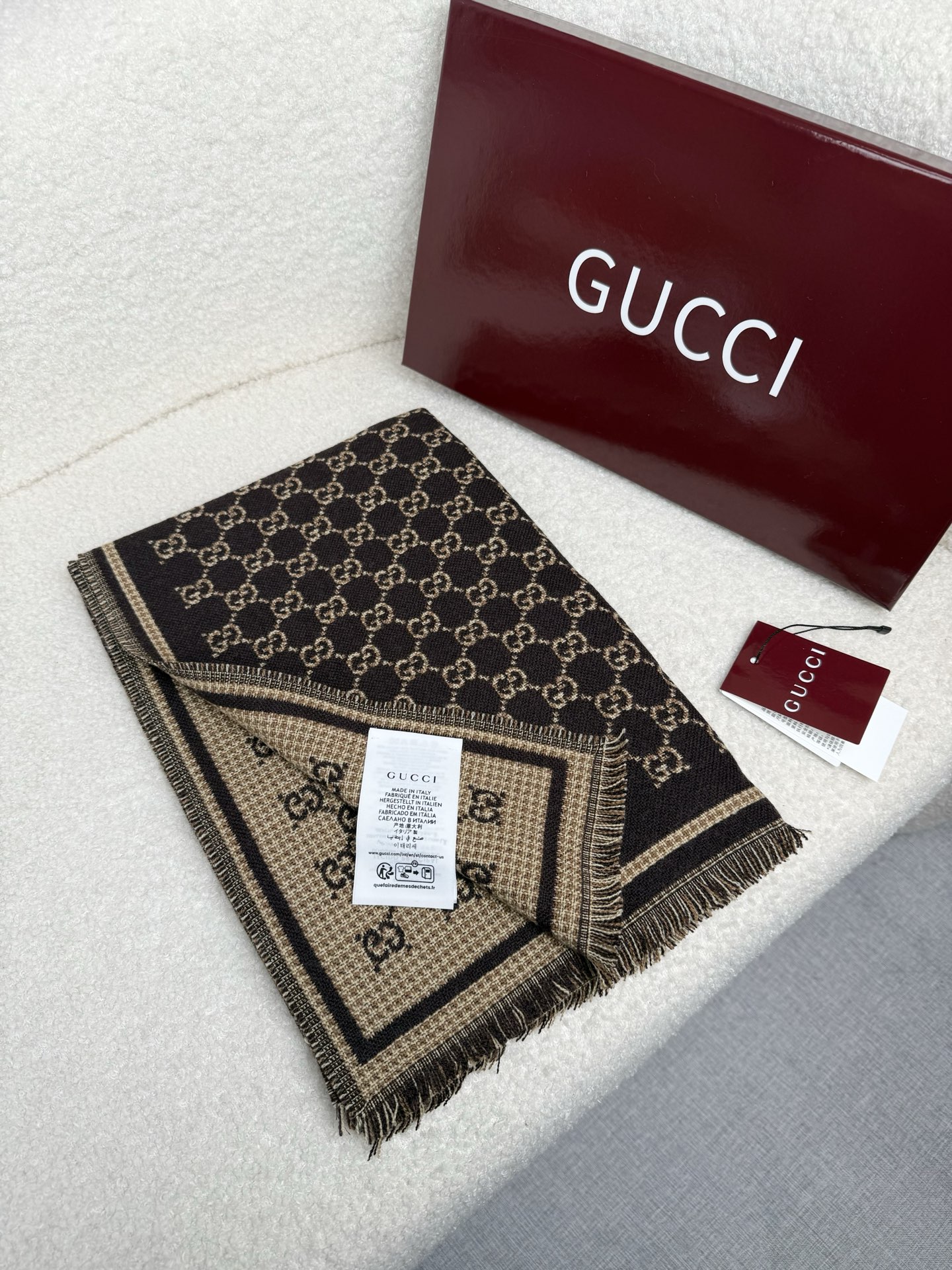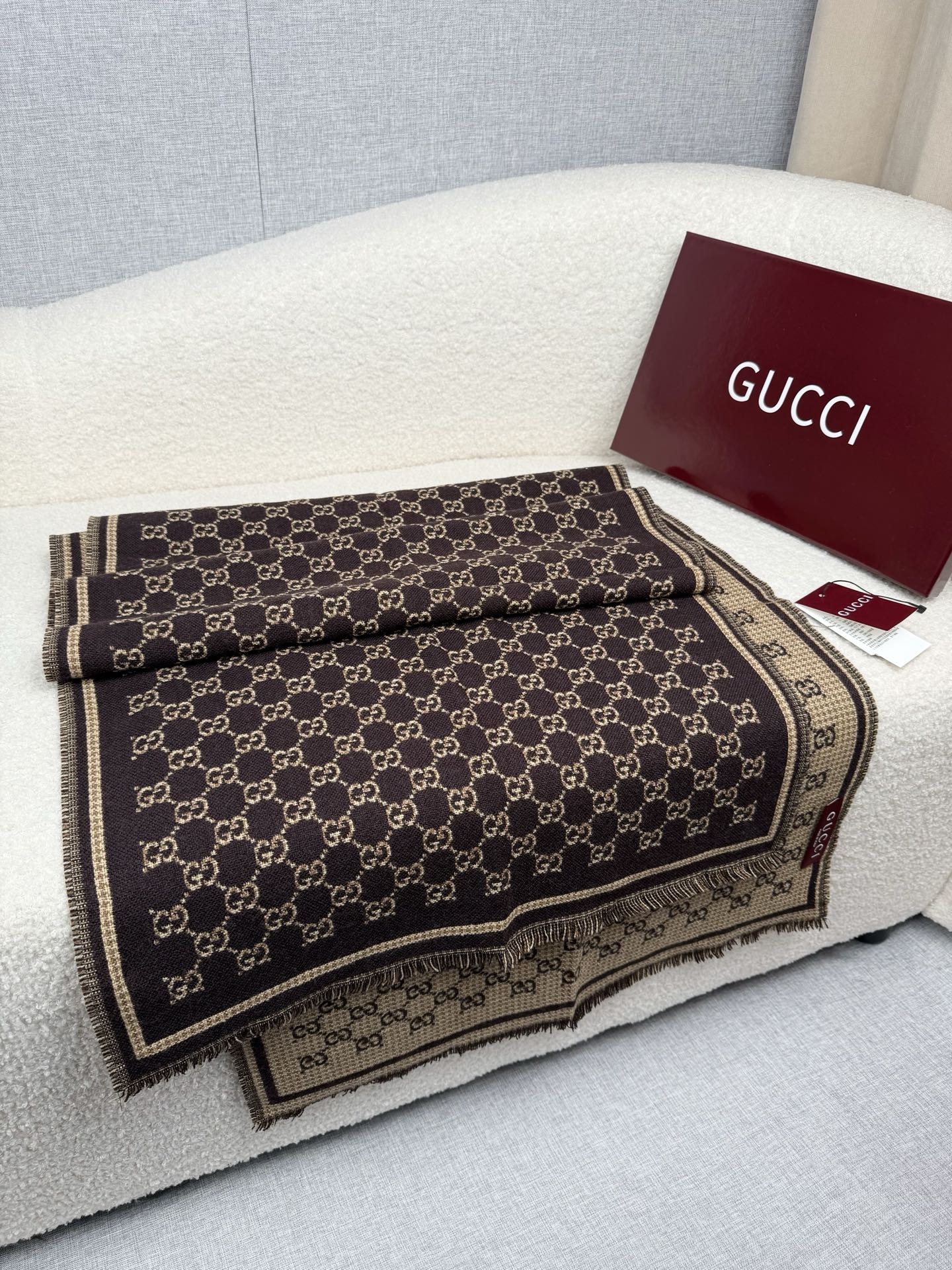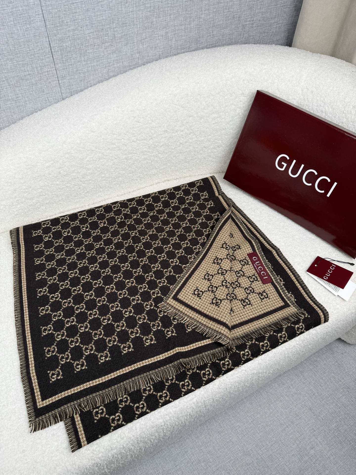 Elevate your style with this Gucci wool scarf. Features a signature GG pattern, reversible design, soft and warm wool, perfect as a shawl or wrap.