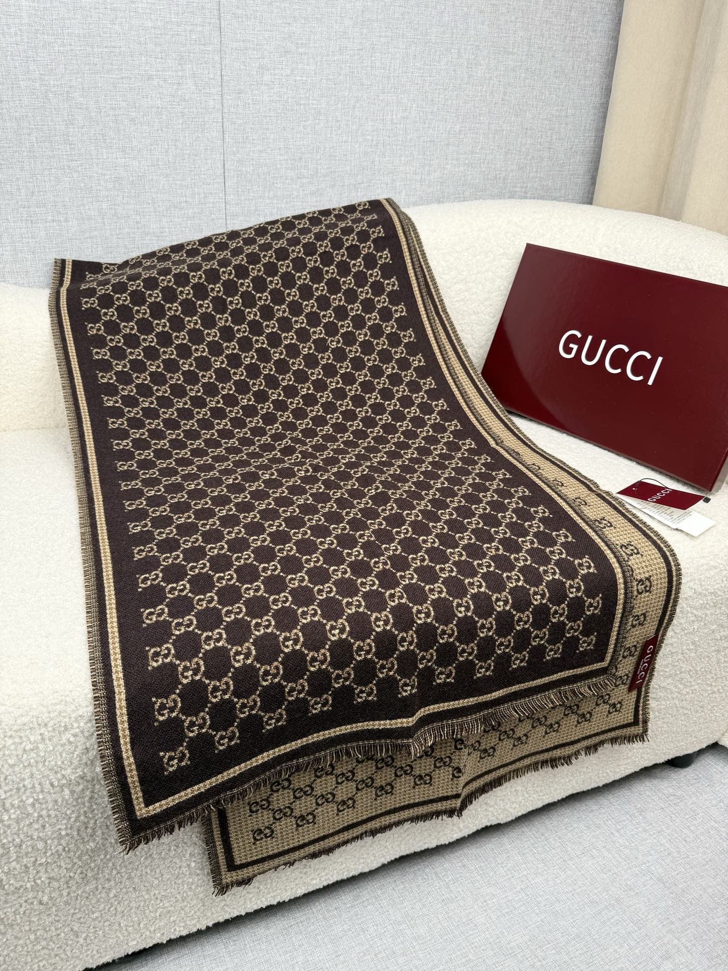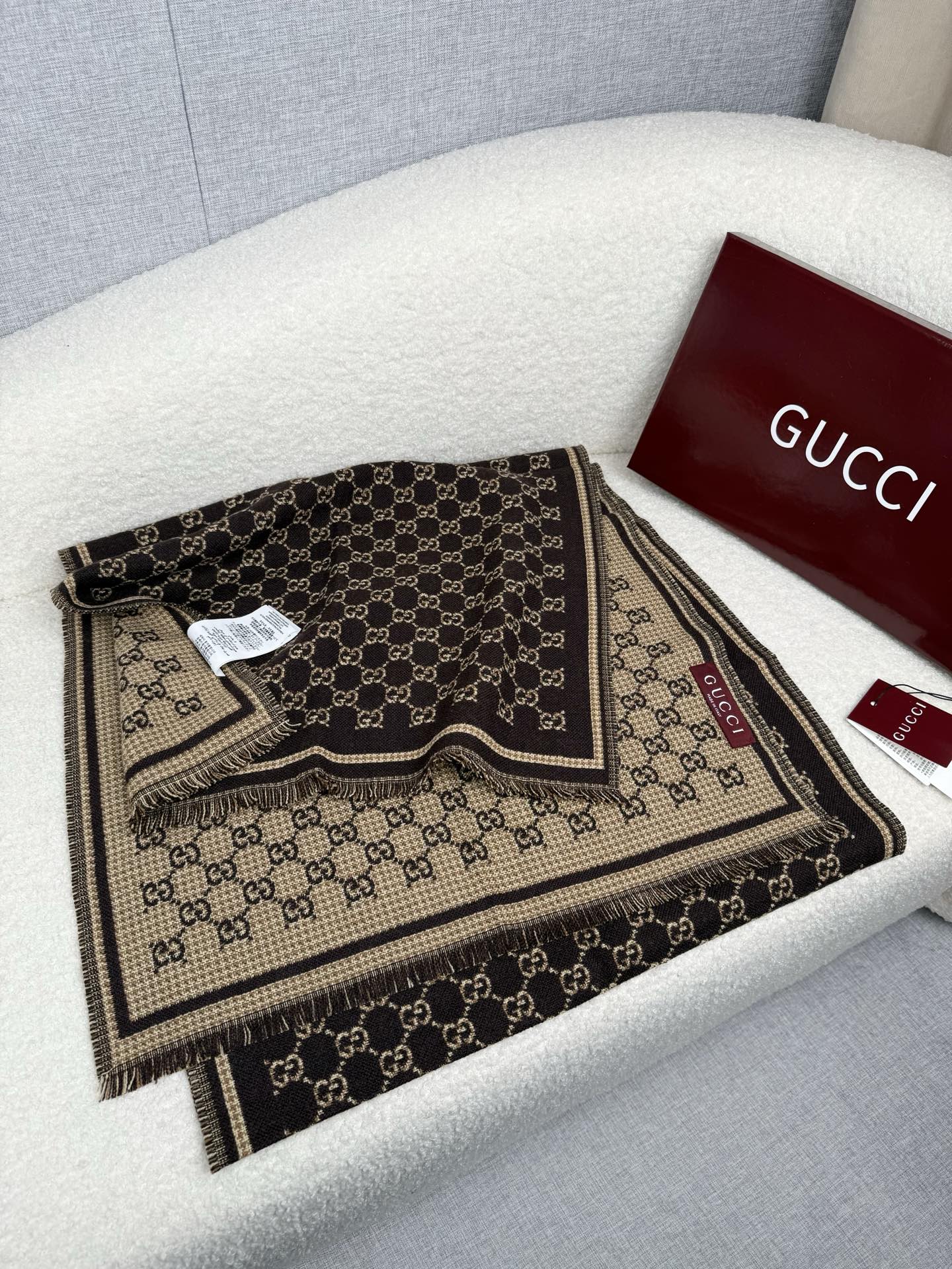 This exquisite Gucci wool scarf is a timeless accessory that combines luxury and functionality. Crafted from 100% new wool, this scarf offers exceptional warmth and a soft touch, making it perfect for cooler seasons.