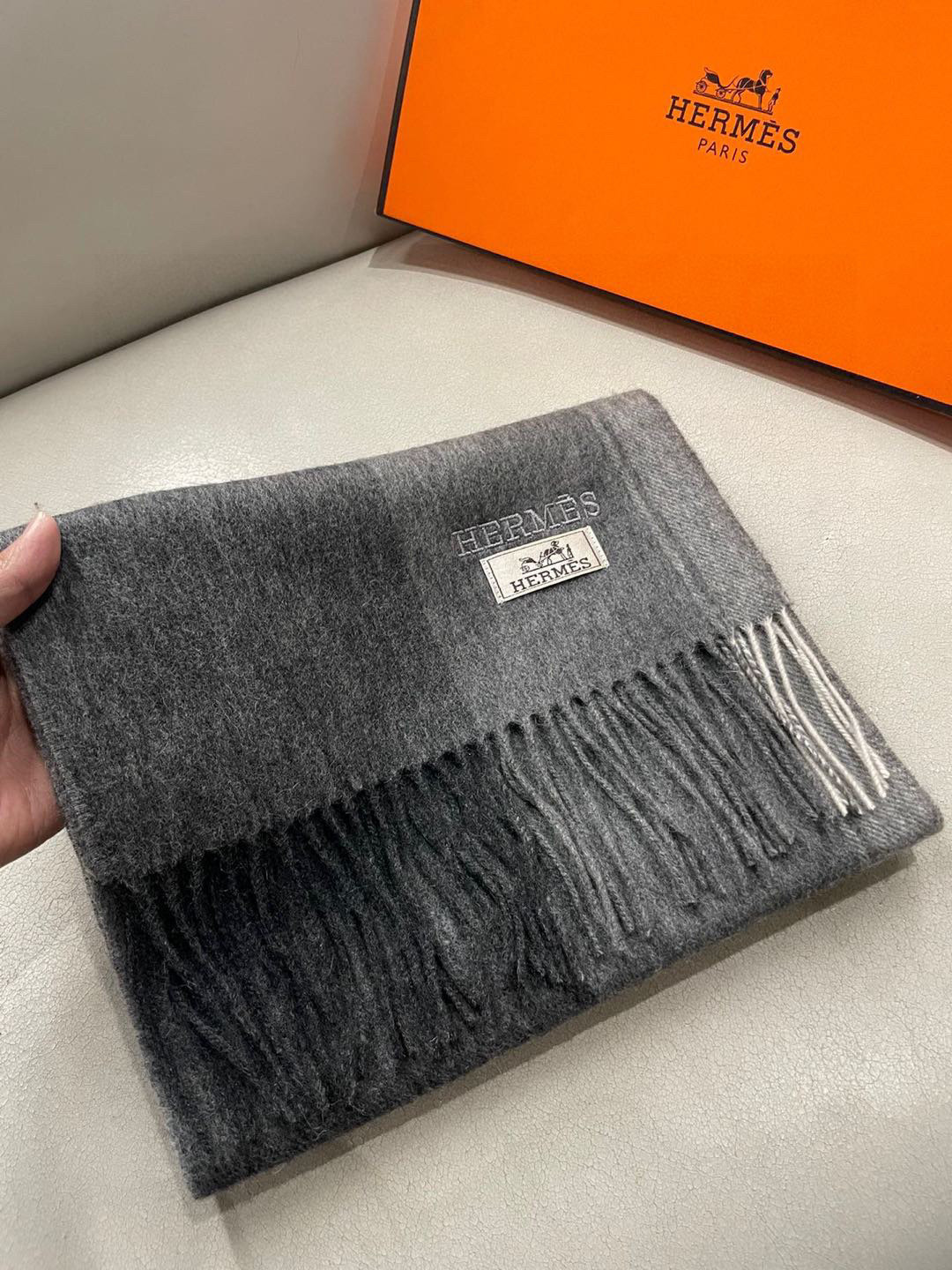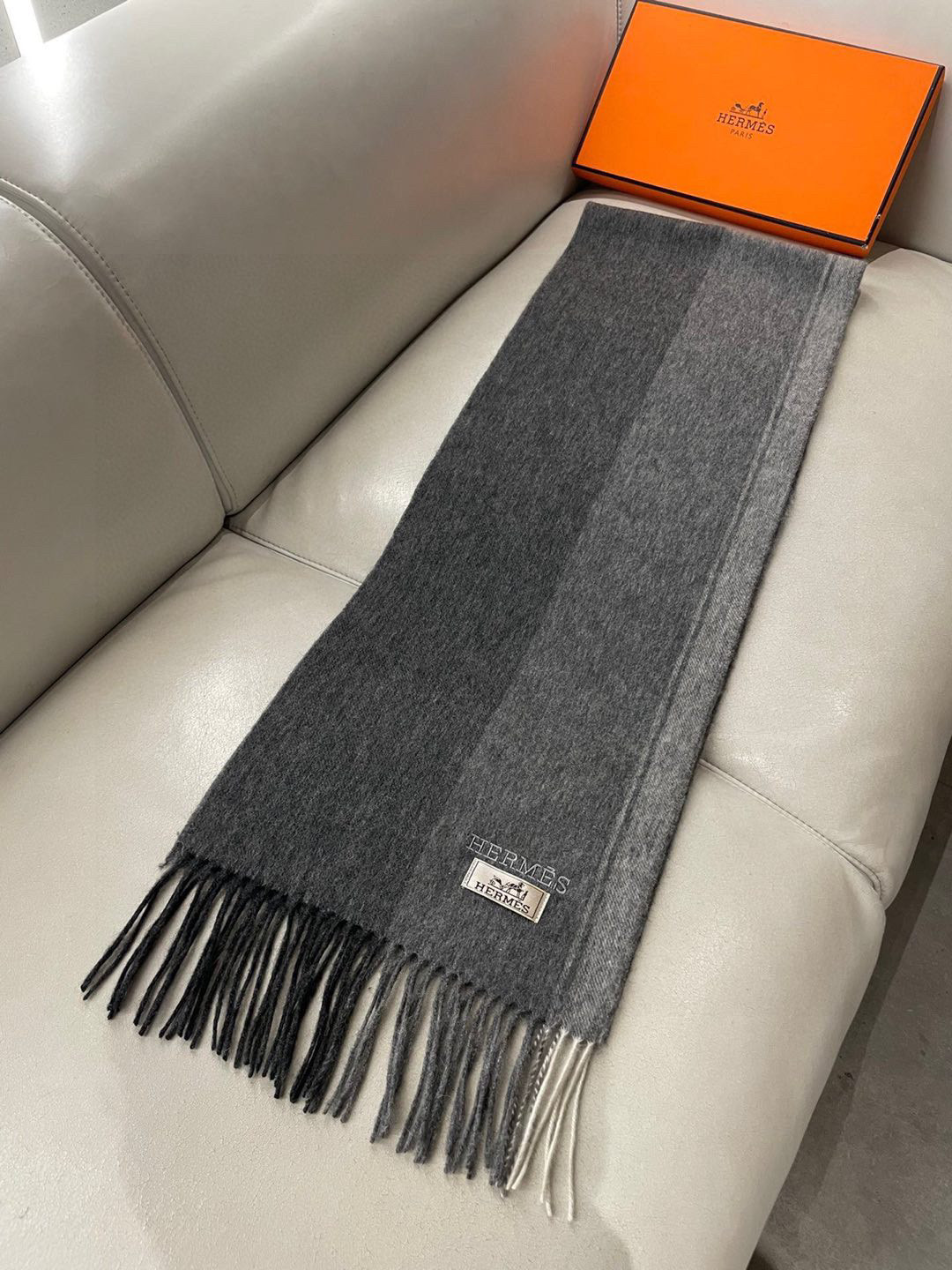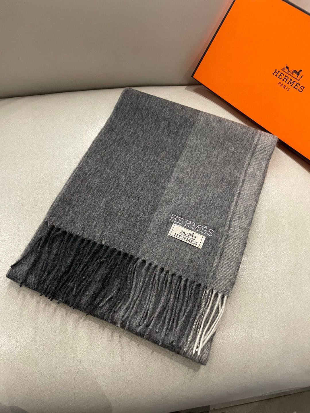 Hermès Gray Cashmere Scarf with Fringed Edges - 180 x 30 cm